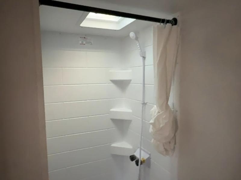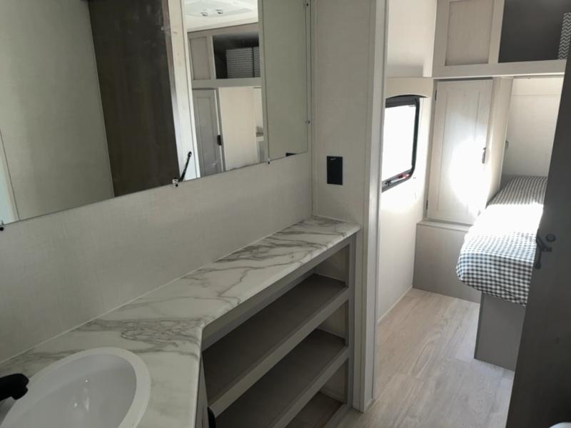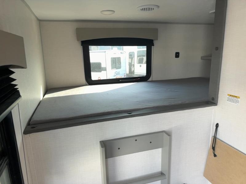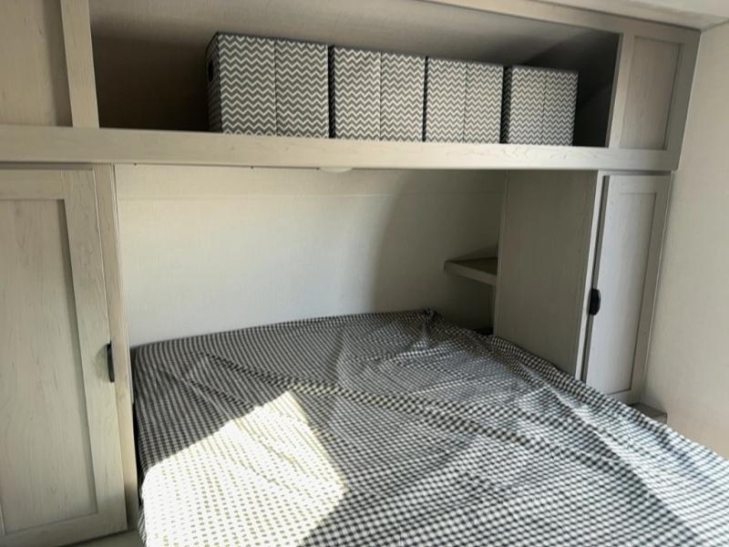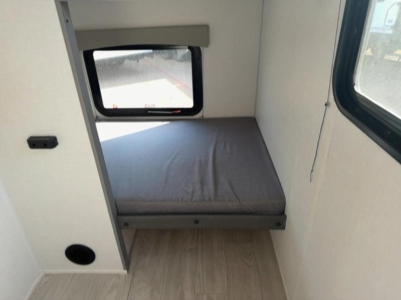 At the front of the trailer, a private bedroom welcomes you with a comfortable 60" x 80" queen bed for a restful night’s sleep, along with wardrobes on each side and an overhead shelf for organized storage. A convenient entry door provides direct access to this cozy space. Moving through the pass-through full bathroom, you’ll find storage beneath the countertop for toiletries and a 32" x 32" shower with a glass door, perfect for unwinding after a full day of adventure. At the center of the trailer, the main living area and kitchen create a spacious and functional hub, featuring a sofa and U-shaped dinette housed in a slide-out for plenty of seating space, while the fully equipped kitchen includes a sink with drying rack, a three-burner cooktop, and a 10 cu. ft. refrigerator so you can cook like a chef. Next to the second entry door, a walk-in pantry offers abundant space for dry goods and supplies. At the rear, two private bunk rooms each include a 38" x 72" bunk, dedicated storage, and a flip-up desk, ideal for work, study, or quiet time.