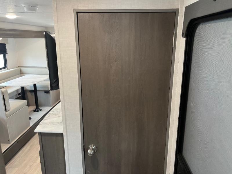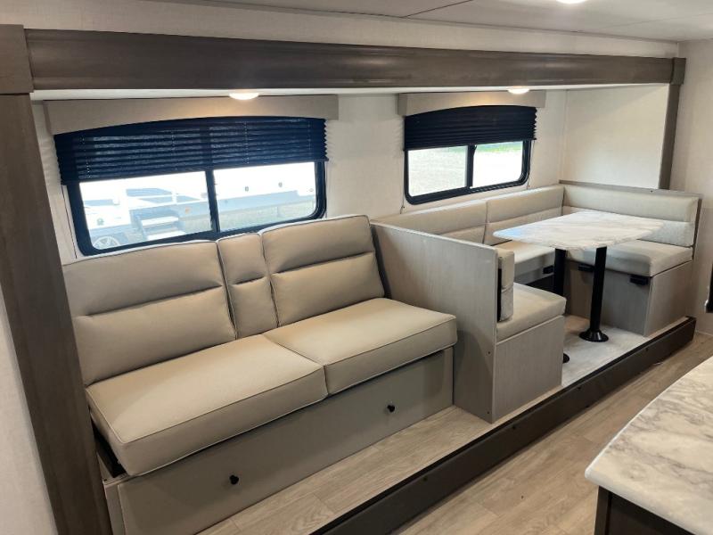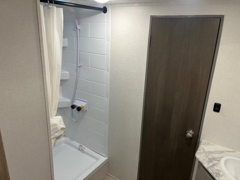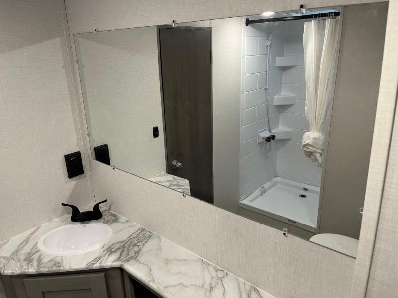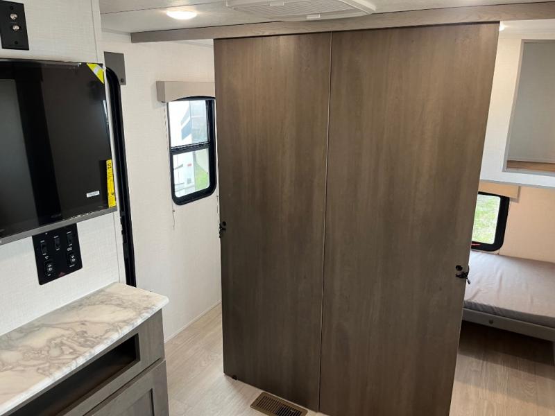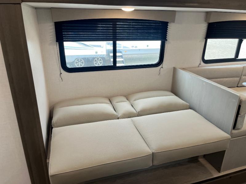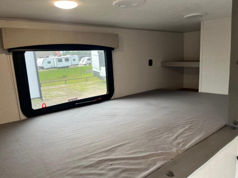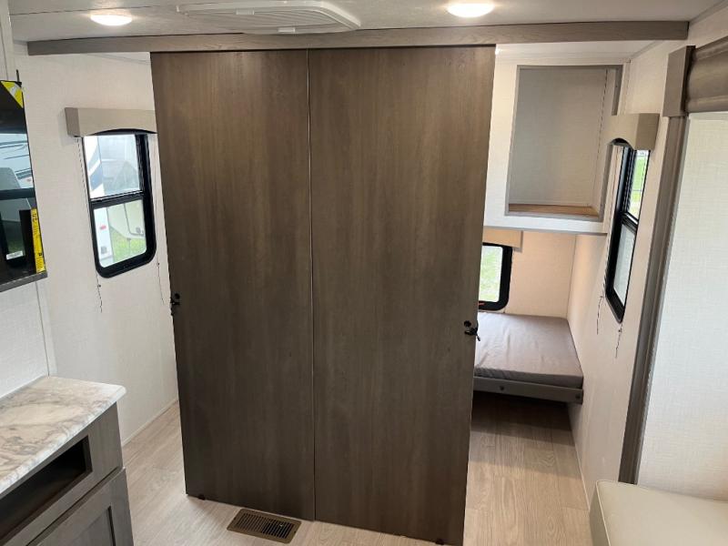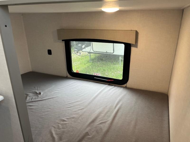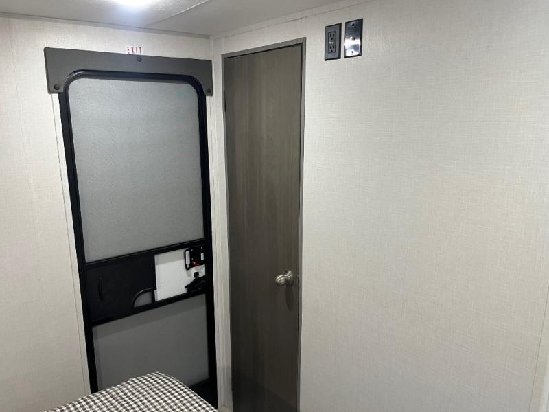 At the front of the trailer, a private bedroom welcomes you with a comfortable 60" x 80" queen bed for a restful night’s sleep, along with wardrobes on each side and an overhead shelf for organized storage. A convenient entry door provides direct access to this cozy space. Moving through the pass-through full bathroom, you’ll find storage beneath the countertop for toiletries and a 32" x 32" shower with a glass door, perfect for unwinding after a full day of adventure. At the center of the trailer, the main living area and kitchen create a spacious and functional hub, featuring a sofa and U-shaped dinette housed in a slide-out for plenty of seating space, while the fully equipped kitchen includes a sink with drying rack, a three-burner cooktop, and a 10 cu. ft. refrigerator so you can cook like a chef. Next to the second entry door, a walk-in pantry offers abundant space for dry goods and supplies. At the rear, two private bunk rooms each include a 38" x 72" bunk, dedicated storage, and a flip-up desk, ideal for work, study, or quiet time.