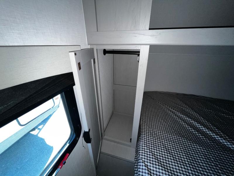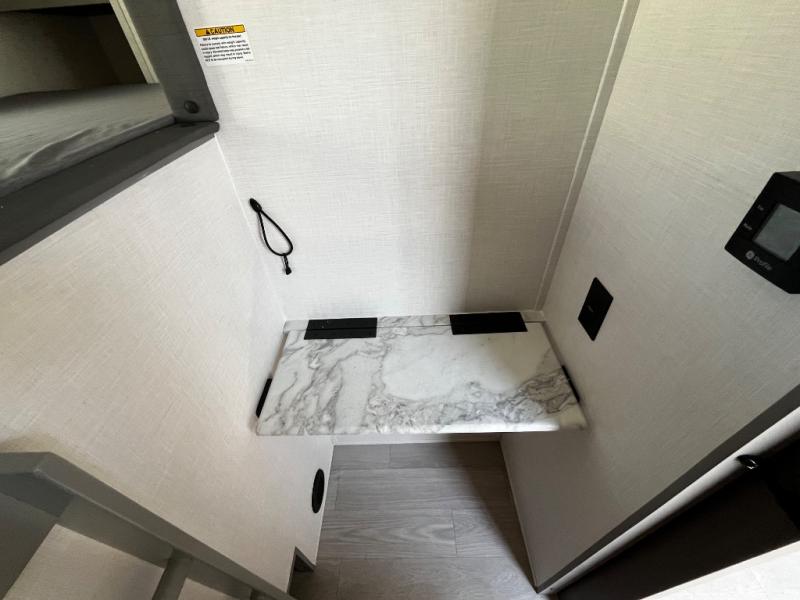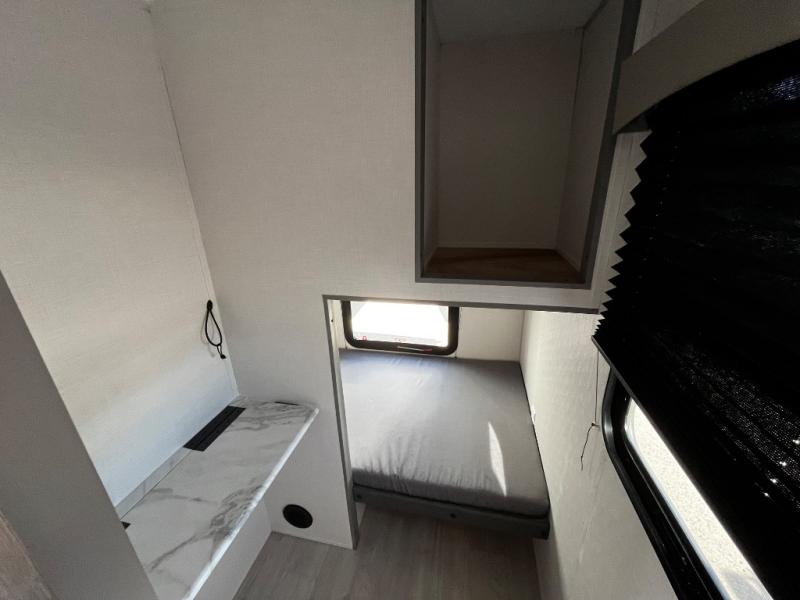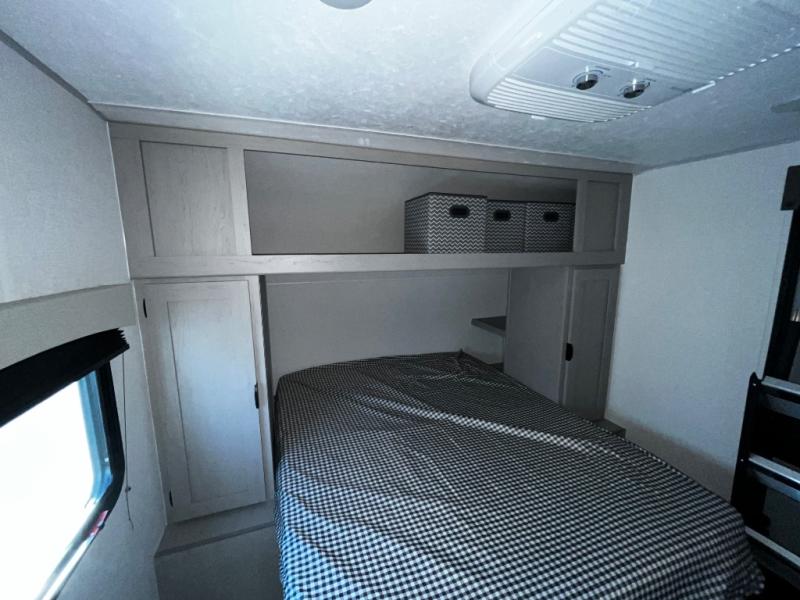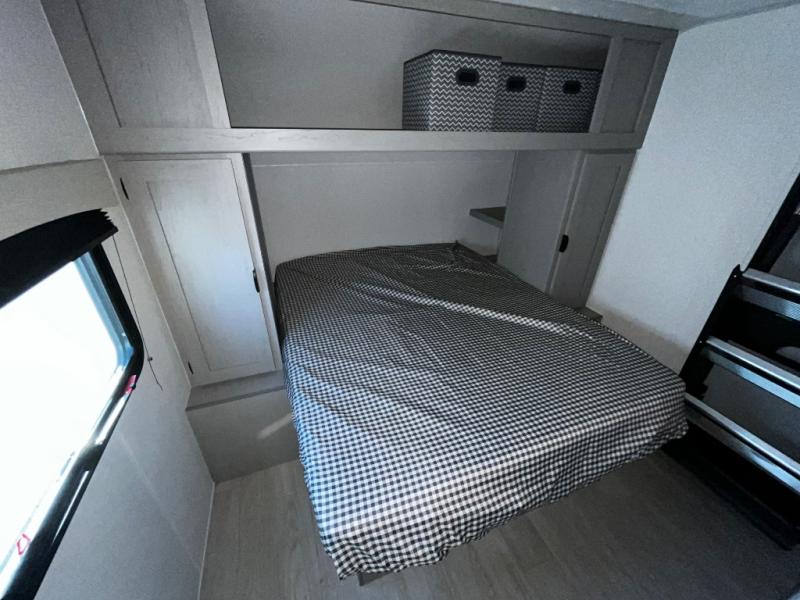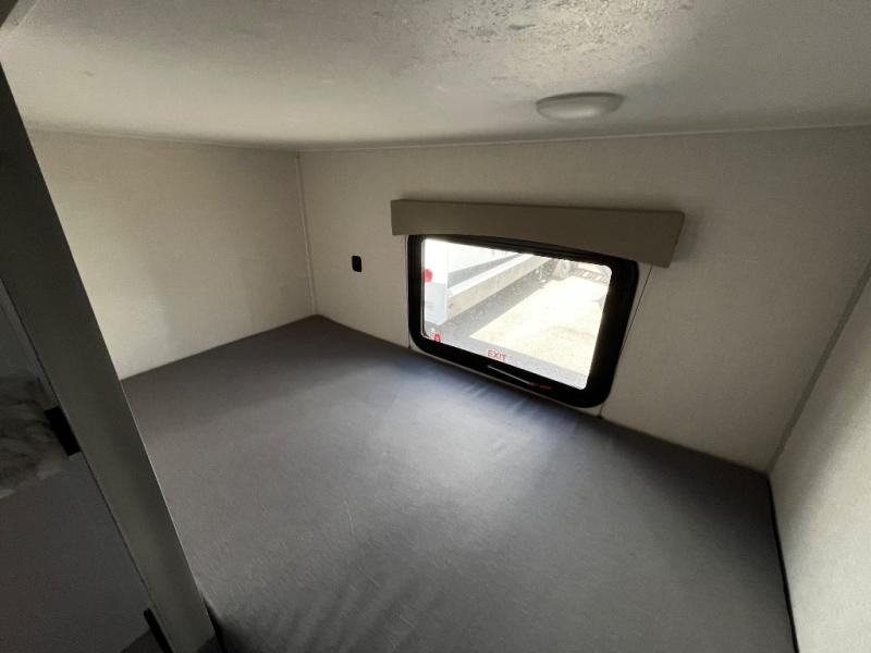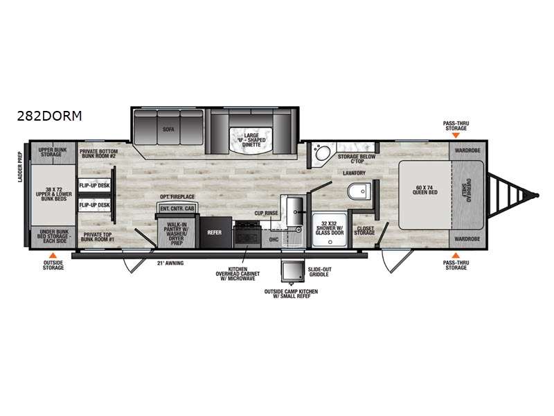 At the front of the trailer, a private bedroom welcomes you with a comfortable 60" x 80" queen bed for a restful night’s sleep, along with wardrobes on each side and an overhead shelf for organized storage. A convenient entry door provides direct access to this cozy space. Moving through the pass-through full bathroom, you’ll find storage beneath the countertop for toiletries and a 32" x 32" shower with a glass door, perfect for unwinding after a full day of adventure. At the center of the trailer, the main living area and kitchen create a spacious and functional hub, featuring a sofa and U-shaped dinette housed in a slide-out for plenty of seating space, while the fully equipped kitchen includes a sink with drying rack, a three-burner cooktop, and a 10 cu. ft. refrigerator so you can cook like a chef. Next to the second entry door, a walk-in pantry offers abundant space for dry goods and supplies. At the rear, two private bunk rooms each include a 38" x 72" bunk, dedicated storage, and a flip-up desk, ideal for work, study, or quiet time.