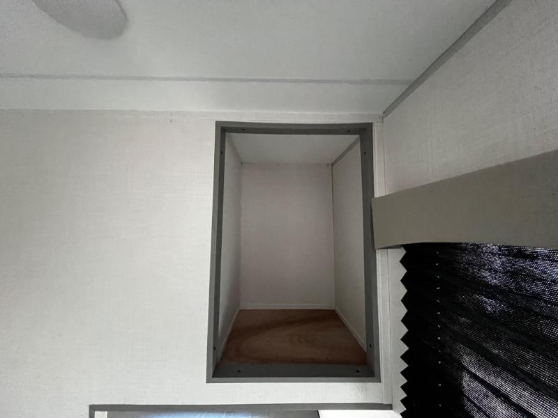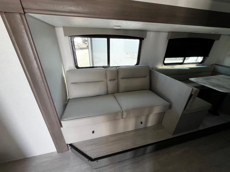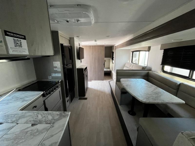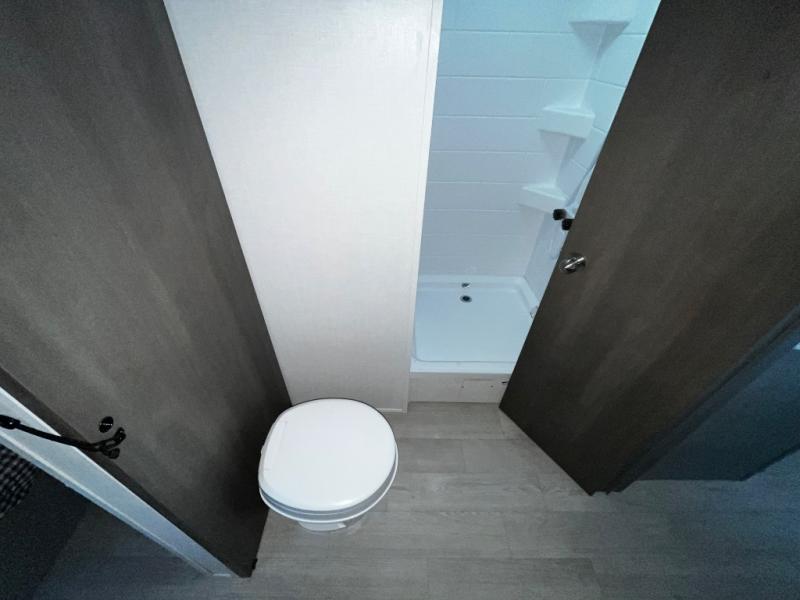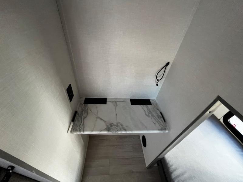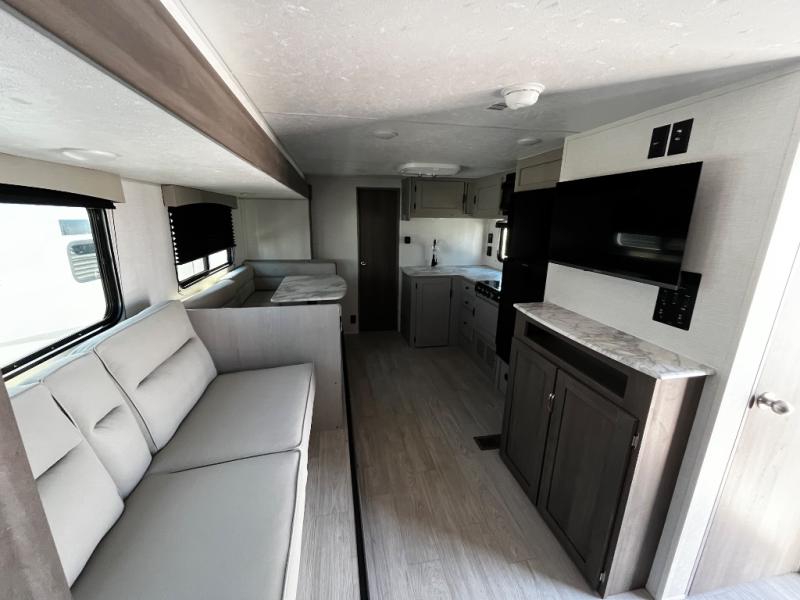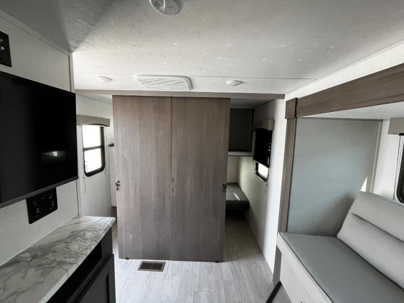 At the front of the trailer, a private bedroom welcomes you with a comfortable 60" x 80" queen bed for a restful night’s sleep, along with wardrobes on each side and an overhead shelf for organized storage. A convenient entry door provides direct access to this cozy space. Moving through the pass-through full bathroom, you’ll find storage beneath the countertop for toiletries and a 32" x 32" shower with a glass door, perfect for unwinding after a full day of adventure. At the center of the trailer, the main living area and kitchen create a spacious and functional hub, featuring a sofa and U-shaped dinette housed in a slide-out for plenty of seating space, while the fully equipped kitchen includes a sink with drying rack, a three-burner cooktop, and a 10 cu. ft. refrigerator so you can cook like a chef. Next to the second entry door, a walk-in pantry offers abundant space for dry goods and supplies. At the rear, two private bunk rooms each include a 38" x 72" bunk, dedicated storage, and a flip-up desk, ideal for work, study, or quiet time.
