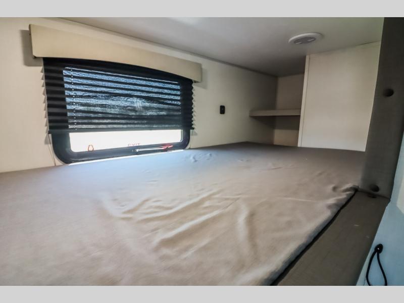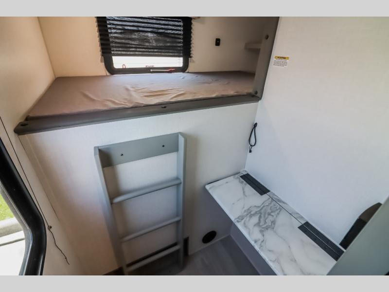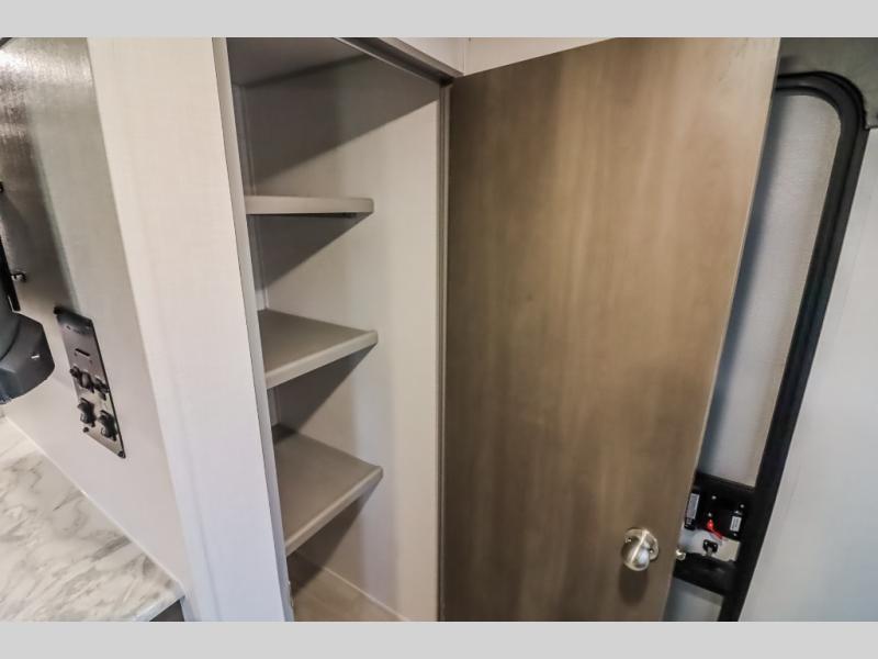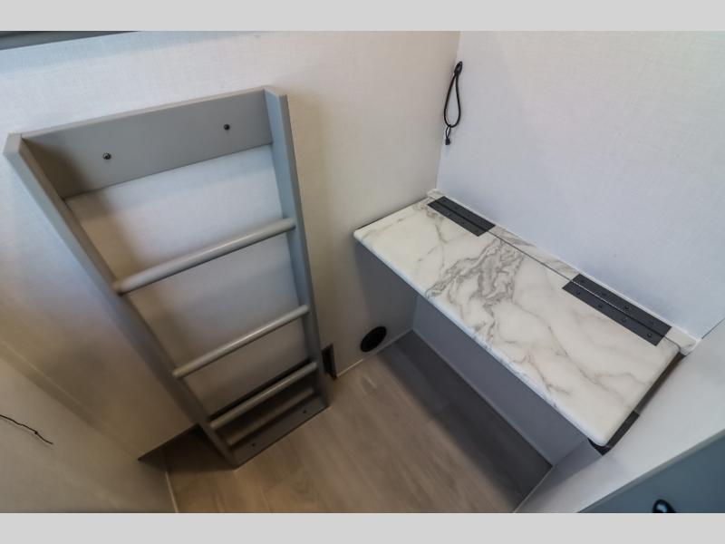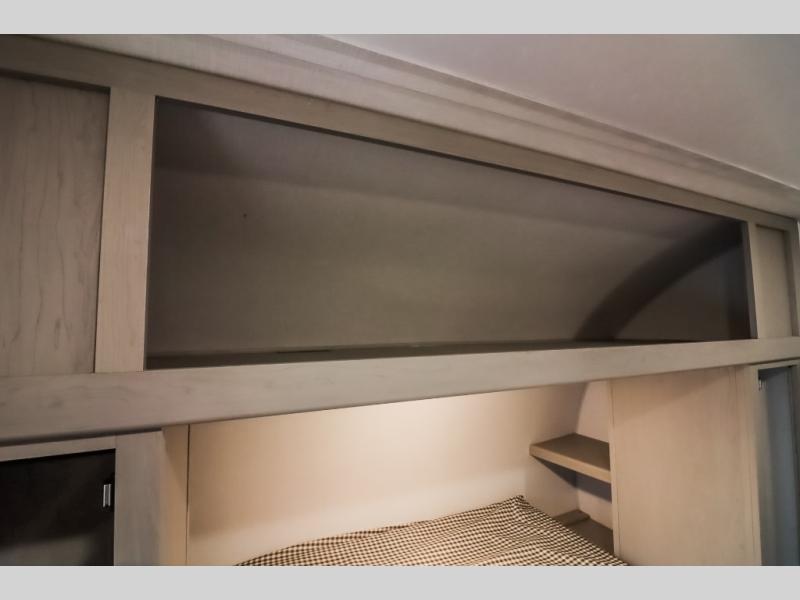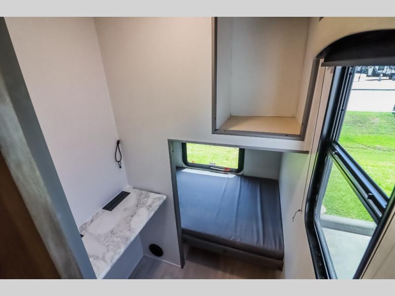 At the front of the trailer, a private bedroom welcomes you with a comfortable 60" x 80" queen bed for a restful night’s sleep, along with wardrobes on each side and an overhead shelf for organized storage. A convenient entry door provides direct access to this cozy space. Moving through the pass-through full bathroom, you’ll find storage beneath the countertop for toiletries and a 32" x 32" shower with a glass door, perfect for unwinding after a full day of adventure. At the center of the trailer, the main living area and kitchen create a spacious and functional hub, featuring a sofa and U-shaped dinette housed in a slide-out for plenty of seating space, while the fully equipped kitchen includes a sink with drying rack, a three-burner cooktop, and a 10 cu. ft. refrigerator so you can cook like a chef. Next to the second entry door, a walk-in pantry offers abundant space for dry goods and supplies. At the rear, two private bunk rooms each include a 38" x 72" bunk, dedicated storage, and a flip-up desk, ideal for work, study, or quiet time.