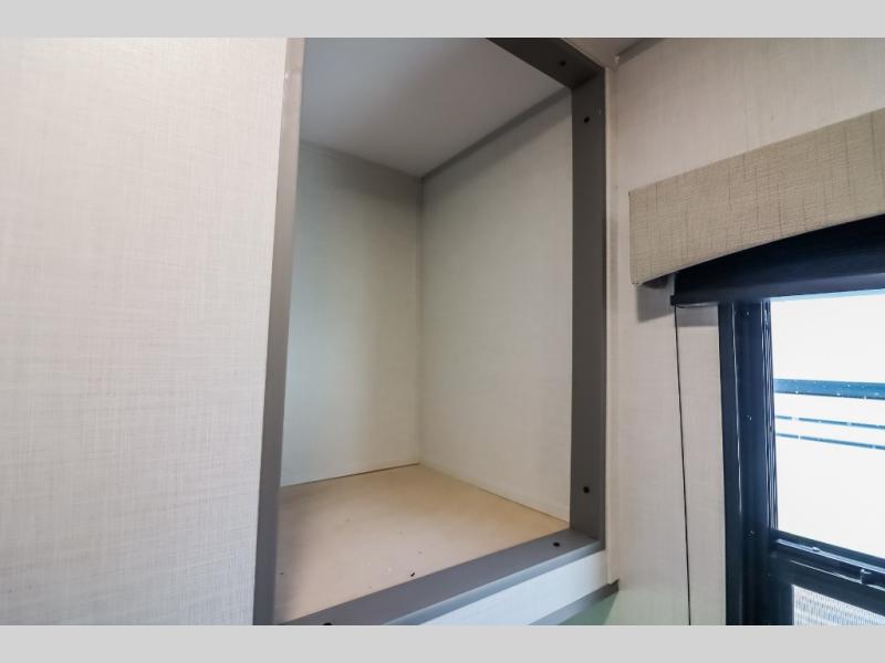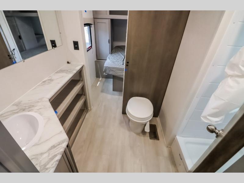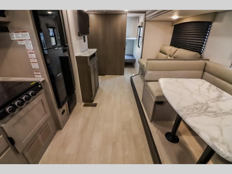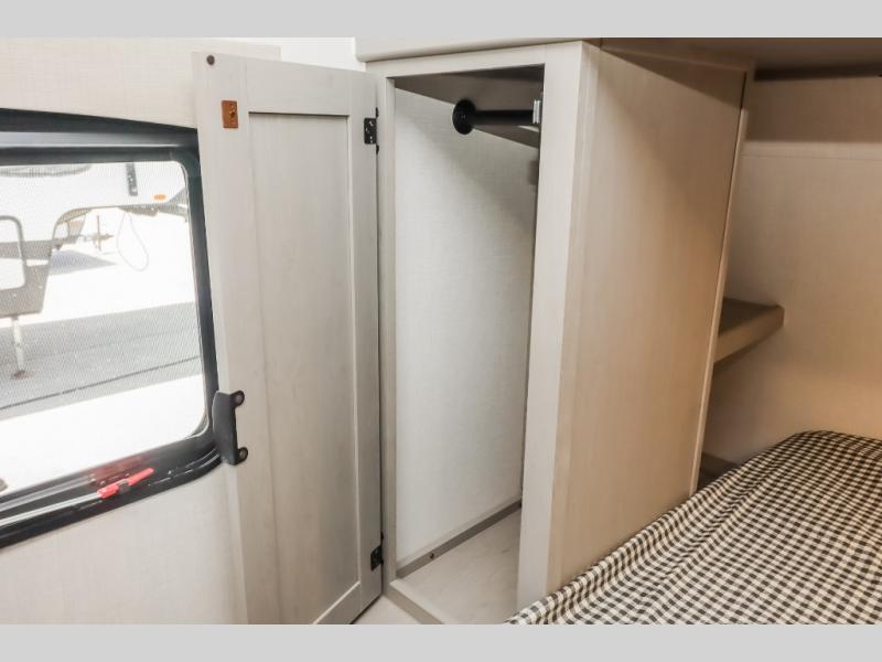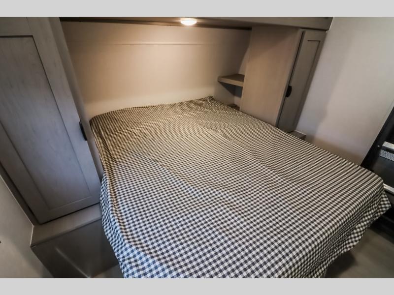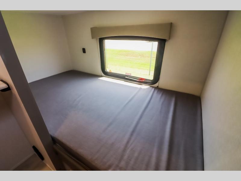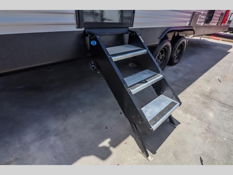 At the front of the trailer, a private bedroom welcomes you with a comfortable 60" x 80" queen bed for a restful night’s sleep, along with wardrobes on each side and an overhead shelf for organized storage. A convenient entry door provides direct access to this cozy space. Moving through the pass-through full bathroom, you’ll find storage beneath the countertop for toiletries and a 32" x 32" shower with a glass door, perfect for unwinding after a full day of adventure. At the center of the trailer, the main living area and kitchen create a spacious and functional hub, featuring a sofa and U-shaped dinette housed in a slide-out for plenty of seating space, while the fully equipped kitchen includes a sink with drying rack, a three-burner cooktop, and a 10 cu. ft. refrigerator so you can cook like a chef. Next to the second entry door, a walk-in pantry offers abundant space for dry goods and supplies. At the rear, two private bunk rooms each include a 38" x 72" bunk, dedicated storage, and a flip-up desk, ideal for work, study, or quiet time.