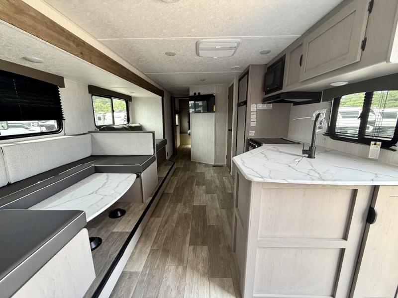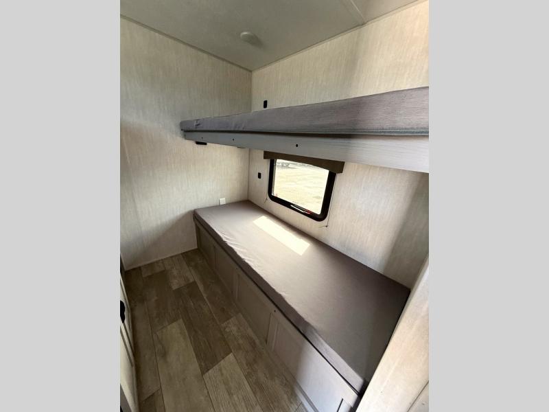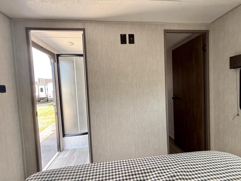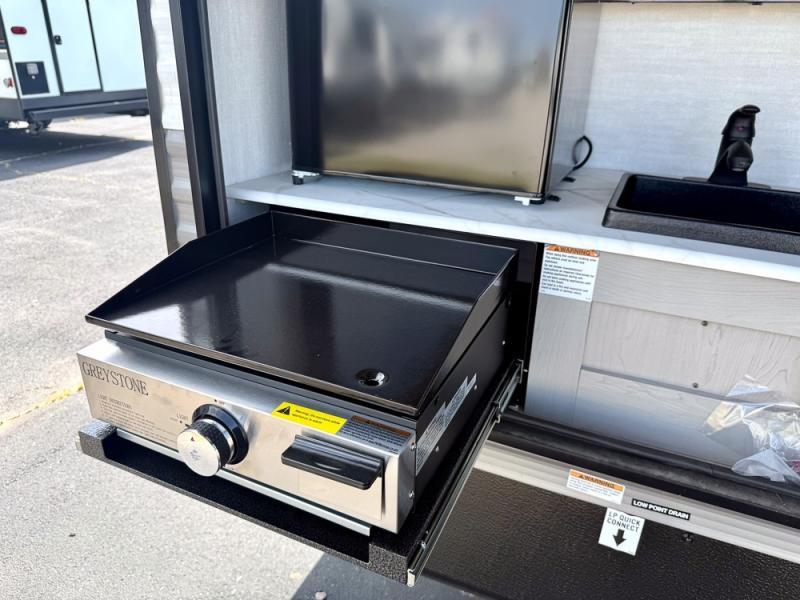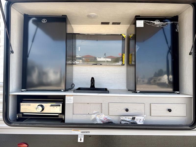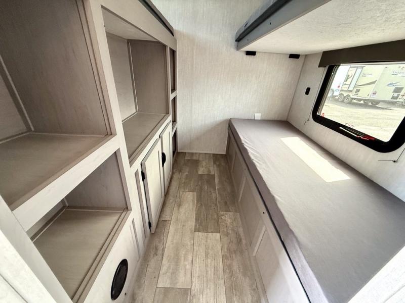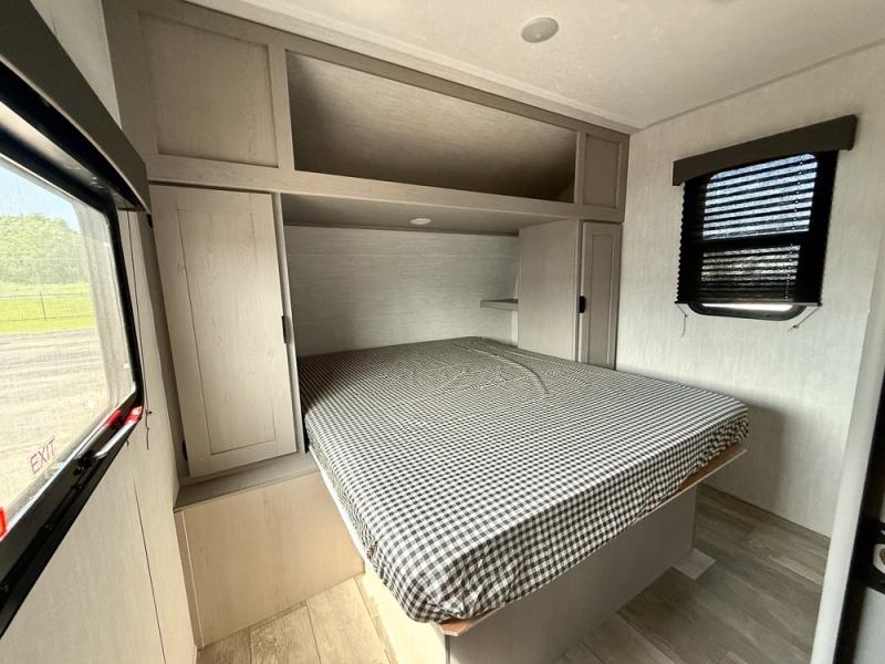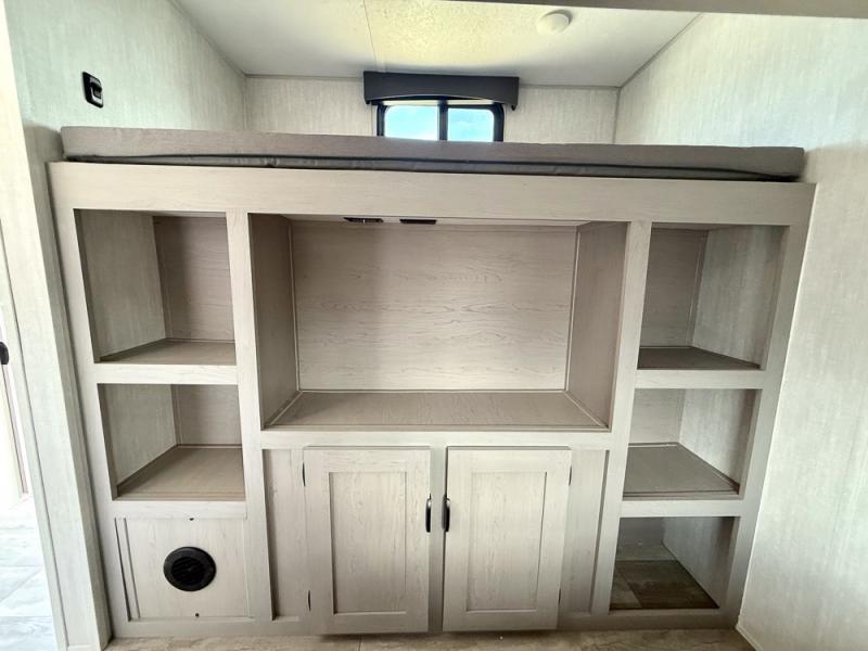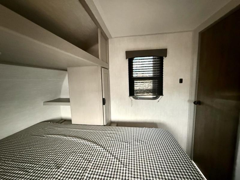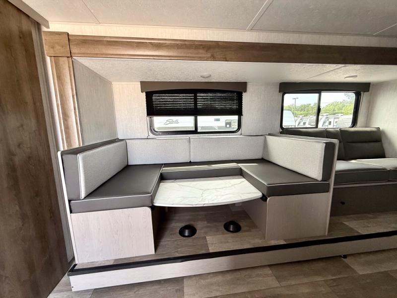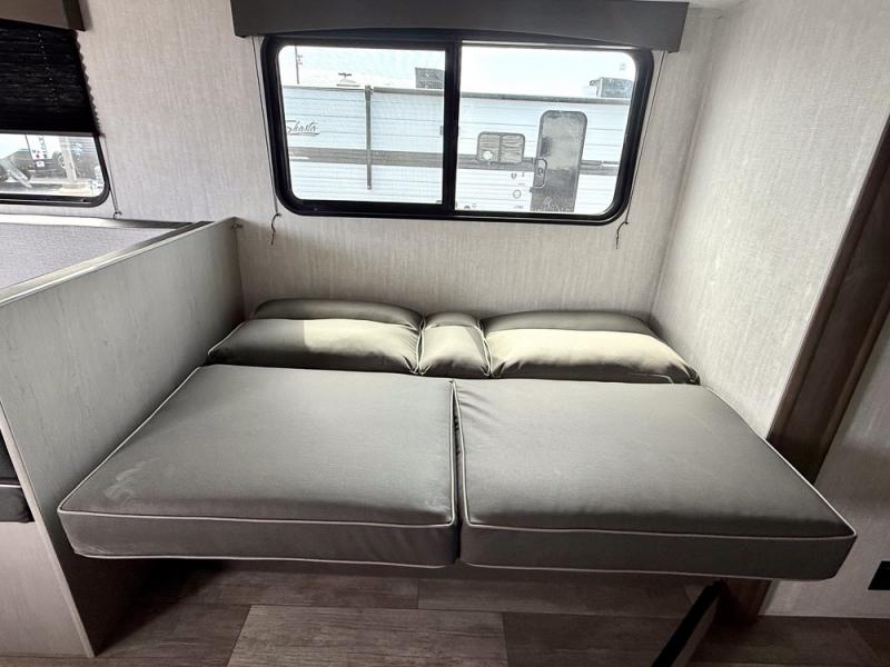 Everything you've been looking for in a travel trailer is found with this unit! The 20' power awning can be set up when you get to the campground, then you can unload the pass-thru storage and make lunch on the outside camp kitchen with a pull-out griddle. Once inside, you can put your things away in the front master bedroom that includes an RV queen bed and dual bedside wardrobes, plus you'll have a private entrance into the dual entry bath. The bath also includes one of the dual entry doors to the unit to make it easier to use when you're spending time outdoors. In the combined kitchen and living area you'll find a large slide out, a U-shaped dinette and sofa, plus a pantry with washer and dryer prep if you plan to go full-time. Another great feature on this travel trailer is the rear private bunkhouse! There is a 28" x 72" bunk bed across from 38" x 72" bunk with storage below so your guests have a place for their things!