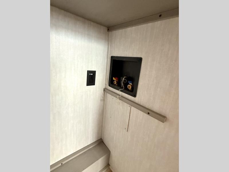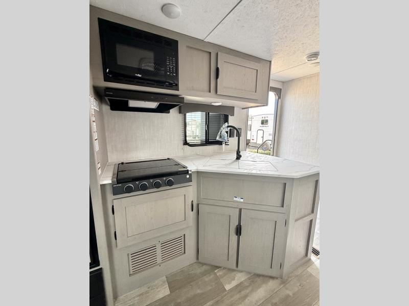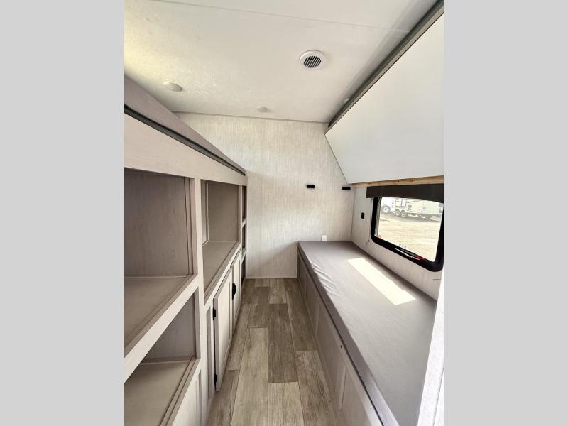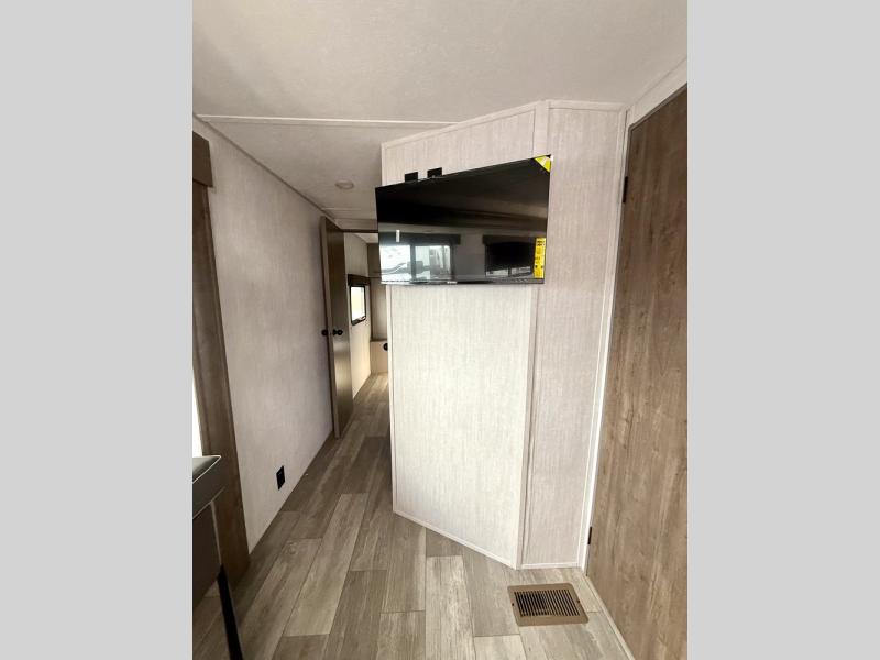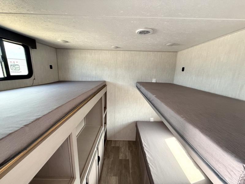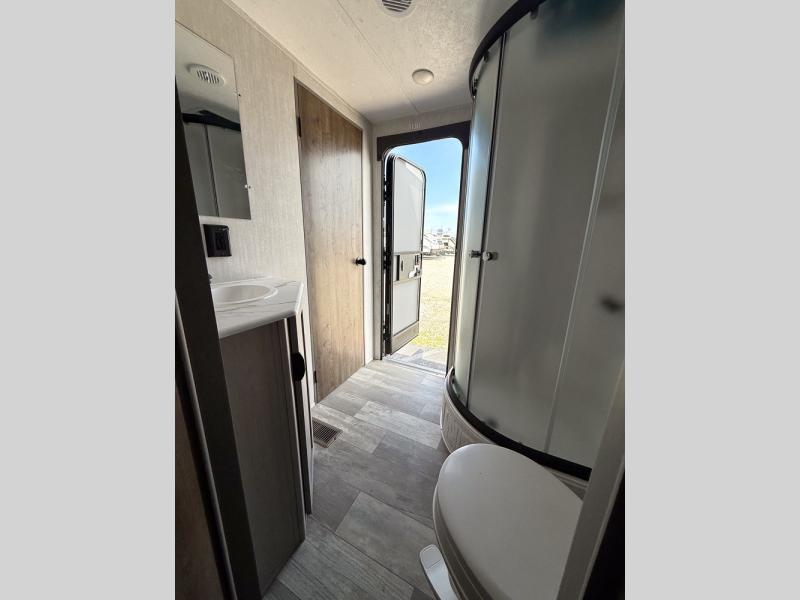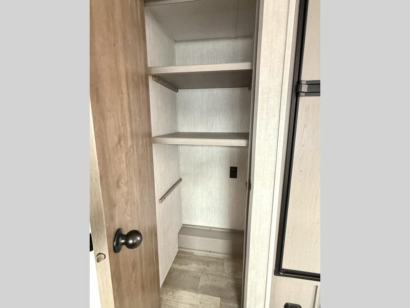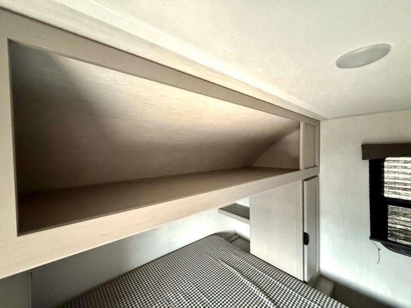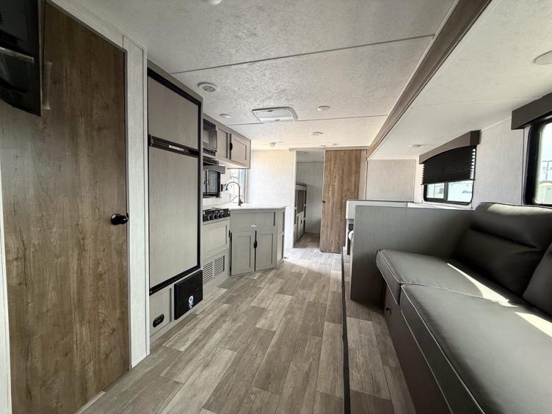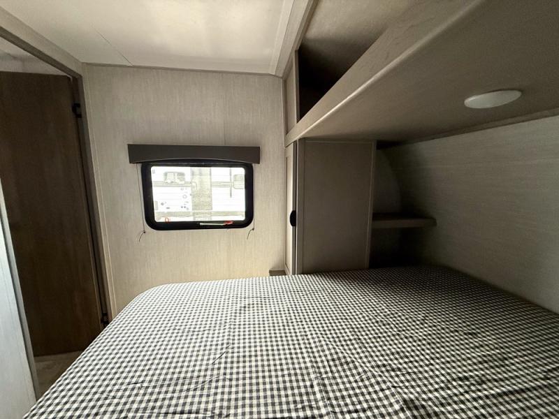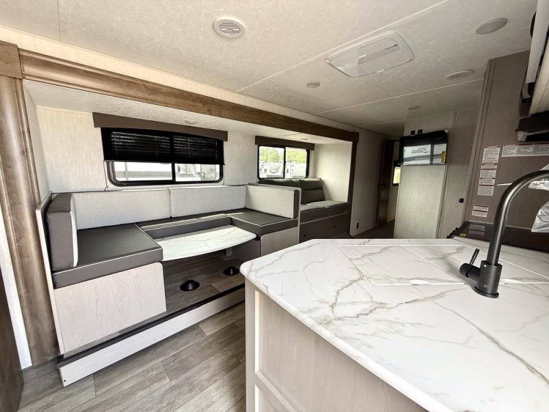 Everything you've been looking for in a travel trailer is found with this unit! The 20' power awning can be set up when you get to the campground, then you can unload the pass-thru storage and make lunch on the outside camp kitchen with a pull-out griddle. Once inside, you can put your things away in the front master bedroom that includes an RV queen bed and dual bedside wardrobes, plus you'll have a private entrance into the dual entry bath. The bath also includes one of the dual entry doors to the unit to make it easier to use when you're spending time outdoors. In the combined kitchen and living area you'll find a large slide out, a U-shaped dinette and sofa, plus a pantry with washer and dryer prep if you plan to go full-time. Another great feature on this travel trailer is the rear private bunkhouse! There is a 28" x 72" bunk bed across from 38" x 72" bunk with storage below so your guests have a place for their things!