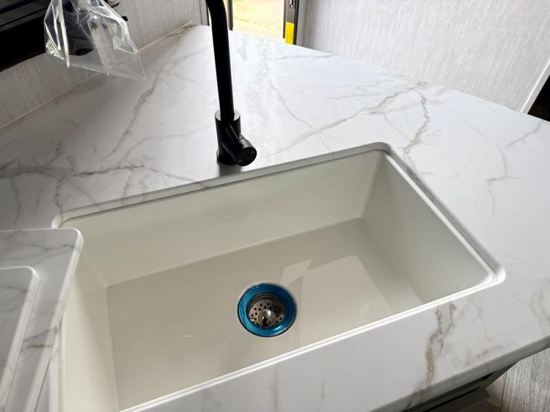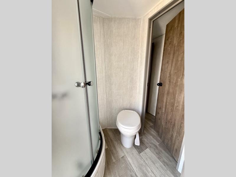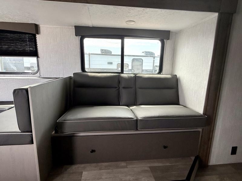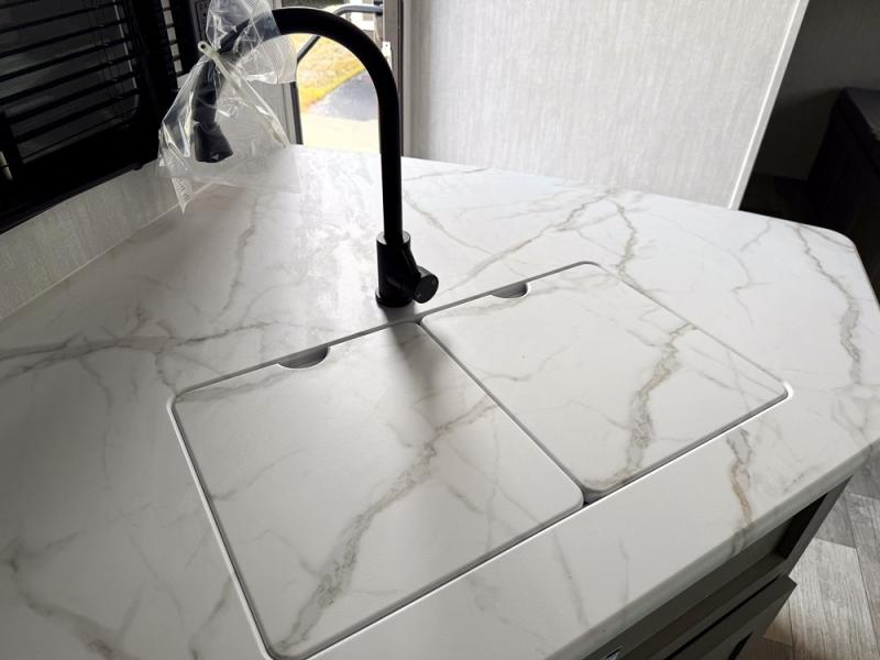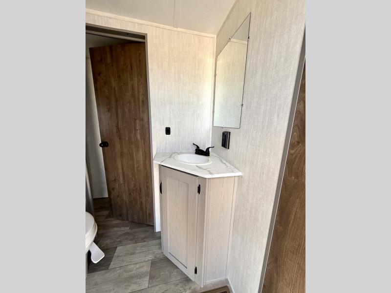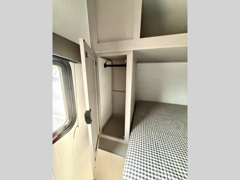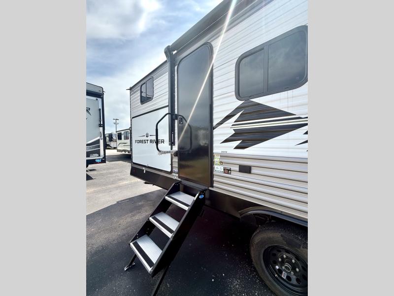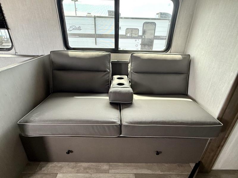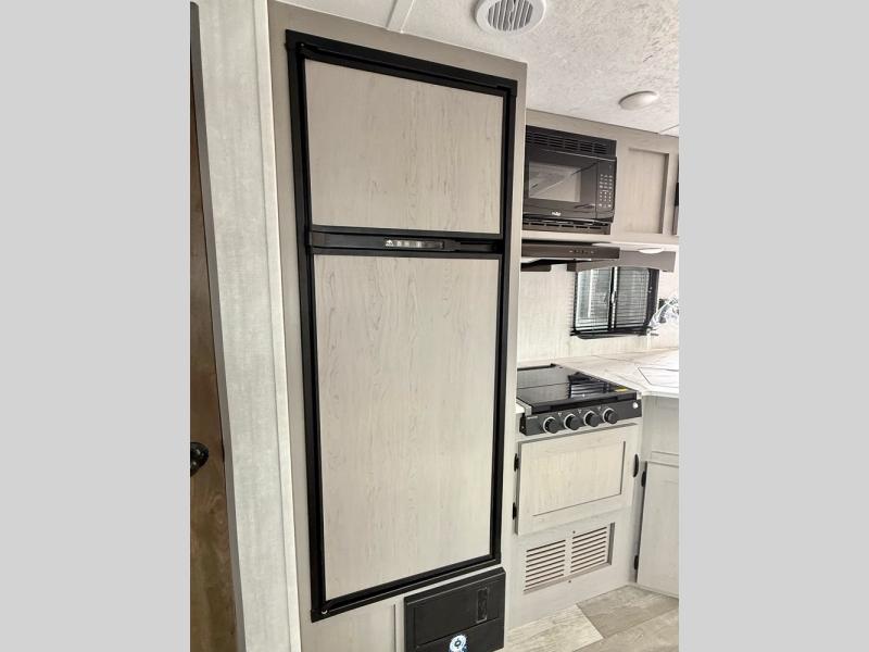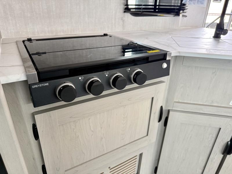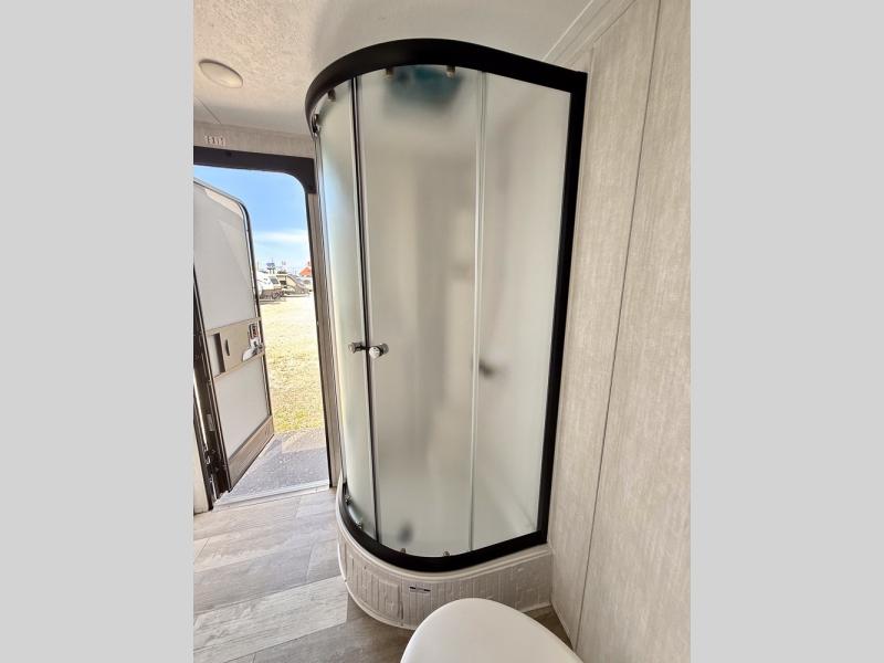 Everything you've been looking for in a travel trailer is found with this unit! The 20' power awning can be set up when you get to the campground, then you can unload the pass-thru storage and make lunch on the outside camp kitchen with a pull-out griddle. Once inside, you can put your things away in the front master bedroom that includes an RV queen bed and dual bedside wardrobes, plus you'll have a private entrance into the dual entry bath. The bath also includes one of the dual entry doors to the unit to make it easier to use when you're spending time outdoors. In the combined kitchen and living area you'll find a large slide out, a U-shaped dinette and sofa, plus a pantry with washer and dryer prep if you plan to go full-time. Another great feature on this travel trailer is the rear private bunkhouse! There is a 28" x 72" bunk bed across from 38" x 72" bunk with storage below so your guests have a place for their things!