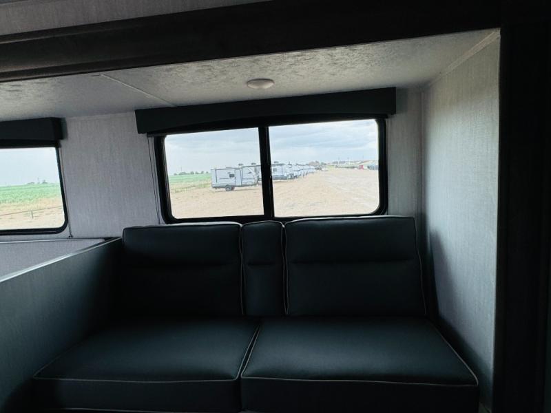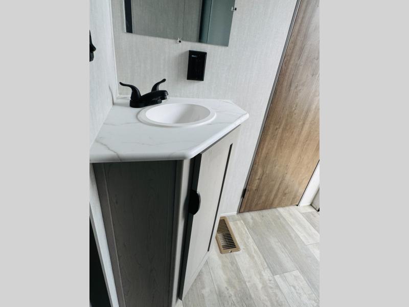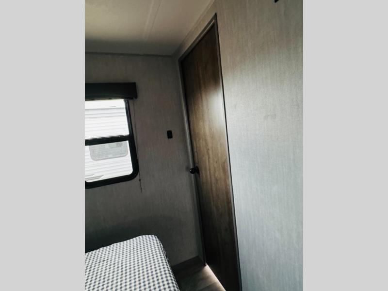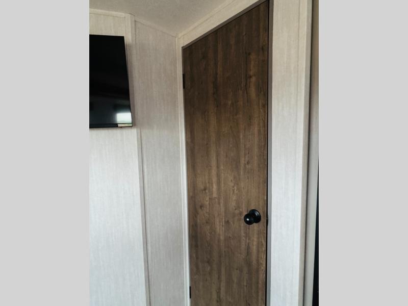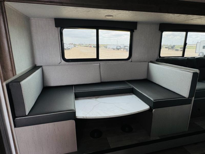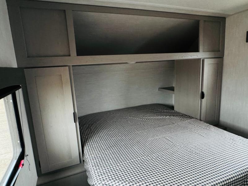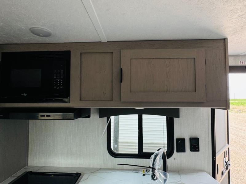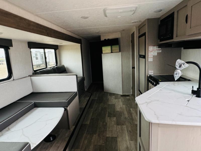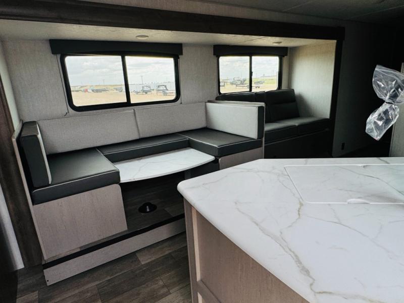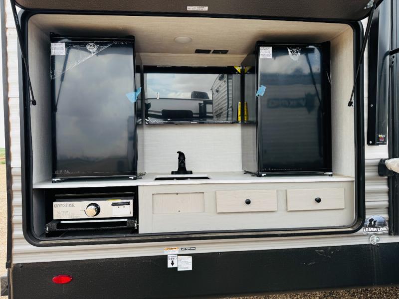 Everything you've been looking for in a travel trailer is found with this unit! The 20' power awning can be set up when you get to the campground, then you can unload the pass-thru storage and make lunch on the outside camp kitchen with a pull-out griddle. Once inside, you can put your things away in the front master bedroom that includes an RV queen bed and dual bedside wardrobes, plus you'll have a private entrance into the dual entry bath. The bath also includes one of the dual entry doors to the unit to make it easier to use when you're spending time outdoors. In the combined kitchen and living area you'll find a large slide out, a U-shaped dinette and sofa, plus a pantry with washer and dryer prep if you plan to go full-time. Another great feature on this travel trailer is the rear private bunkhouse! There is a 28" x 72" bunk bed across from 38" x 72" bunk with storage below so your guests have a place for their things!