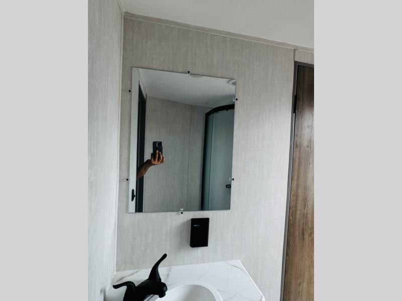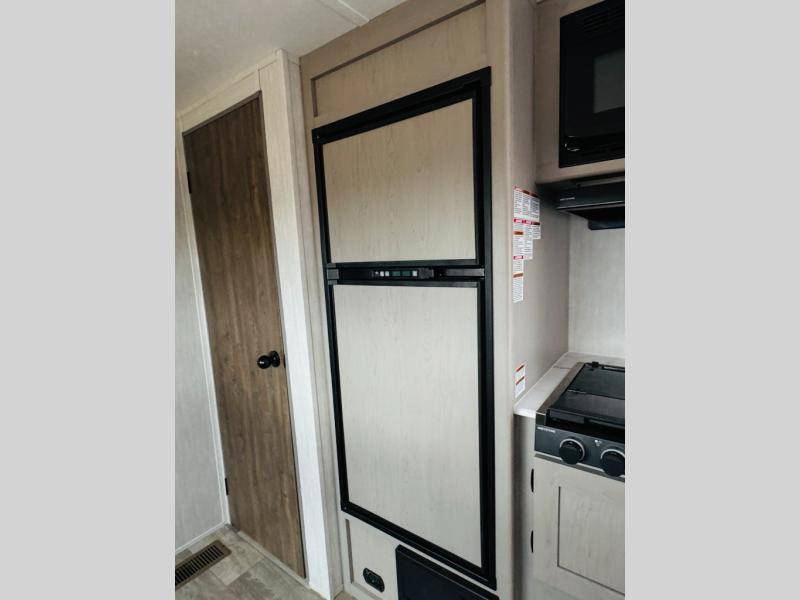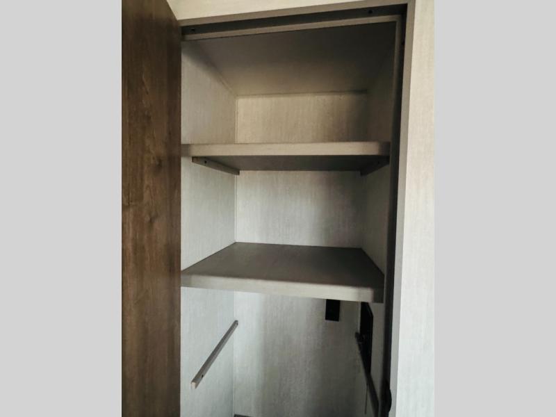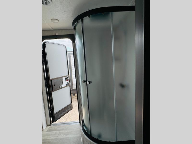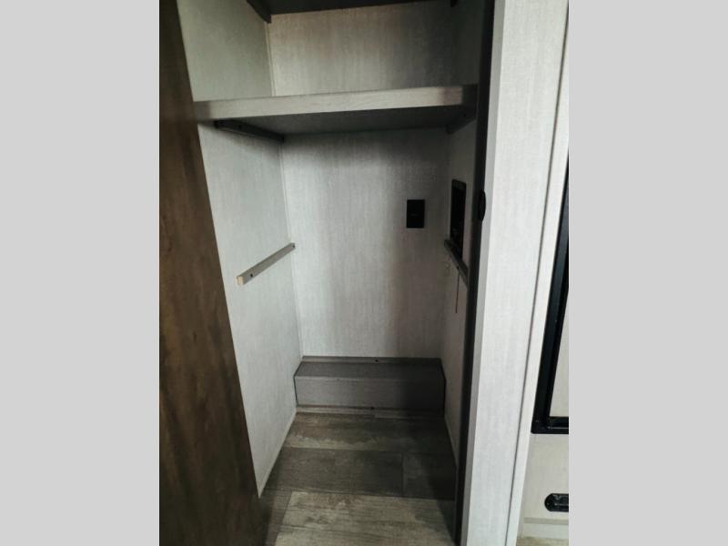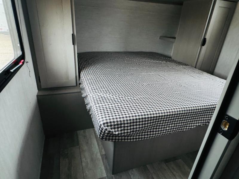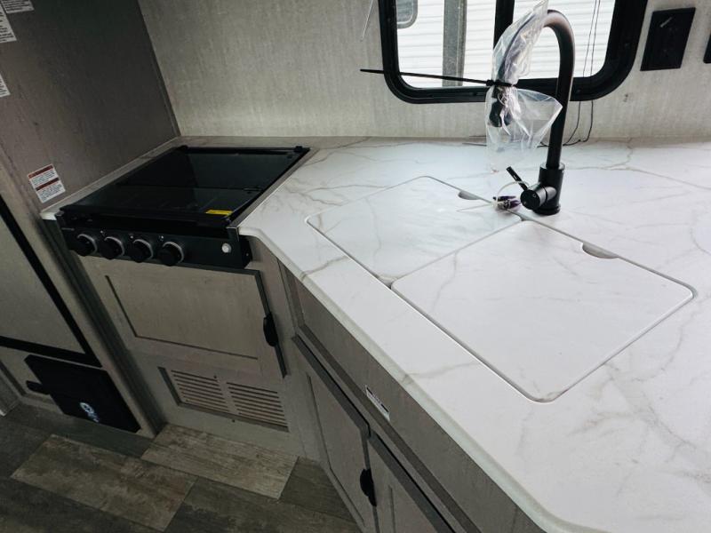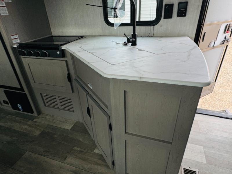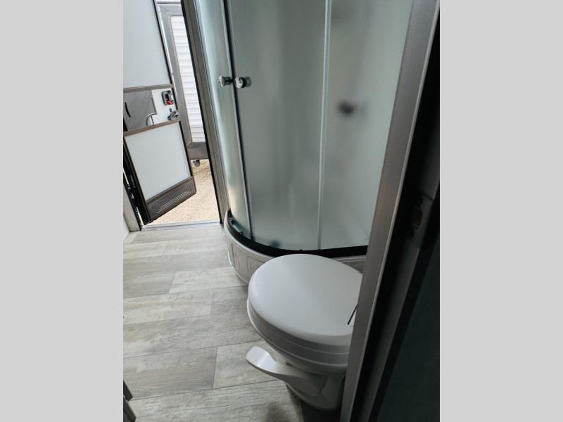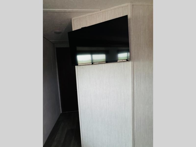 Everything you've been looking for in a travel trailer is found with this unit! The 20' power awning can be set up when you get to the campground, then you can unload the pass-thru storage and make lunch on the outside camp kitchen with a pull-out griddle. Once inside, you can put your things away in the front master bedroom that includes an RV queen bed and dual bedside wardrobes, plus you'll have a private entrance into the dual entry bath. The bath also includes one of the dual entry doors to the unit to make it easier to use when you're spending time outdoors. In the combined kitchen and living area you'll find a large slide out, a U-shaped dinette and sofa, plus a pantry with washer and dryer prep if you plan to go full-time. Another great feature on this travel trailer is the rear private bunkhouse! There is a 28" x 72" bunk bed across from 38" x 72" bunk with storage below so your guests have a place for their things!