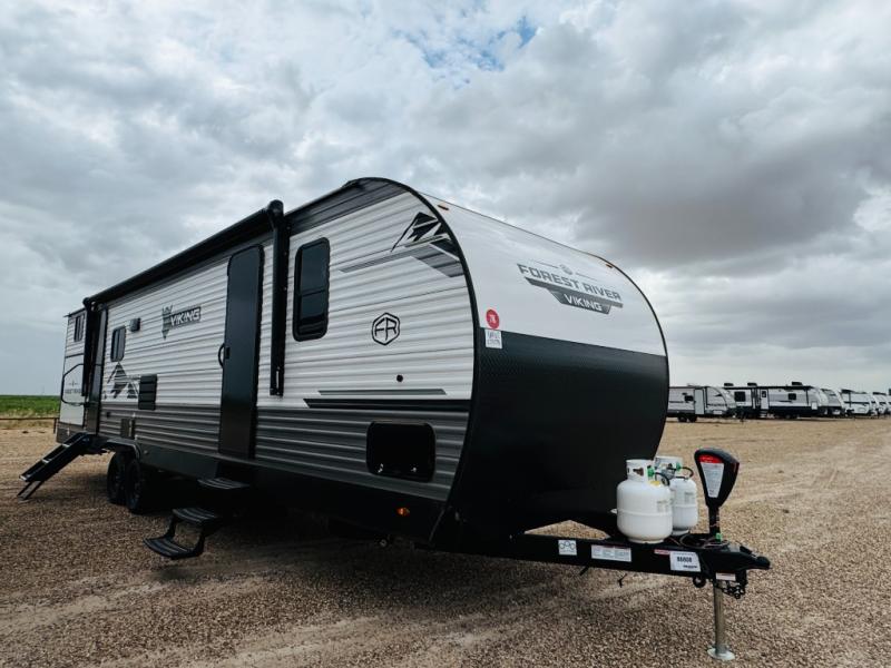 With any Forest River Viking 6K Series travel trailer, you can experience affordable camping with your family with the same comforts and quality as the bigger trailers. Each is built on a BAL NXG frame with supreme powder coating, and features an 8' wide frame with an aerodynamic engineered front profile for easy towing. The interior offers stylish kitchen backsplash, upgraded cabinets, a foot flush toilet, plus USB charging ports for your phone or tablet. Available options feature a power tongue jack, a fireplace with a remote, a solar package and more!