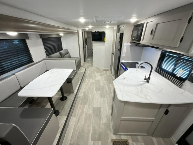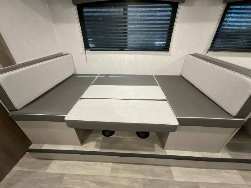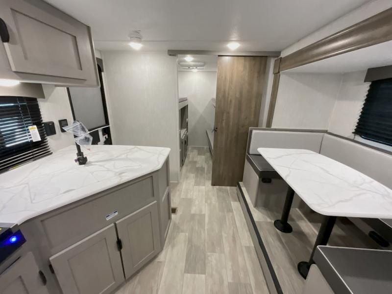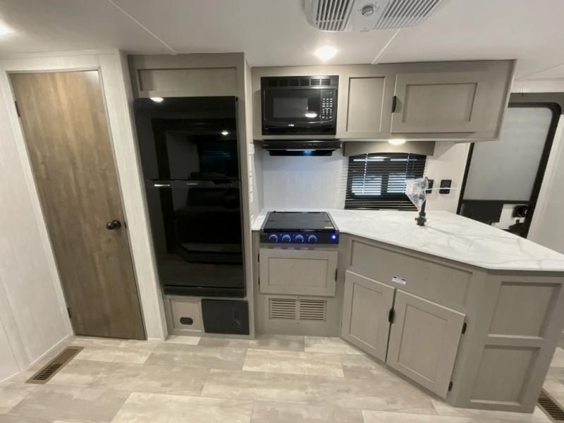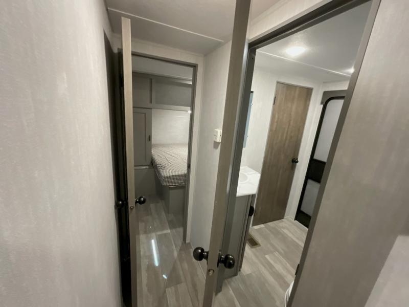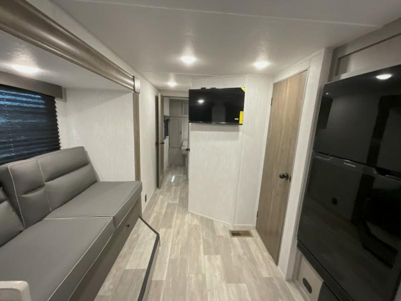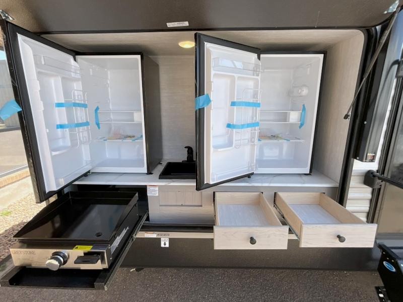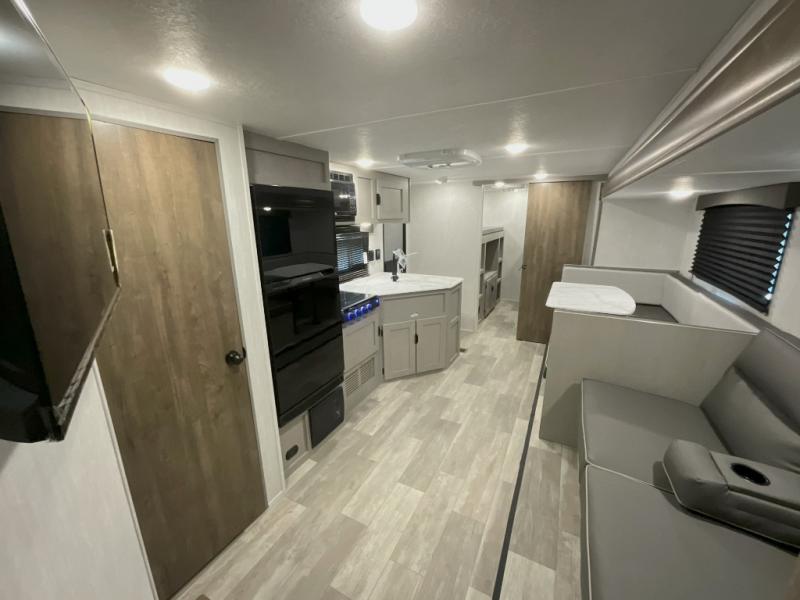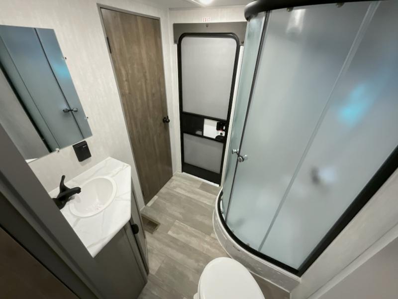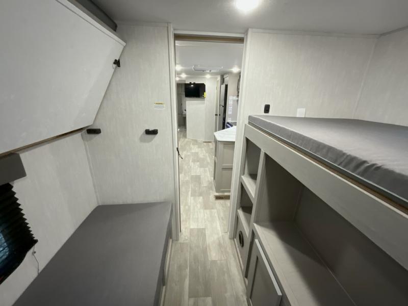 Everything you've been looking for in a travel trailer is found with this unit! The 20' power awning can be set up when you get to the campground, then you can unload the pass-thru storage and make lunch on the outside camp kitchen with a pull-out griddle. Once inside, you can put your things away in the front master bedroom that includes an RV queen bed and dual bedside wardrobes, plus you'll have a private entrance into the dual entry bath. The bath also includes one of the dual entry doors to the unit to make it easier to use when you're spending time outdoors. In the combined kitchen and living area you'll find a large slide out, a U-shaped dinette and sofa, plus a pantry with washer and dryer prep if you plan to go full-time. Another great feature on this travel trailer is the rear private bunkhouse! There is a 28" x 72" bunk bed across from 38" x 72" bunk with storage below so your guests have a place for their things!