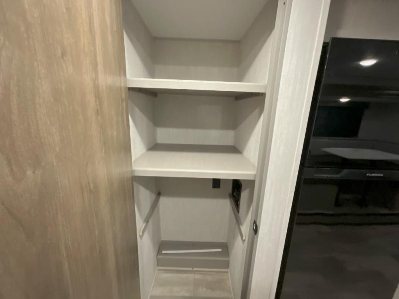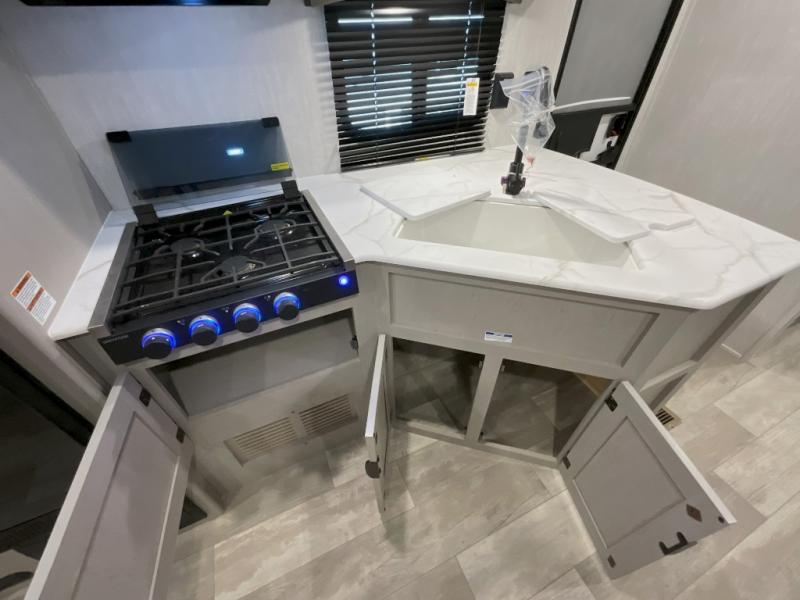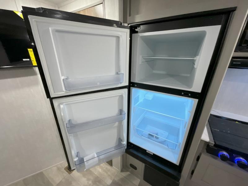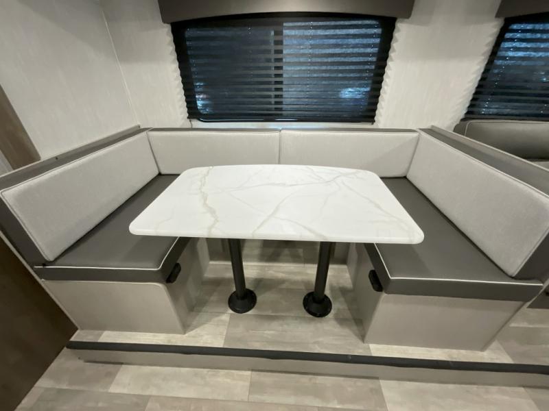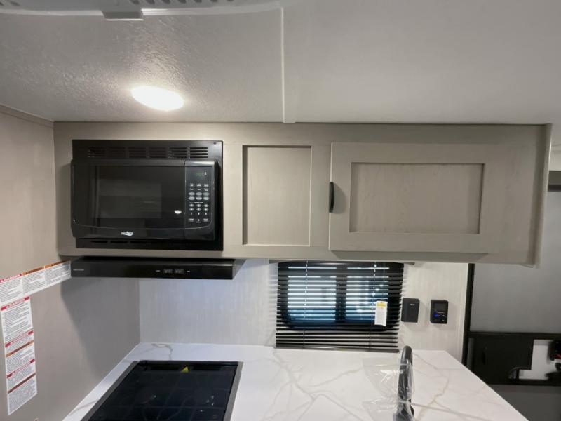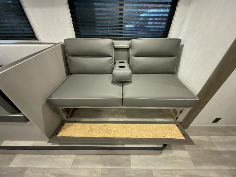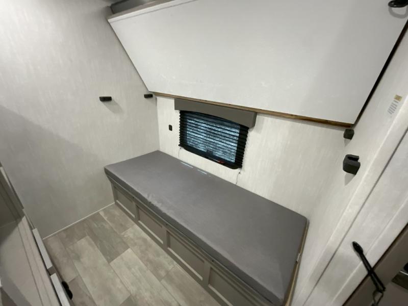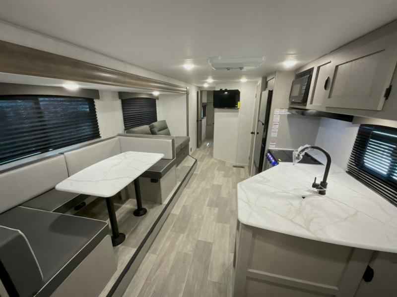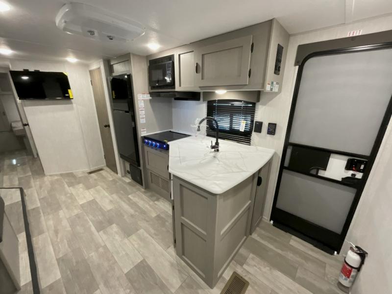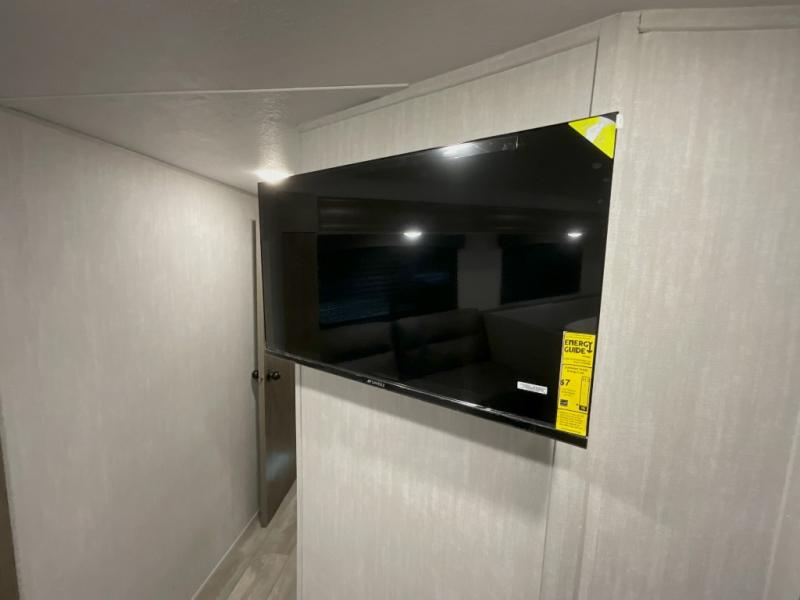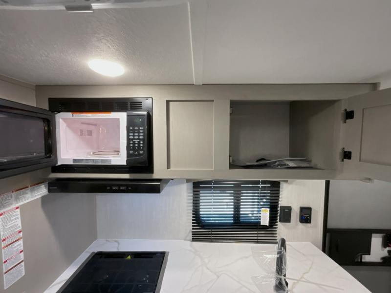 Everything you've been looking for in a travel trailer is found with this unit! The 20' power awning can be set up when you get to the campground, then you can unload the pass-thru storage and make lunch on the outside camp kitchen with a pull-out griddle. Once inside, you can put your things away in the front master bedroom that includes an RV queen bed and dual bedside wardrobes, plus you'll have a private entrance into the dual entry bath. The bath also includes one of the dual entry doors to the unit to make it easier to use when you're spending time outdoors. In the combined kitchen and living area you'll find a large slide out, a U-shaped dinette and sofa, plus a pantry with washer and dryer prep if you plan to go full-time. Another great feature on this travel trailer is the rear private bunkhouse! There is a 28" x 72" bunk bed across from 38" x 72" bunk with storage below so your guests have a place for their things!