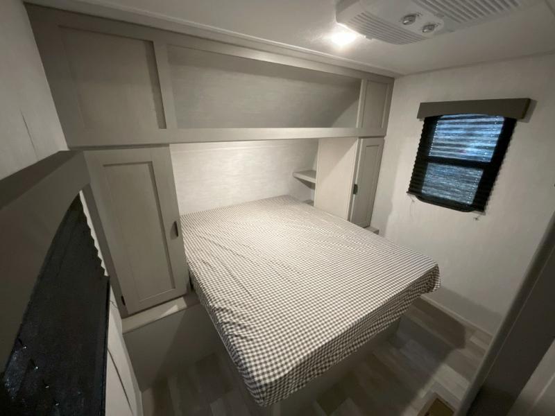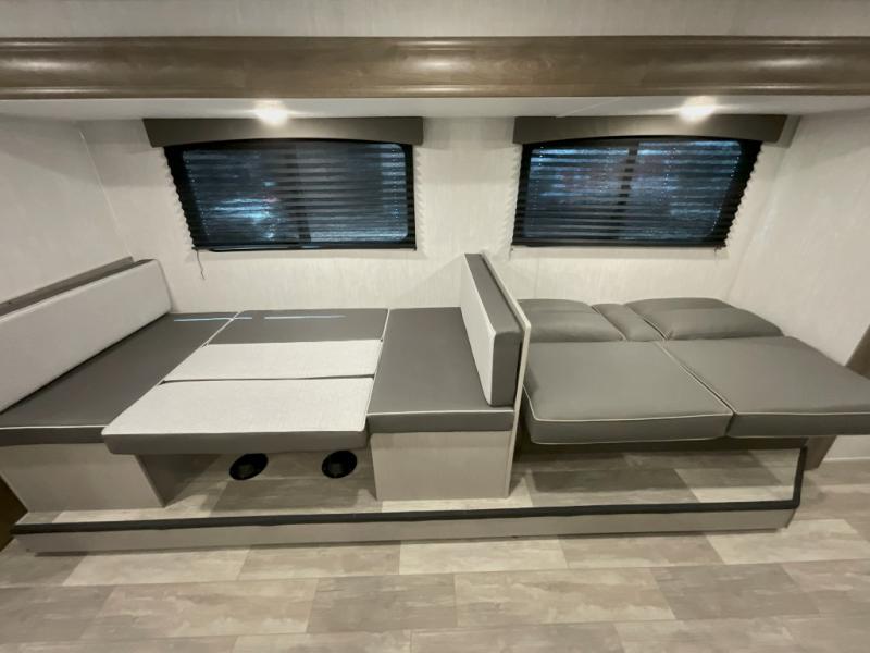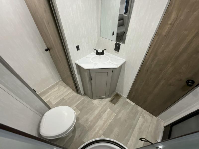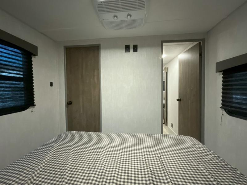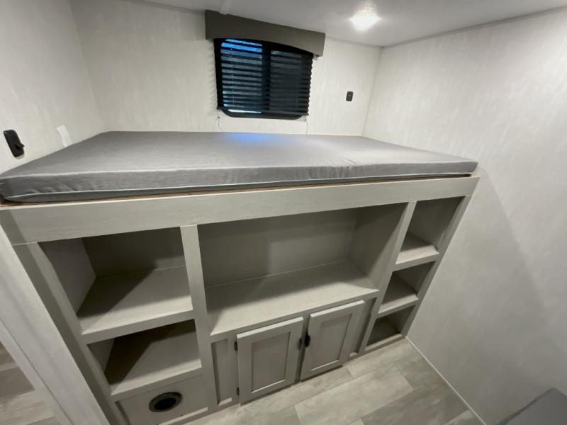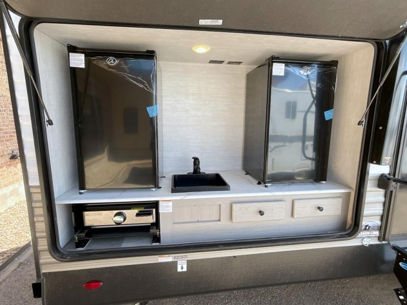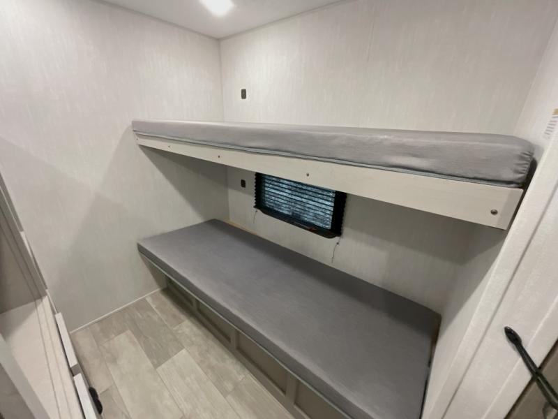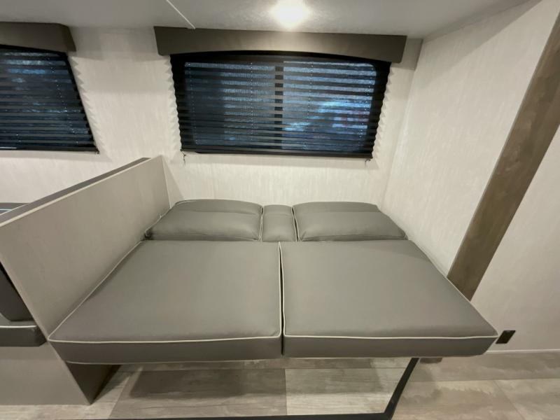 Everything you've been looking for in a travel trailer is found with this unit! The 20' power awning can be set up when you get to the campground, then you can unload the pass-thru storage and make lunch on the outside camp kitchen with a pull-out griddle. Once inside, you can put your things away in the front master bedroom that includes an RV queen bed and dual bedside wardrobes, plus you'll have a private entrance into the dual entry bath. The bath also includes one of the dual entry doors to the unit to make it easier to use when you're spending time outdoors. In the combined kitchen and living area you'll find a large slide out, a U-shaped dinette and sofa, plus a pantry with washer and dryer prep if you plan to go full-time. Another great feature on this travel trailer is the rear private bunkhouse! There is a 28" x 72" bunk bed across from 38" x 72" bunk with storage below so your guests have a place for their things!