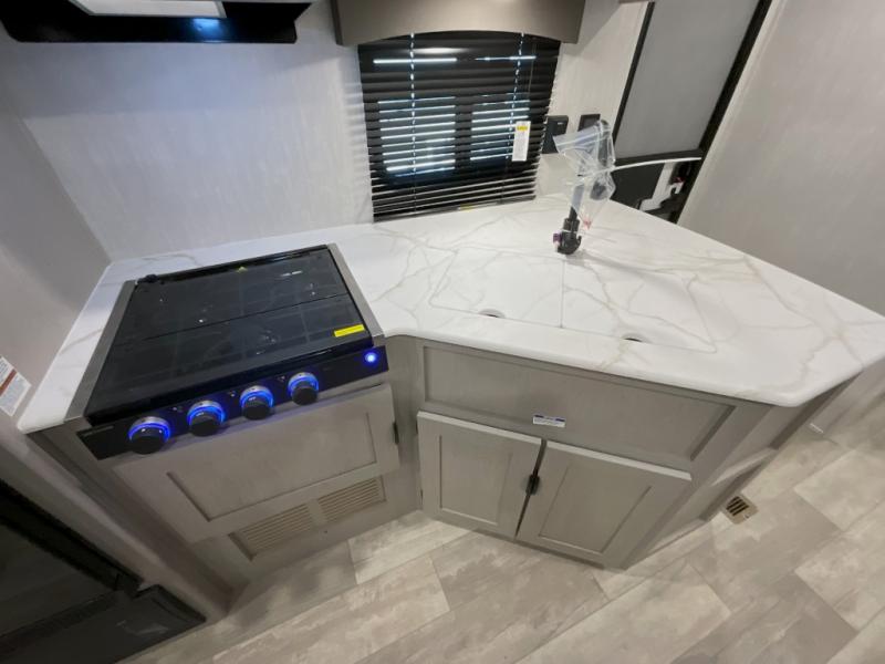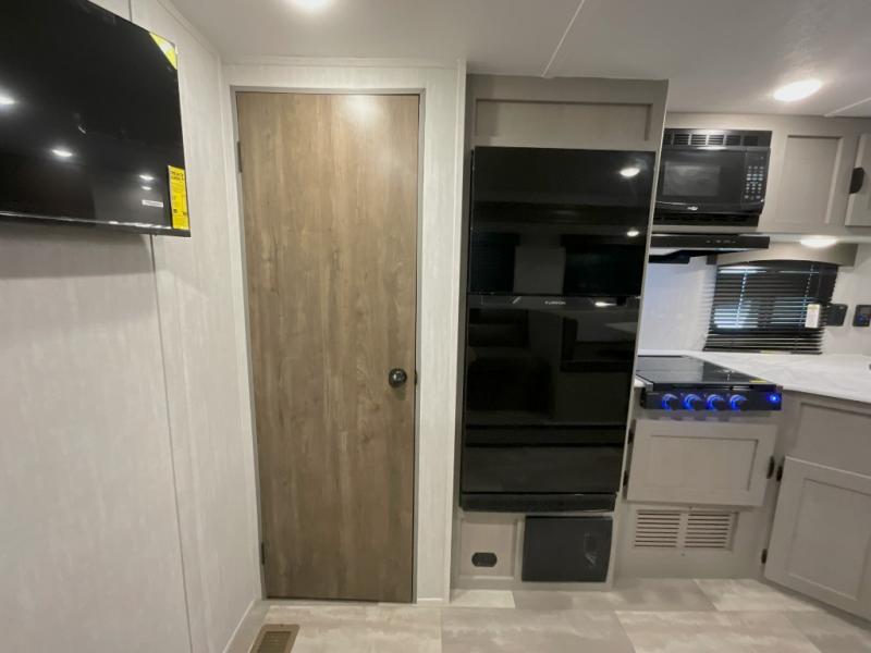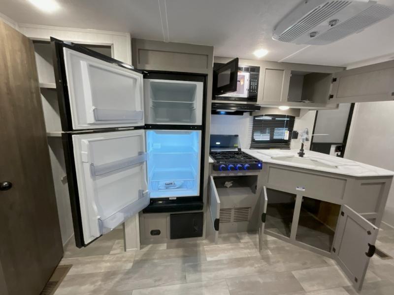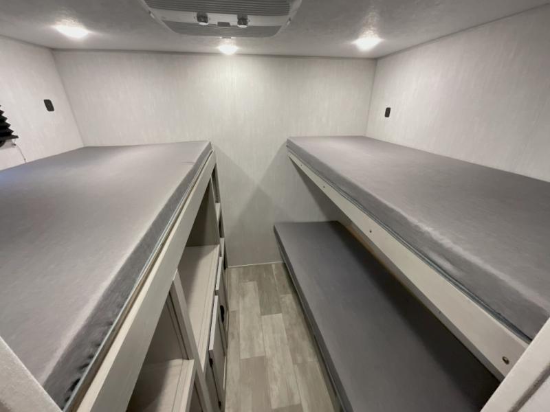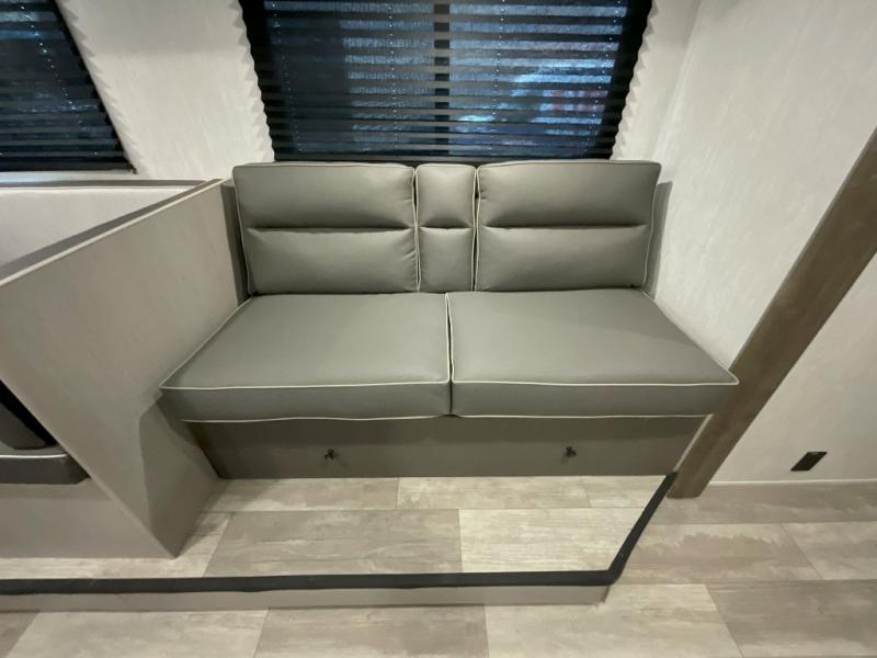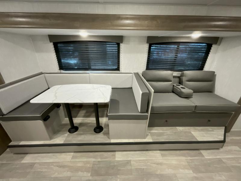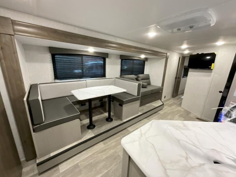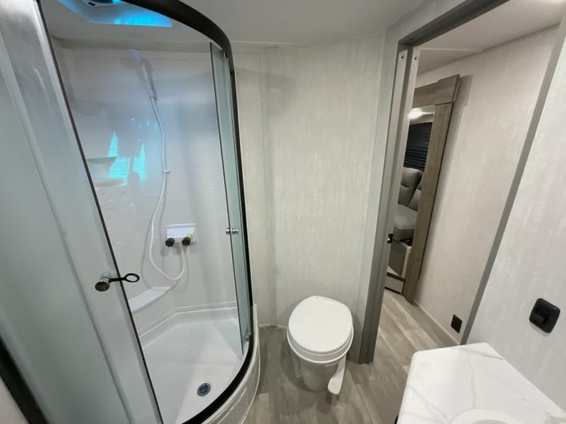 Everything you've been looking for in a travel trailer is found with this unit! The 20' power awning can be set up when you get to the campground, then you can unload the pass-thru storage and make lunch on the outside camp kitchen with a pull-out griddle. Once inside, you can put your things away in the front master bedroom that includes an RV queen bed and dual bedside wardrobes, plus you'll have a private entrance into the dual entry bath. The bath also includes one of the dual entry doors to the unit to make it easier to use when you're spending time outdoors. In the combined kitchen and living area you'll find a large slide out, a U-shaped dinette and sofa, plus a pantry with washer and dryer prep if you plan to go full-time. Another great feature on this travel trailer is the rear private bunkhouse! There is a 28" x 72" bunk bed across from 38" x 72" bunk with storage below so your guests have a place for their things!