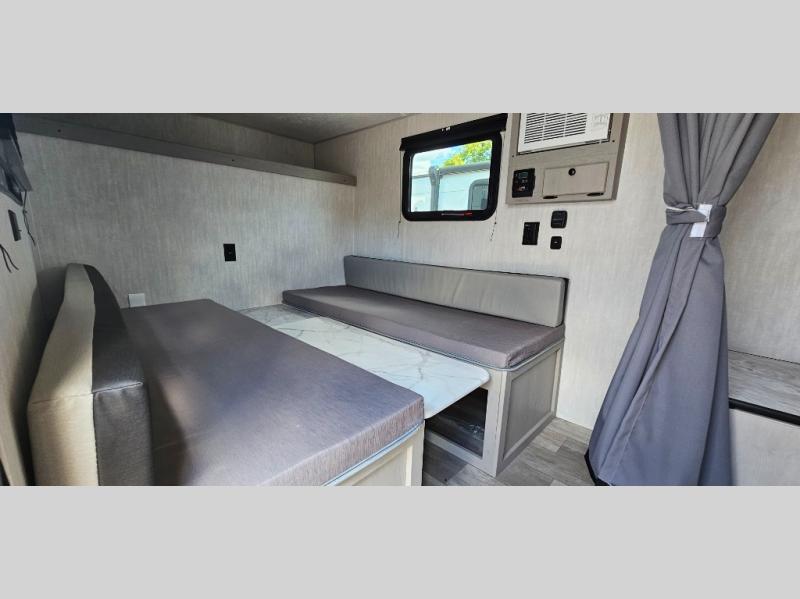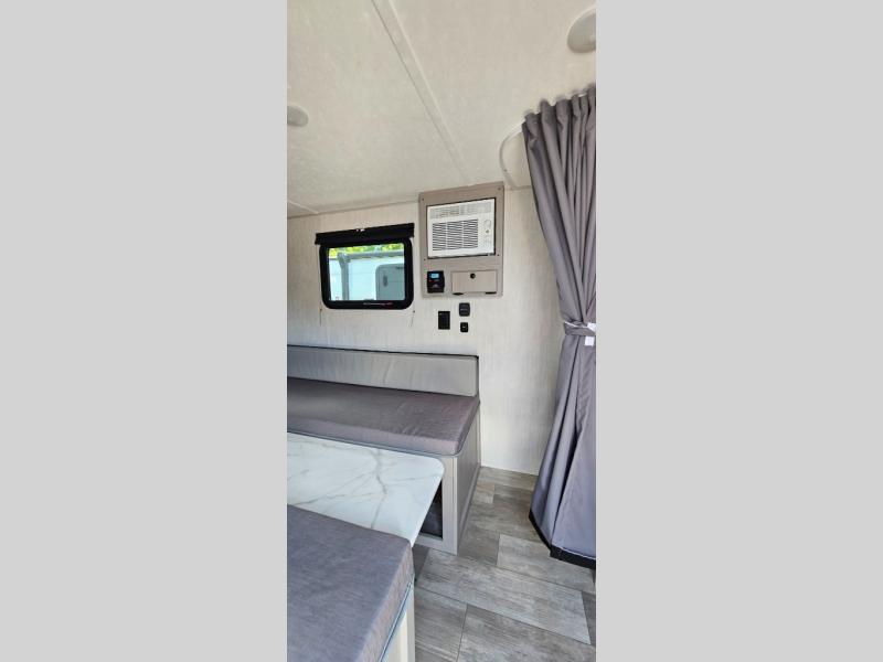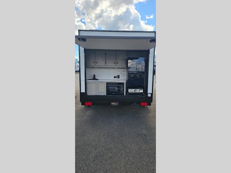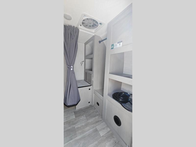 This travel trailer features a little more interior space since you can move between the two twin beds with storage, and there is a portable table you can set up when you want to dine together. You'll find an overhead cabinet in the back for your belongings, along with a storage cabinet up front and a wardrobe. The cassette toilet will add even more convenience. The rear hatch kitchen includes a pull-out griddle and grill combo cooktop, a 3.3 cu. ft. 12V refrigerator, and a microwave oven. There is also a hot and cold faucet and multiple overhead storage cabinets for spices, utensils, and more!