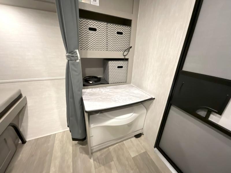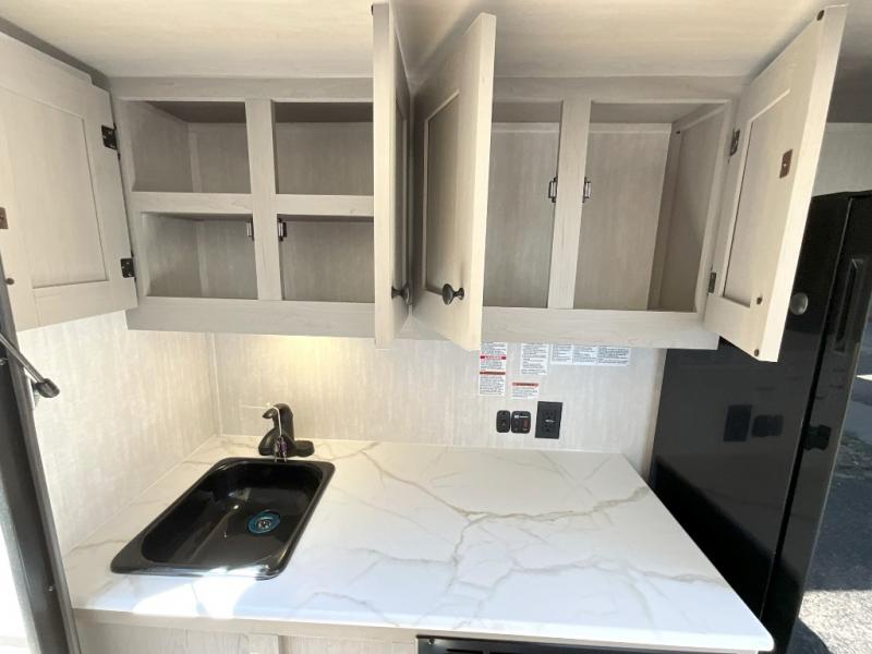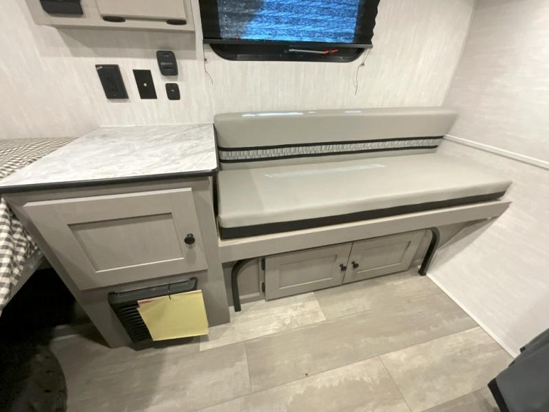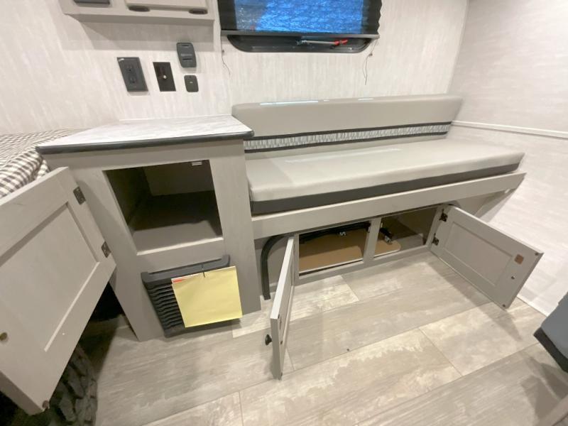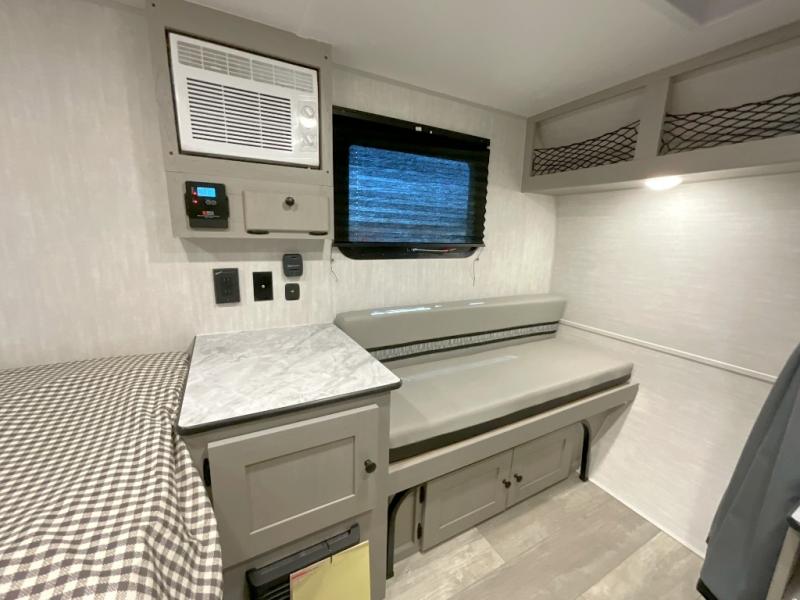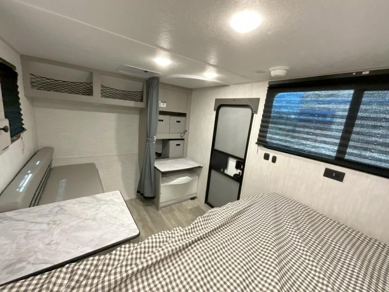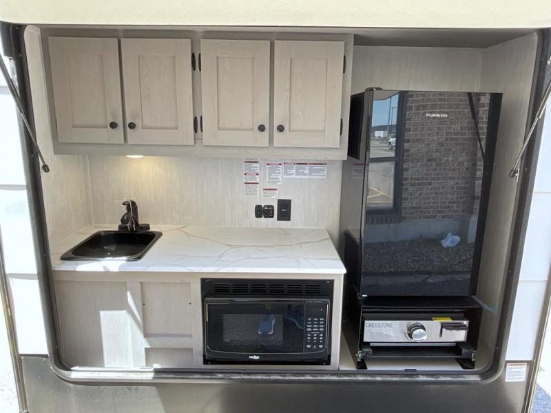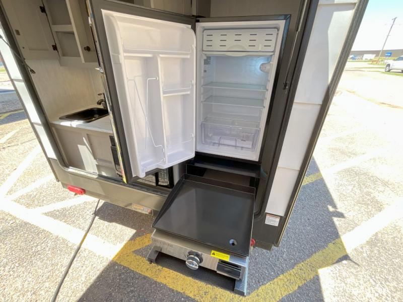 When you want to explore, choose this travel trailer for your basic off-road adventure needs and a bit more by offering you a 54" X 74" flip-up bed with storage beneath, and gaucho seating that pulls out into a bed for an additional camper at night. There is front and rear overhead cabinetry for storage, and a cassette toilet for added convenience especially at night. A rear hatch camp kitchen provides a place for you to create meals and snacks while you explore. There is a slide-out griddle and grill combo cooktop, a 3.3 cu. ft. 12-volt refrigerator for your cold items, a single sink, and two burner cooktop, plus a microwave oven. A 9' power awning creates a bit of added outdoor living space where you can set up your camp chairs. You can also add an optional roof-top tent for additional sleeping.