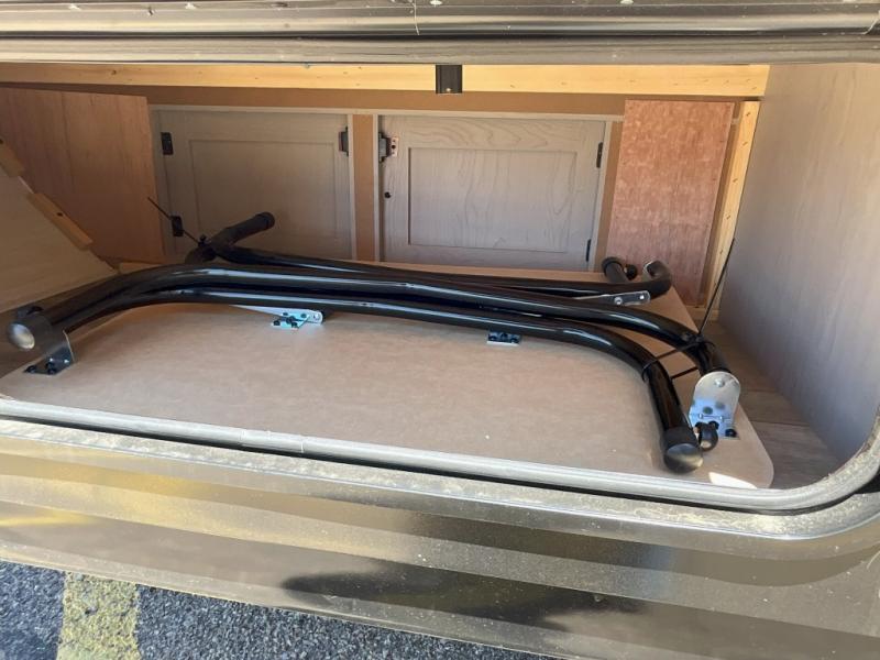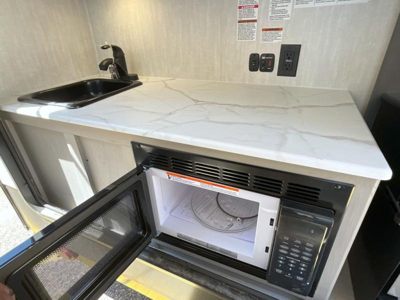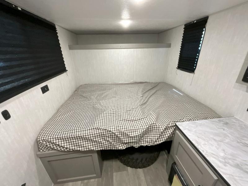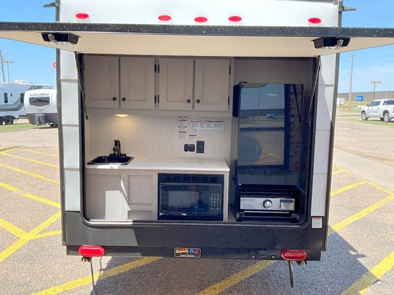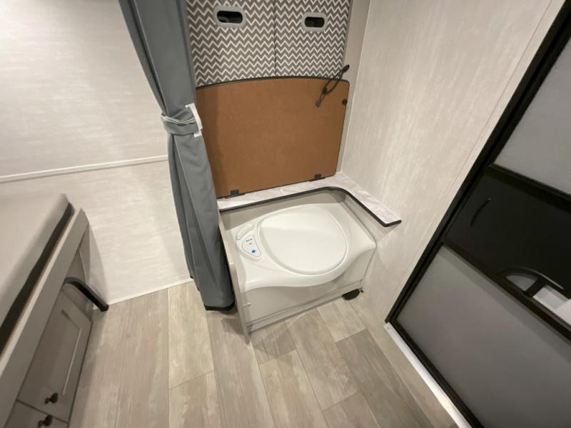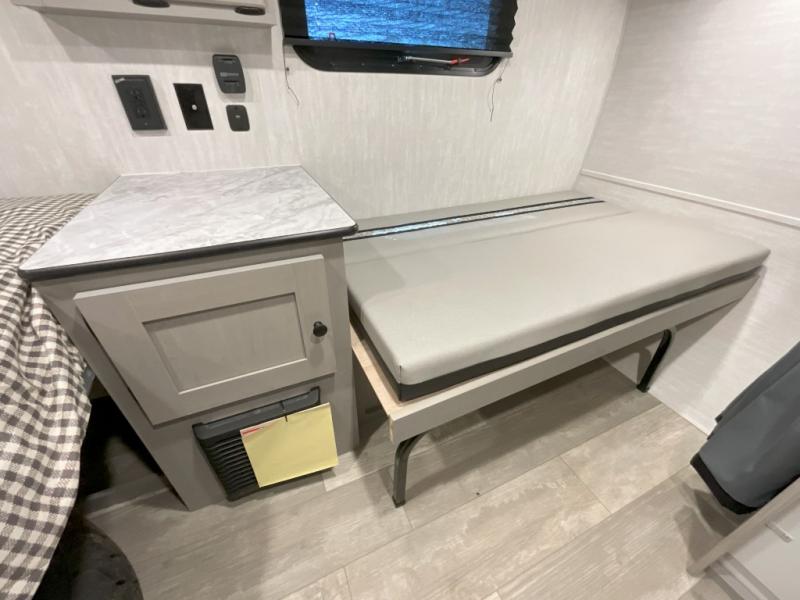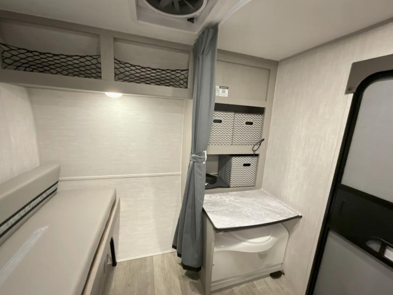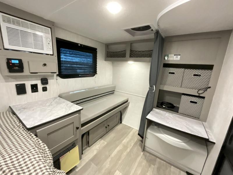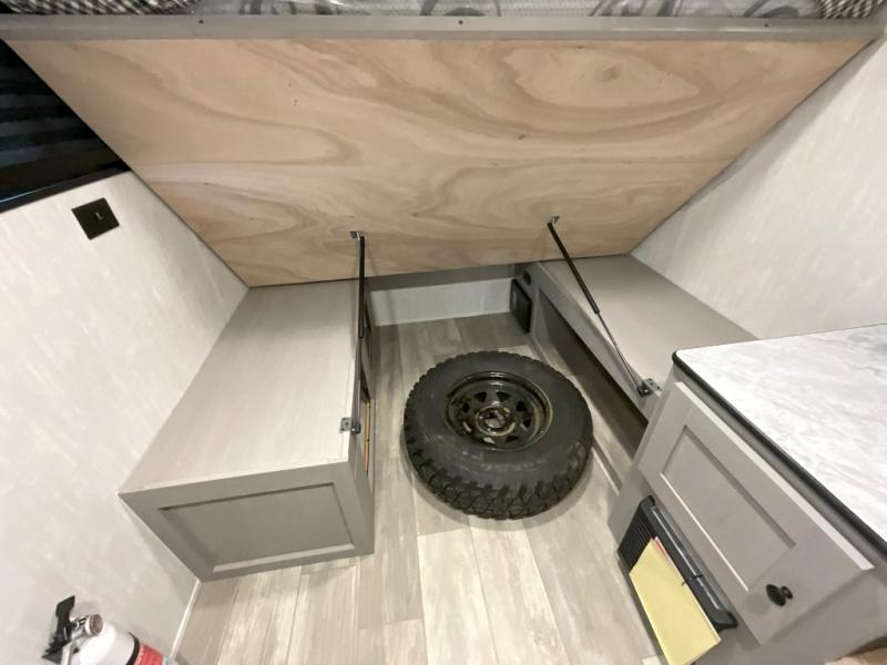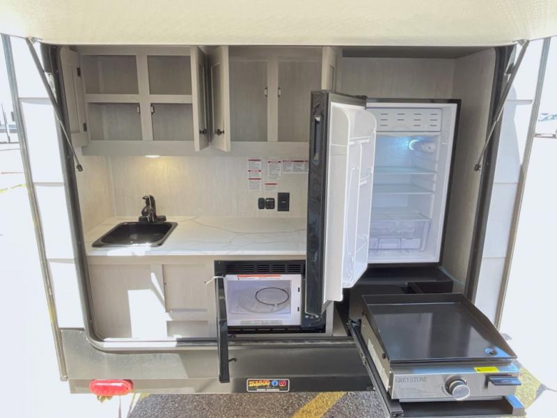 When you want to explore, choose this travel trailer for your basic off-road adventure needs and a bit more by offering you a 54" X 74" flip-up bed with storage beneath, and gaucho seating that pulls out into a bed for an additional camper at night. There is front and rear overhead cabinetry for storage, and a cassette toilet for added convenience especially at night. A rear hatch camp kitchen provides a place for you to create meals and snacks while you explore. There is a slide-out griddle and grill combo cooktop, a 3.3 cu. ft. 12-volt refrigerator for your cold items, a single sink, and two burner cooktop, plus a microwave oven. A 9' power awning creates a bit of added outdoor living space where you can set up your camp chairs. You can also add an optional roof-top tent for additional sleeping.