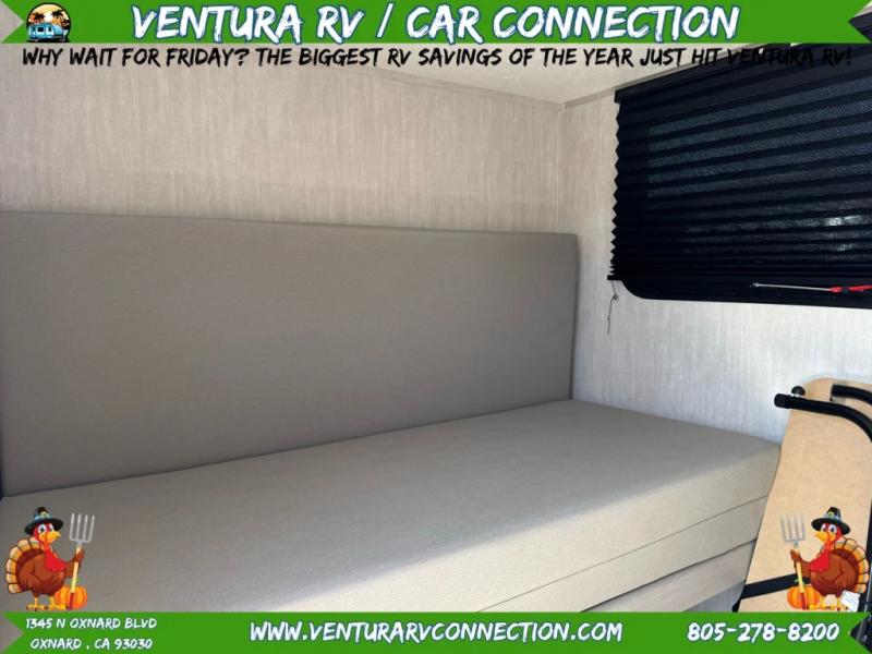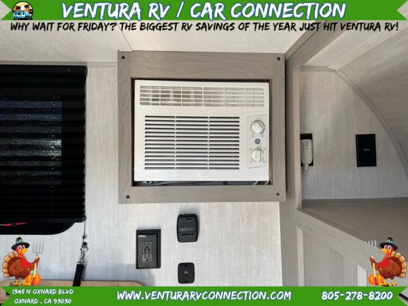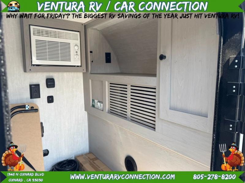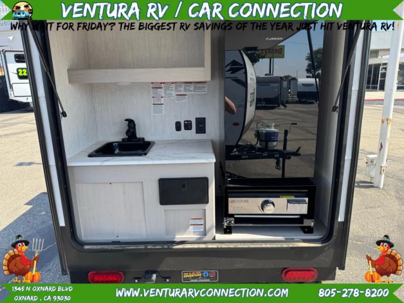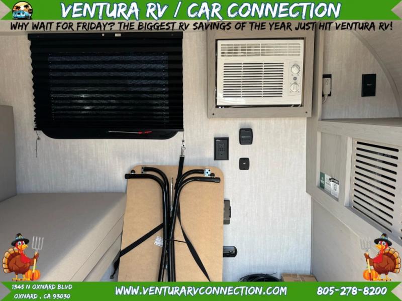 This travel trailer features a little more interior space since there is a flip-up bench seat that folds down to a 54" x 72" bed, and the portable table provides a place to dine together. You'll also find a storage cabinet, a 20K furnace and an A/C cabinet to keep you comfortable. The rear hatch kitchen includes a slide-out griddle to cook meals plus a 3.3 cu. ft. 12V refrigerator and cabinet for food storage.