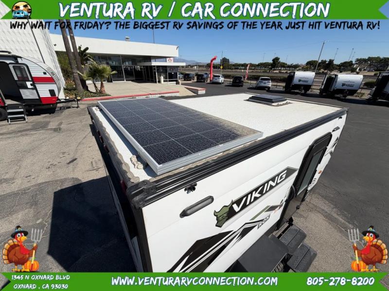 These Viking ROK travel trailers allow you to camp anywhere you want, even off the beaten path a bit. Each model features electric brakes, easy lube axles, and 15" off-road heavy duty tires. There are frame-mounted stabilizer jacks to help keep your unit secure, and the outside shower with hot/cold water will come in handy when rinsing off hiking gear. A 5K BTU A/C unit and 20K BTU propane furnace will keep you comfortable as you camp, and there are 12V outlets along with 110V outlets to keep your electronics charged. An optional roof top tent can be added if you're needing additional sleeping space, and if you choose the optional Solar Package with a 200W panel and 30A solar controller, you can enjoy off-grid capabilities!