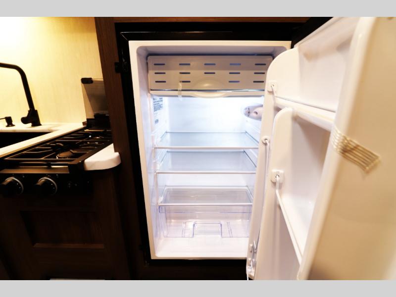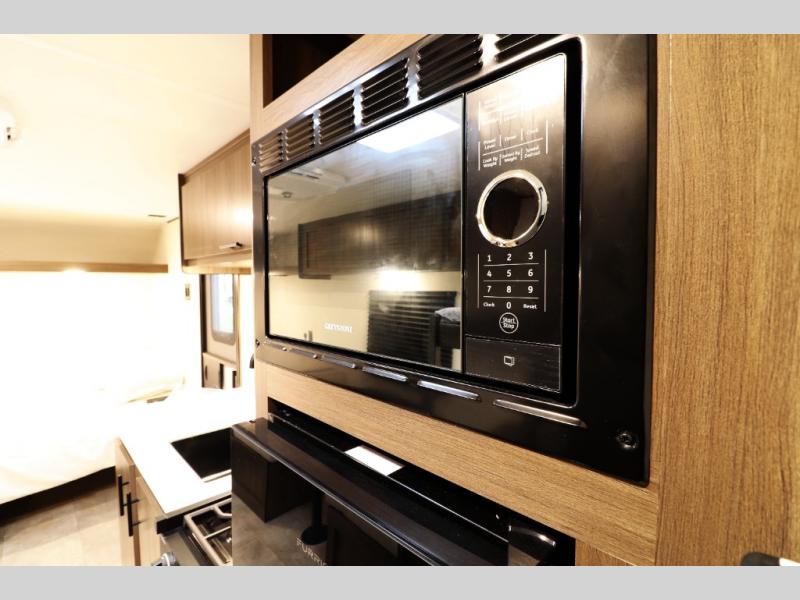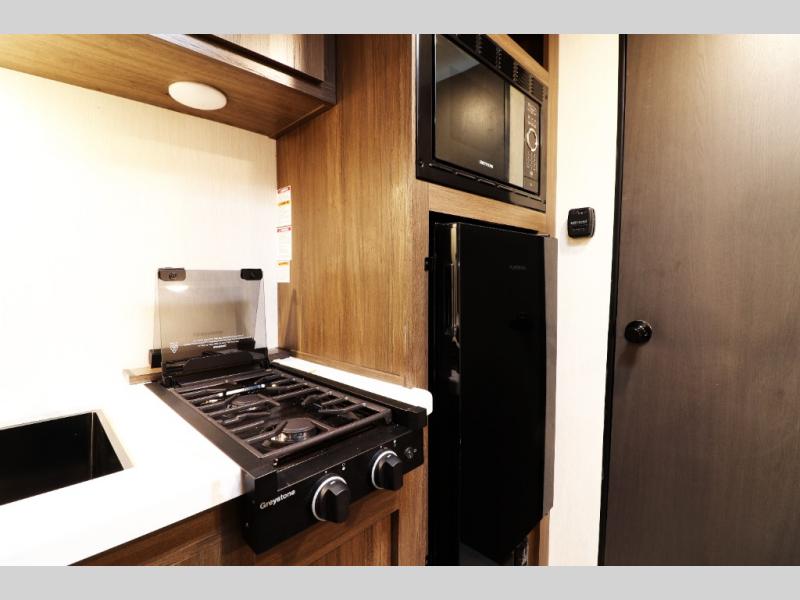 - 12V refrigerator, flush-mount 2-burner range, and microwave