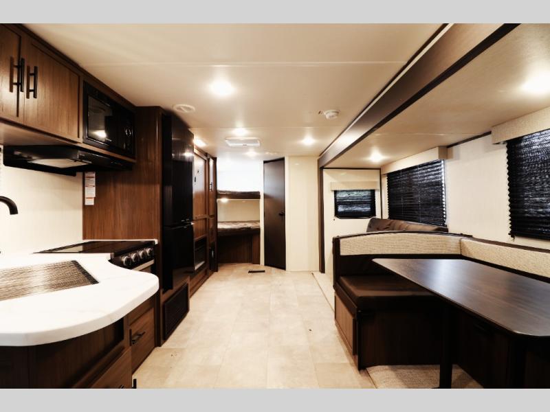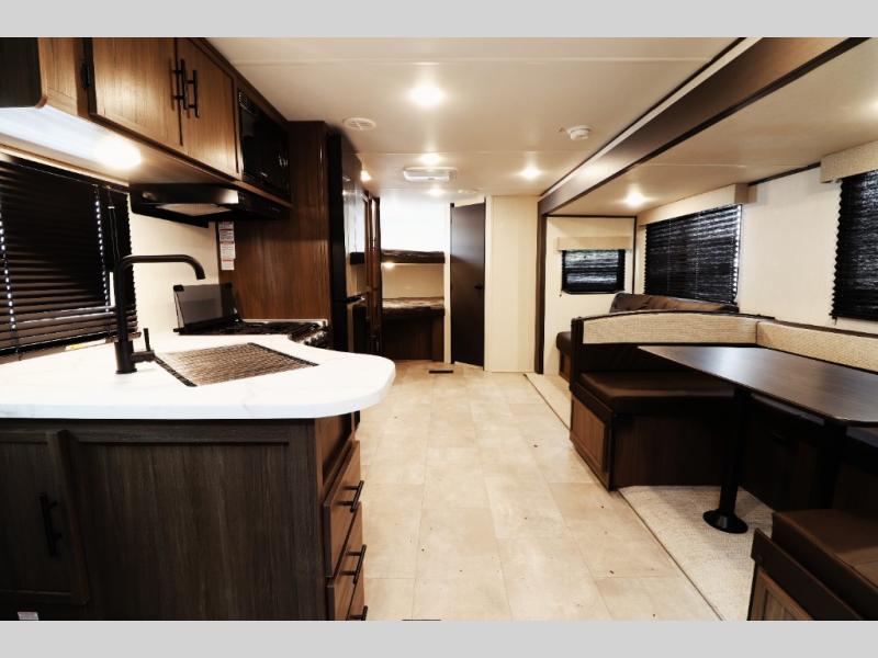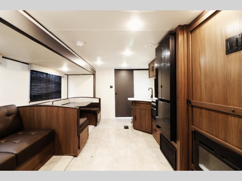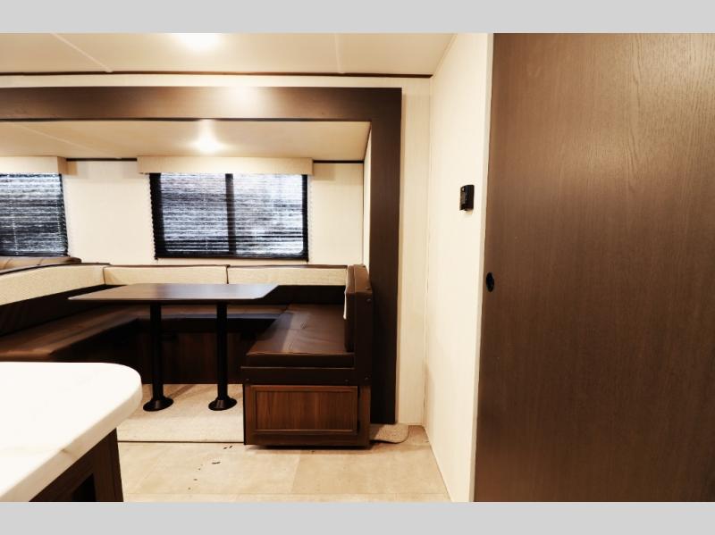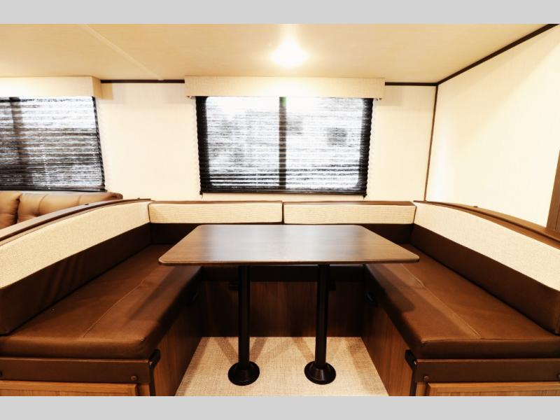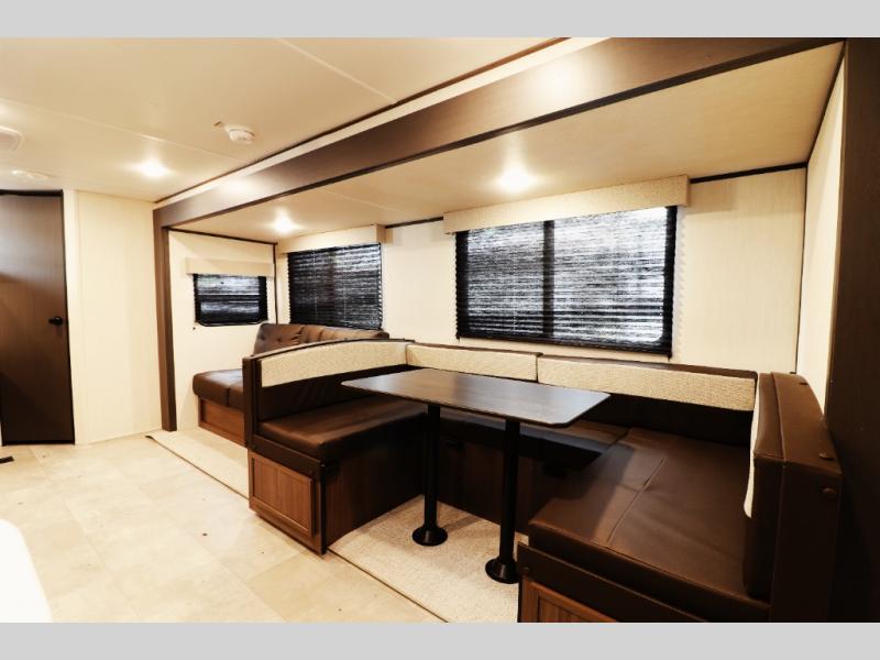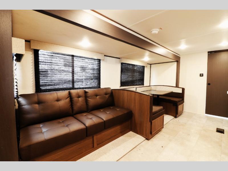 Spacious & Flexible Layout – A 31'7" travel trailer with a rear living area featuring a jack-knife sofa, sleeper dinette, and panoramic windows—ideal for family movie nights or your morning coffee ritual.