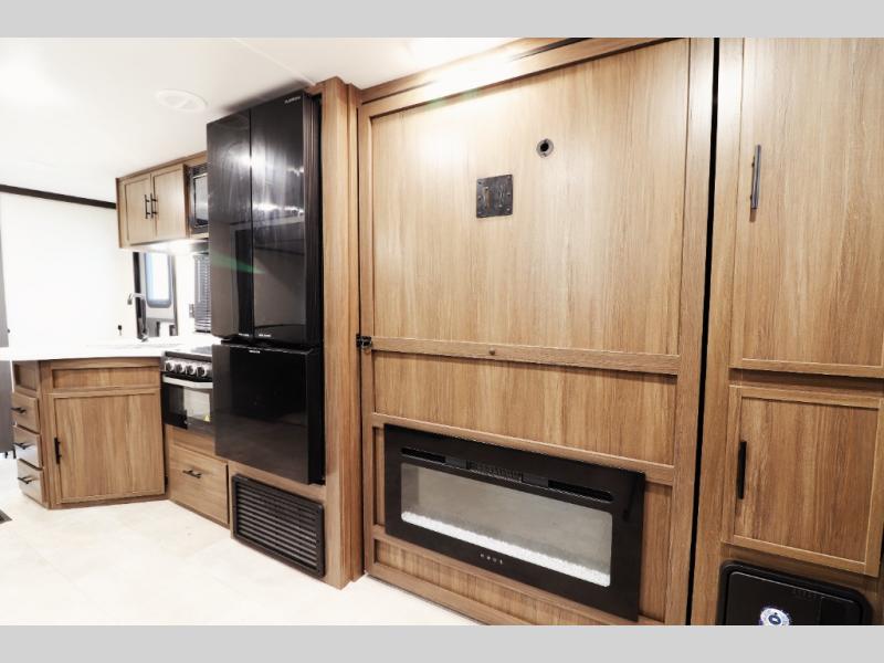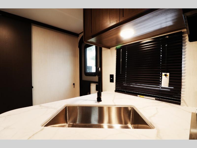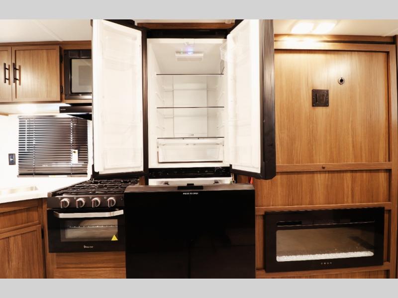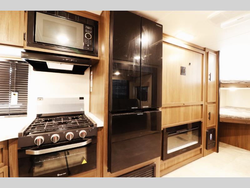 Full Galley Kitchen – XL stainless sink, high-rise faucet, three-burner range, oven, microwave (with air-fryer option), and large 10.6 cu ft refrigerator—great for prepping meals on the road.