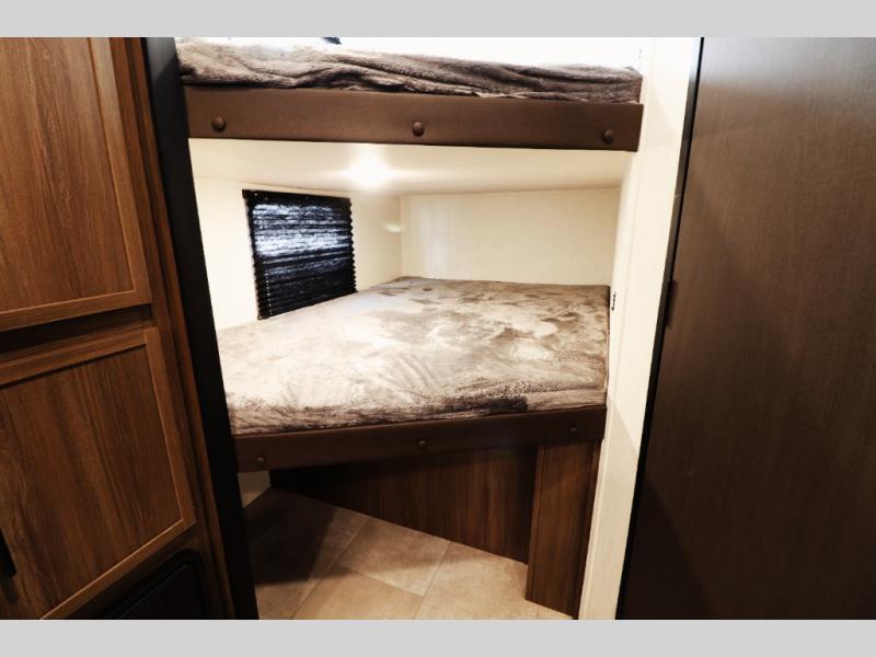 Private Primary Suite & Bunk Area – Front walk-around queen bed with dual closets and sliding door, plus cozy bunk beds with plush "teddy bear" mattresses—great for kids or guests.