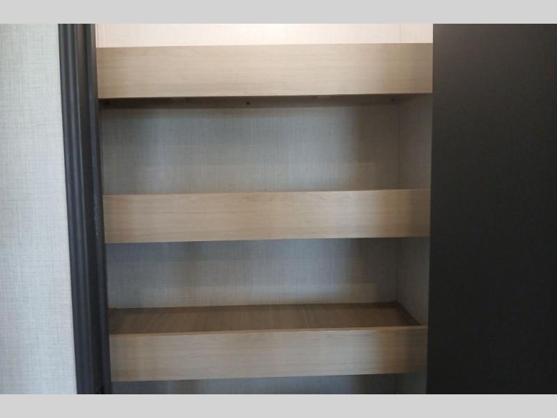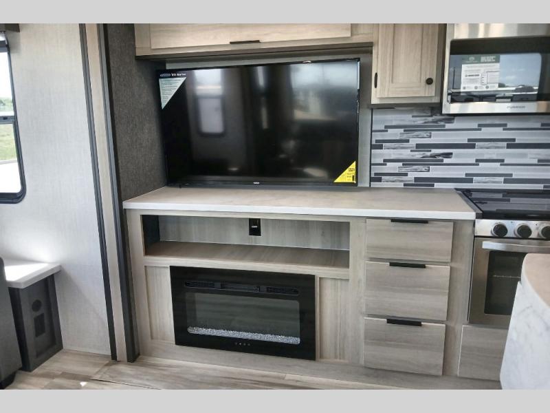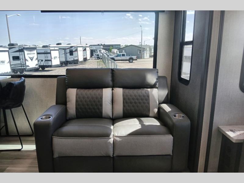 This triple slide out fifth wheel is perfect for weekend excursions or extended stays at the campground. Your crew can get comfortable on the rear hide-a-bed sofa or theater seating, and there is a hi-top table and chairs for dining space. The chef of your group will love the kitchen island with a flip-up counter for ample prep space, and there are two kitchen pantries to keep everything stocked. When you're not watching a movie with the LED TV and enjoying the fireplace, you can relax outdoors under the two power awnings. When it's time to call it a night, the king bed slide in the front bedroom is sure to bring a great night's rest, and you'll find a walk-in wardrobe.
