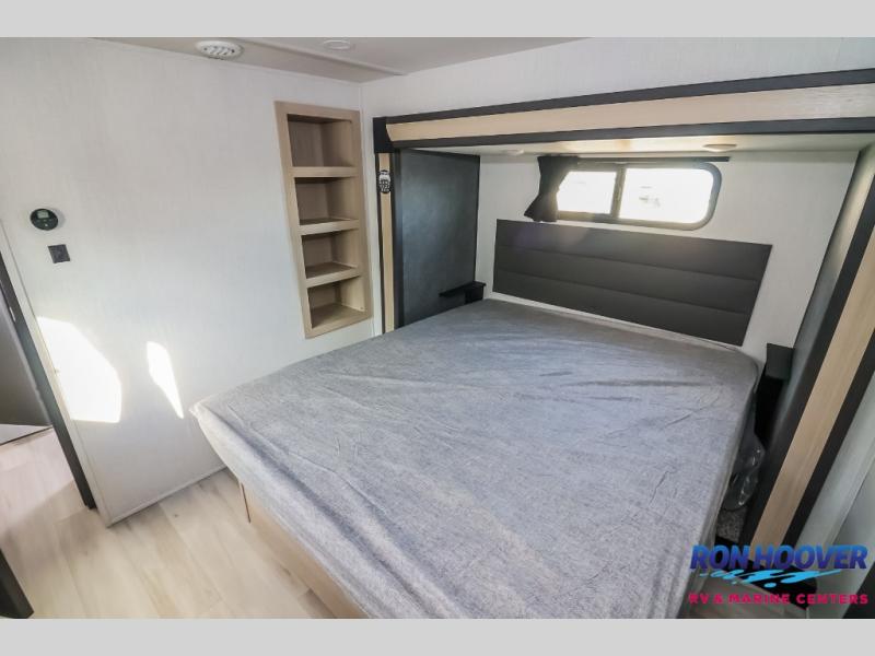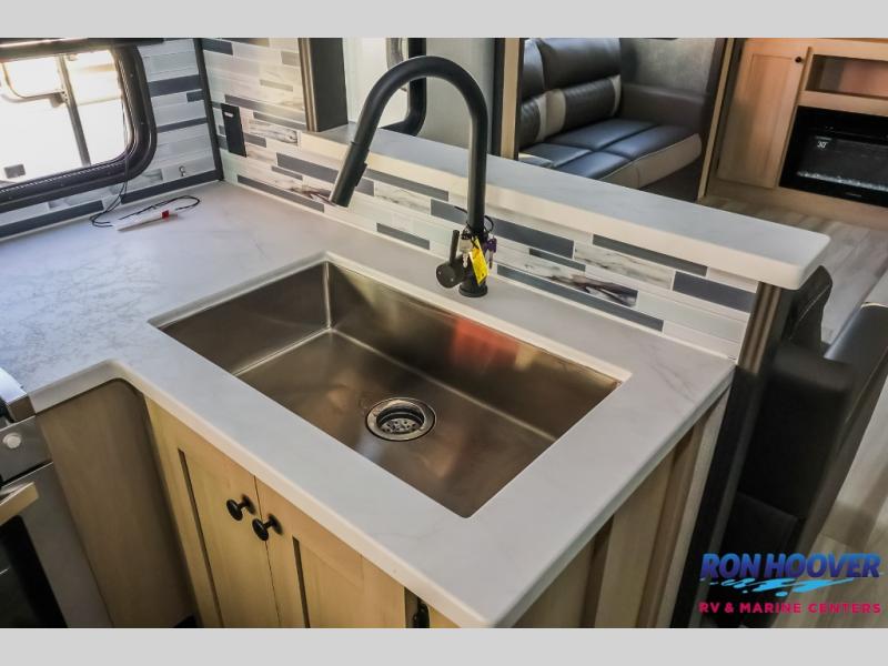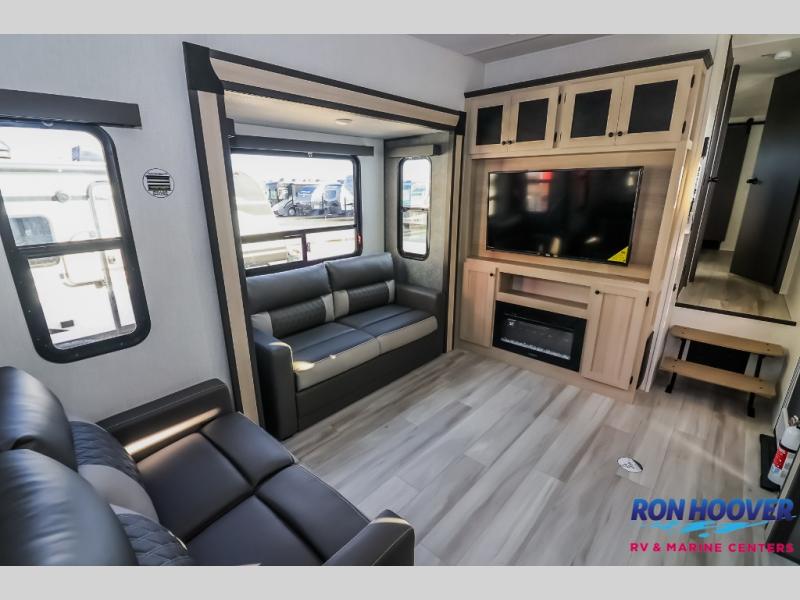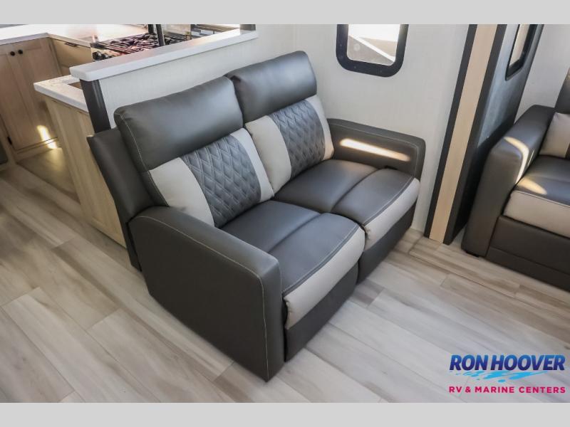 For the couple who love to cook, this fifth wheel is the perfect choice! There is generous counter space in the rear kitchen, along with overhead cabinetry, and a hi-top table and chairs for dining space. Beside the table is a desk with a chair and a campview window so you can still enjoy nature views if you have to work. When it's time to relax, the tri-fold sofa and theater seating in the living room will do the trick, or you can head outdoors to enjoy the two power awnings. A full bath will let you freshen up before bed, and speaking of bedtime, the king bed slide out in the front bedroom is sure to bring comfort. There is also a walk-in wardrobe with washer and dryer prep and a dresser to keep your space tidy!