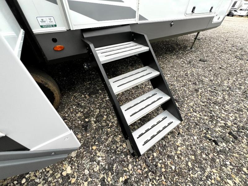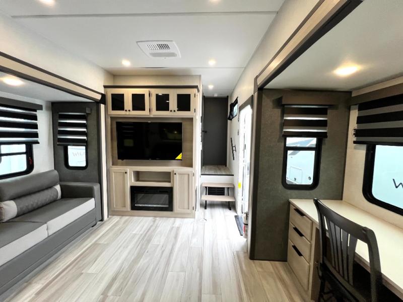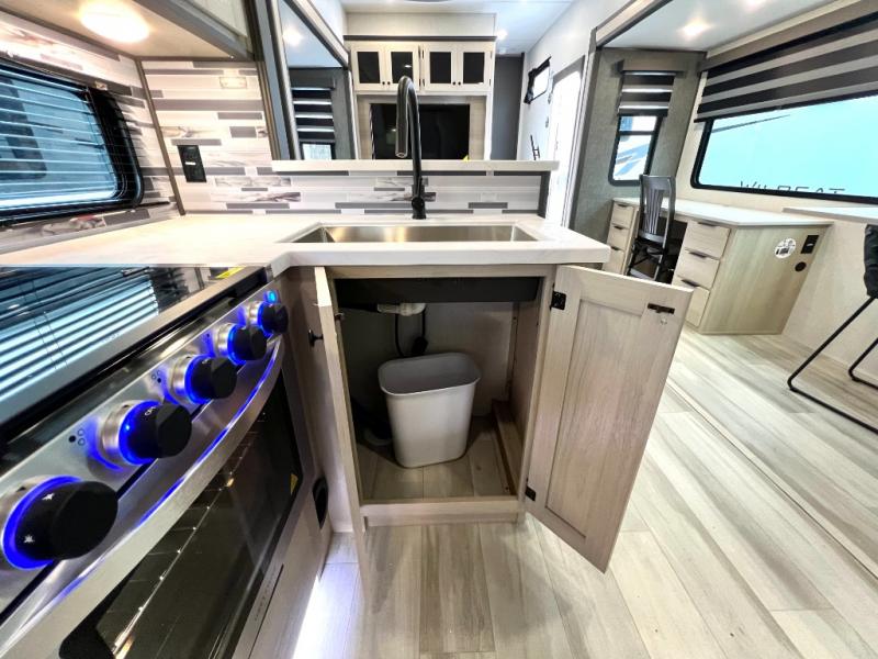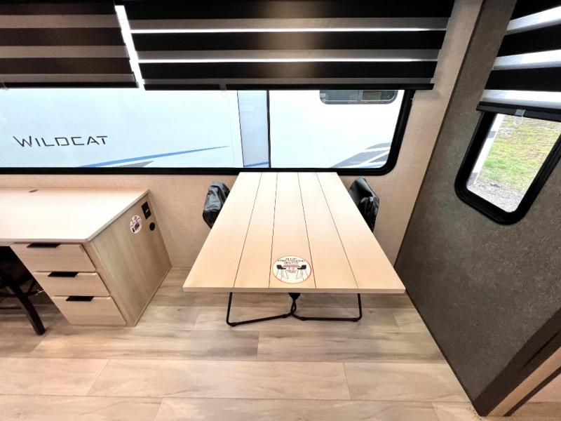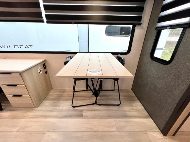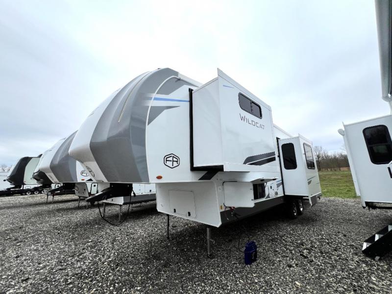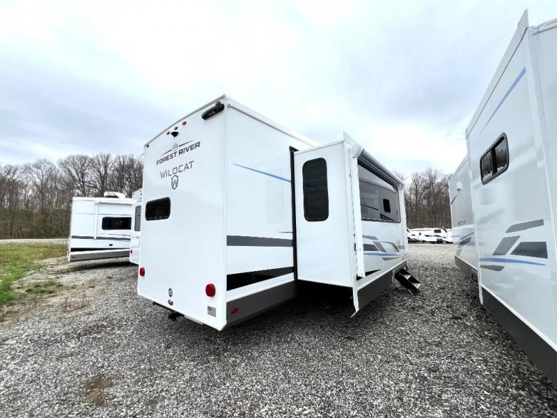 With any Wildcat fifth wheel by Forest River you will enjoy affordable luxury at every turn. These models are constructed with residential fiberglass insulation in the roof and floor, a sectioned ABS plastic underbelly armor, and a vacuum bonded, welded aluminum structure for added strength and durability. You will also find seamless roto-cast holding tanks, an outdoor shower, and 4-point auto leveling for quick and easy setup. Each model includes a best-in-class, high-efficiency 35,000 BTU furnace, along with a 18,000 BTU ducted A/C, with second and third A/C prep, plus an on-demand tankless water heater for added convenience. There are carpet-free living spaces, residential backsplash, motion lighting throughout, and many more comforts!
