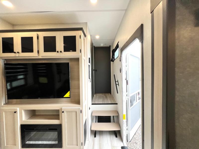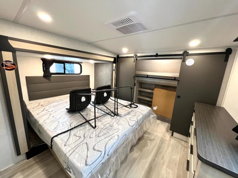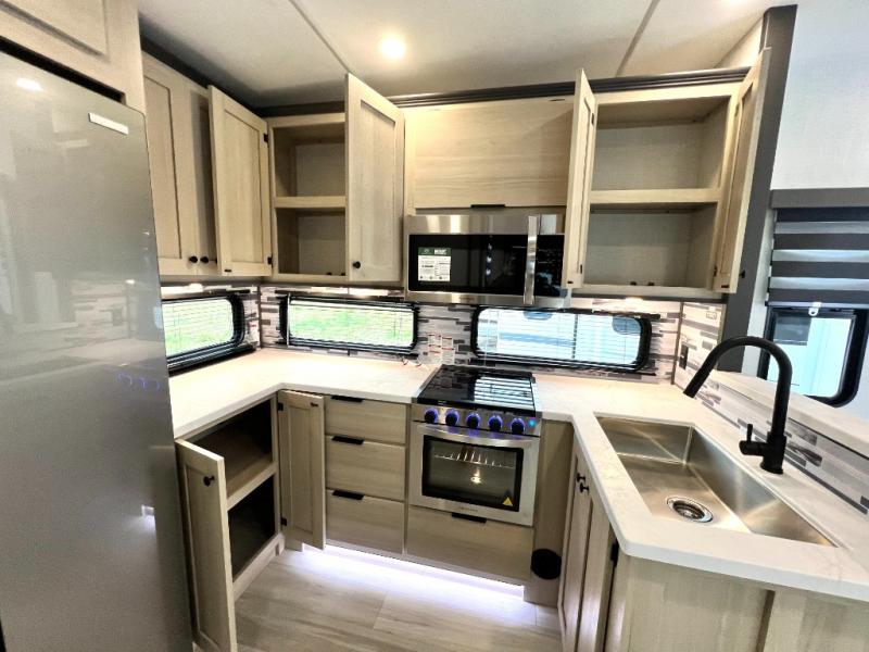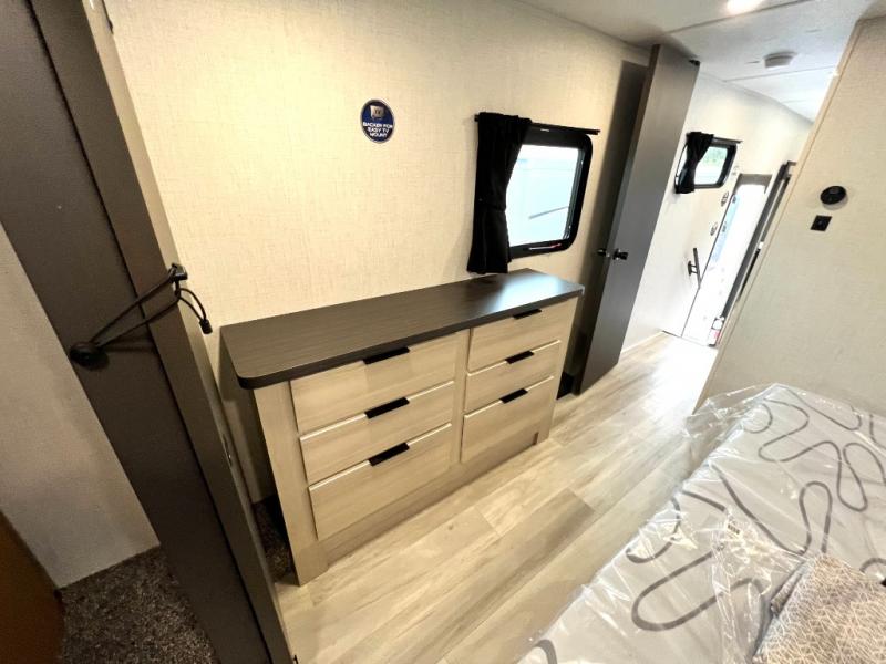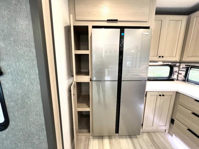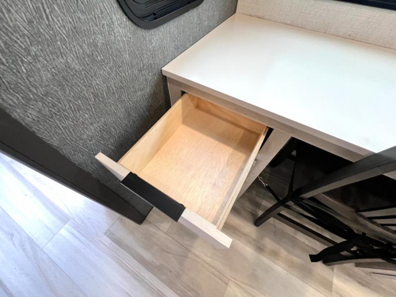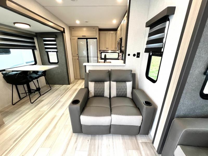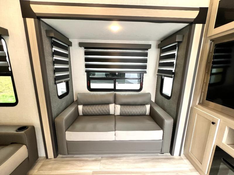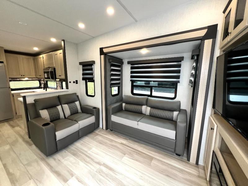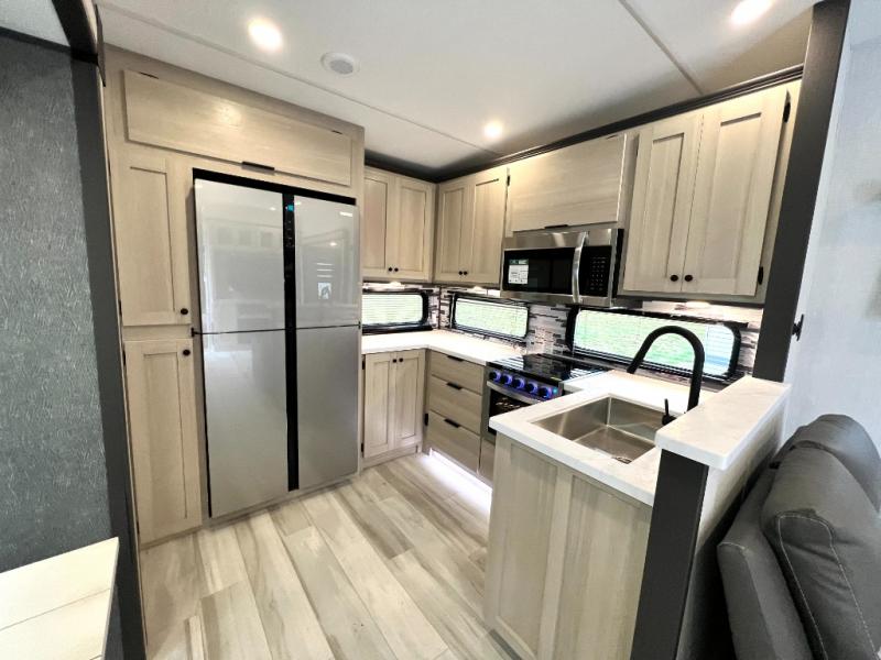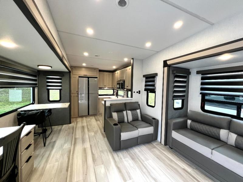 For the couple who love to cook, this fifth wheel is the perfect choice! There is generous counter space in the rear kitchen, along with overhead cabinetry, and a hi-top table and chairs for dining space. Beside the table is a desk with a chair and a campview window so you can still enjoy nature views if you have to work. When it's time to relax, the tri-fold sofa and theater seating in the living room will do the trick, or you can head outdoors to enjoy the two power awnings. A full bath will let you freshen up before bed, and speaking of bedtime, the king bed slide out in the front bedroom is sure to bring comfort. There is also a walk-in wardrobe with washer and dryer prep and a dresser to keep your space tidy!