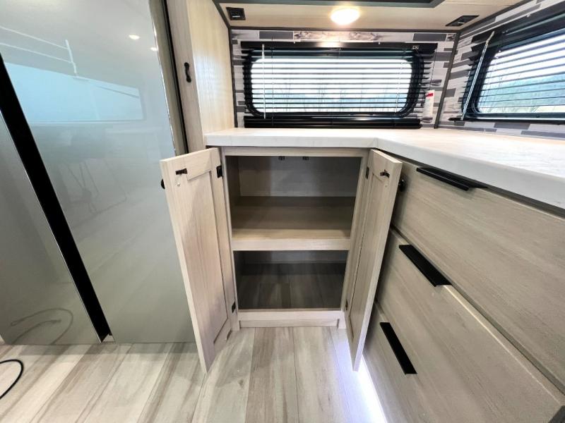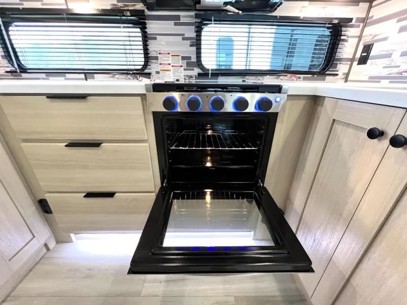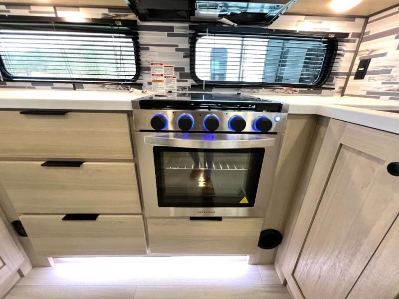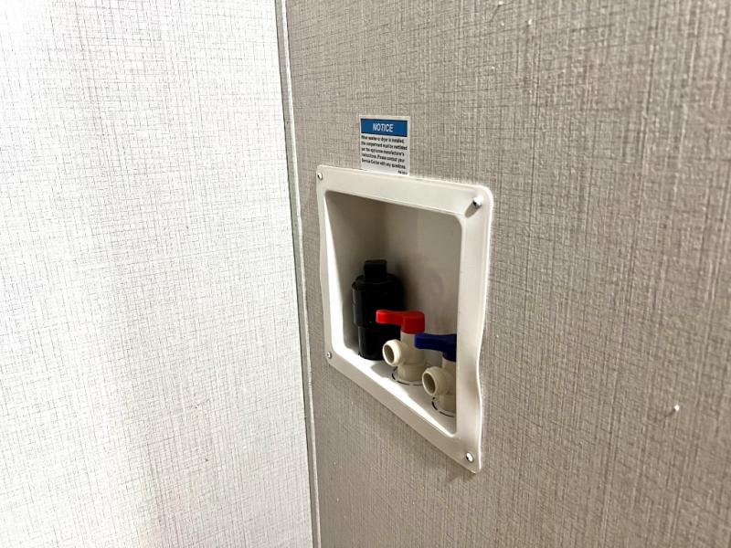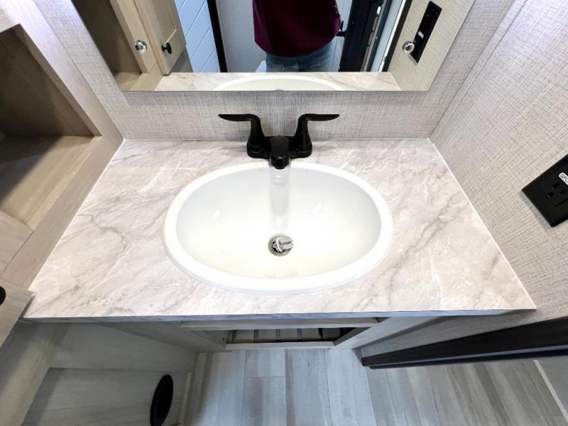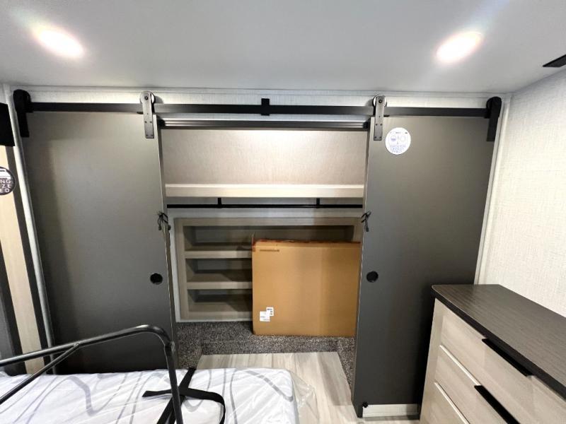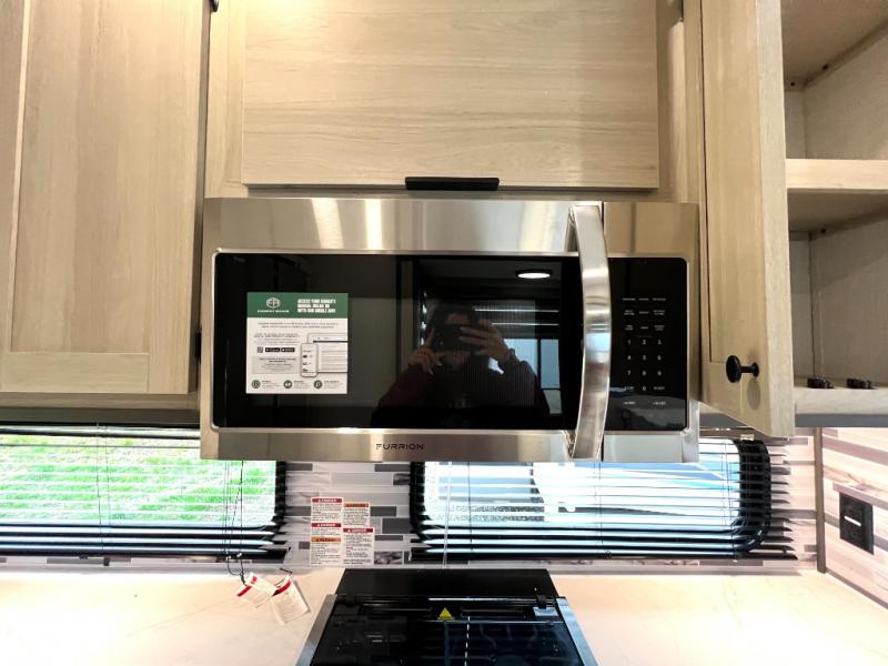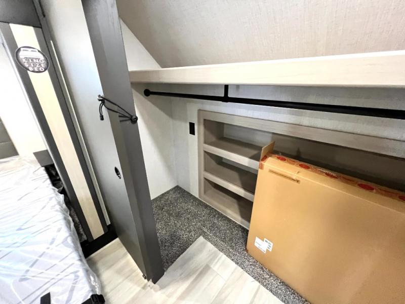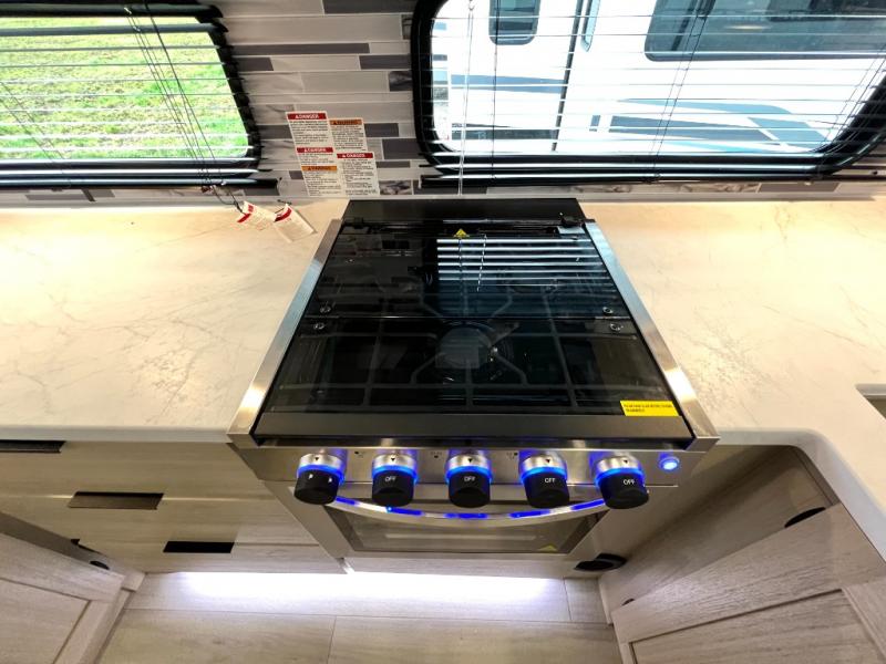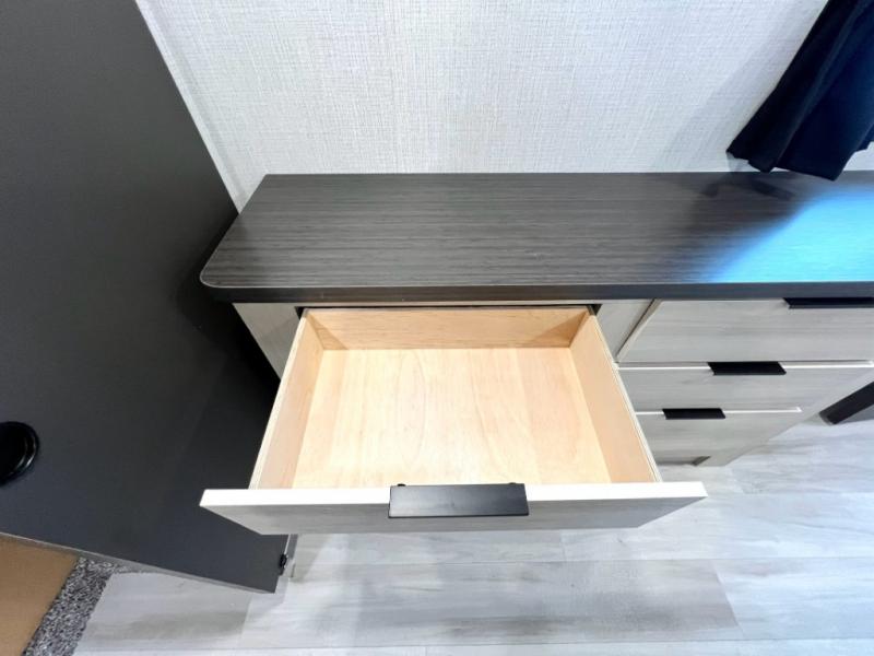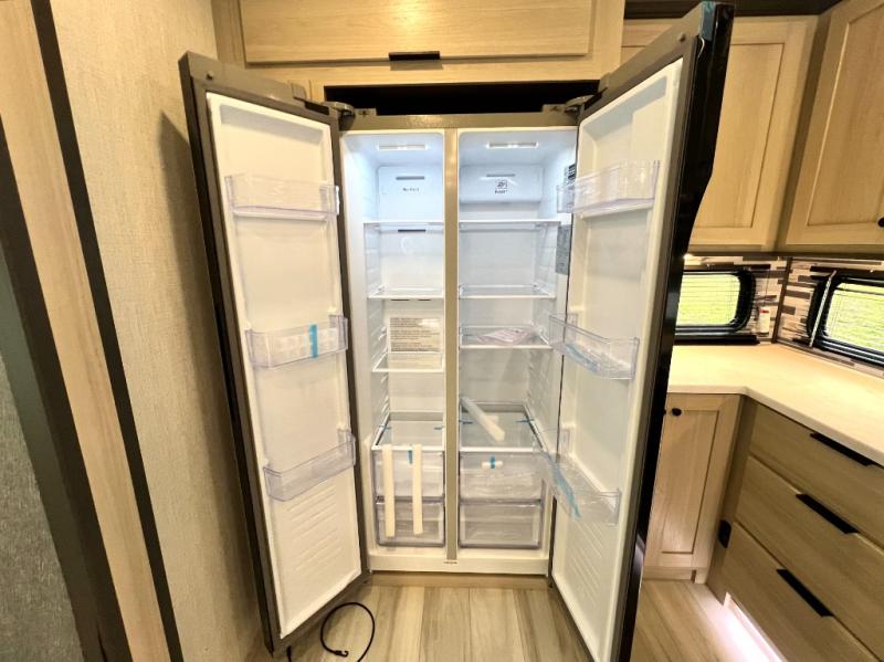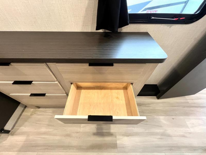 For the couple who love to cook, this fifth wheel is the perfect choice! There is generous counter space in the rear kitchen, along with overhead cabinetry, and a hi-top table and chairs for dining space. Beside the table is a desk with a chair and a campview window so you can still enjoy nature views if you have to work. When it's time to relax, the tri-fold sofa and theater seating in the living room will do the trick, or you can head outdoors to enjoy the two power awnings. A full bath will let you freshen up before bed, and speaking of bedtime, the king bed slide out in the front bedroom is sure to bring comfort. There is also a walk-in wardrobe with washer and dryer prep and a dresser to keep your space tidy!