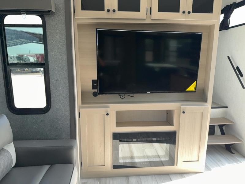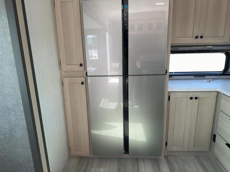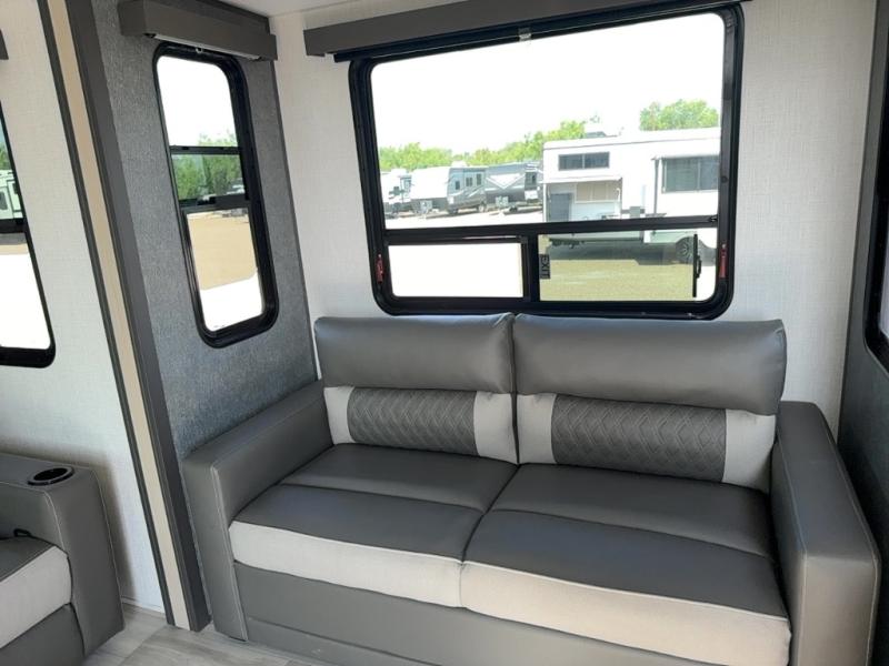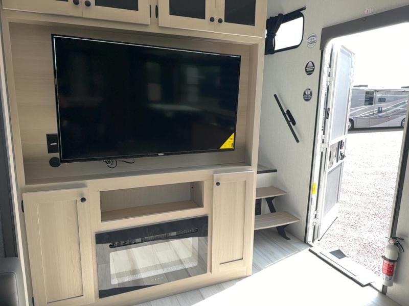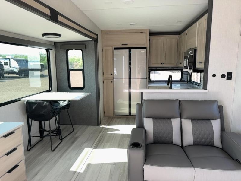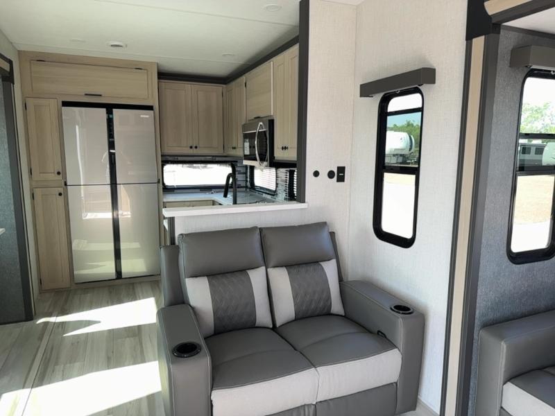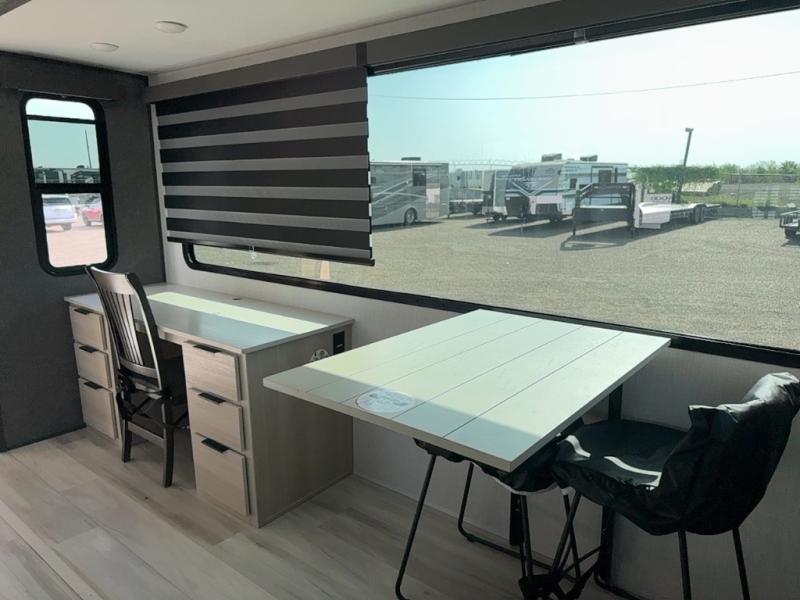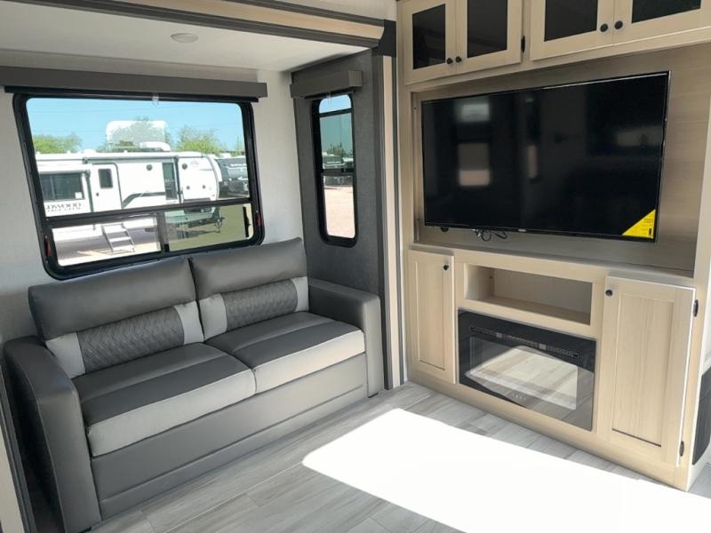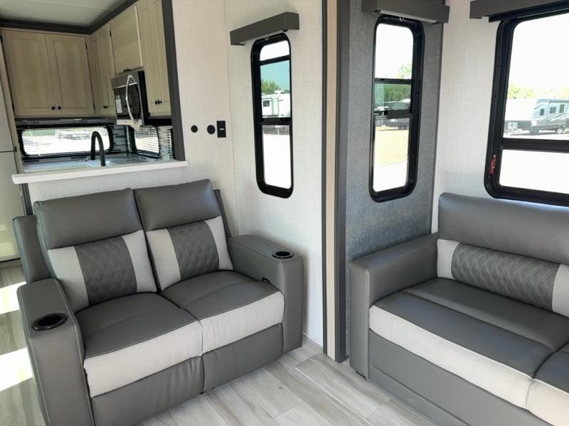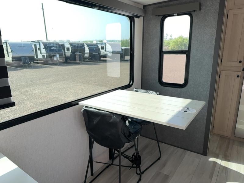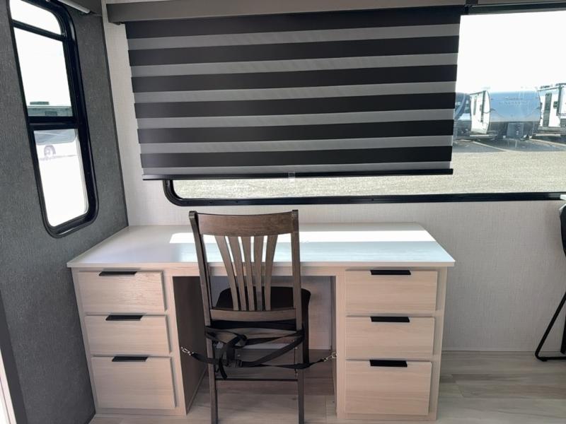 For the couple who love to cook, this fifth wheel is the perfect choice! There is generous counter space in the rear kitchen, along with overhead cabinetry, and a hi-top table and chairs for dining space. Beside the table is a desk with a chair and a campview window so you can still enjoy nature views if you have to work. When it's time to relax, the tri-fold sofa and theater seating in the living room will do the trick, or you can head outdoors to enjoy the two power awnings. A full bath will let you freshen up before bed, and speaking of bedtime, the king bed slide out in the front bedroom is sure to bring comfort. There is also a walk-in wardrobe with washer and dryer prep and a dresser to keep your space tidy!