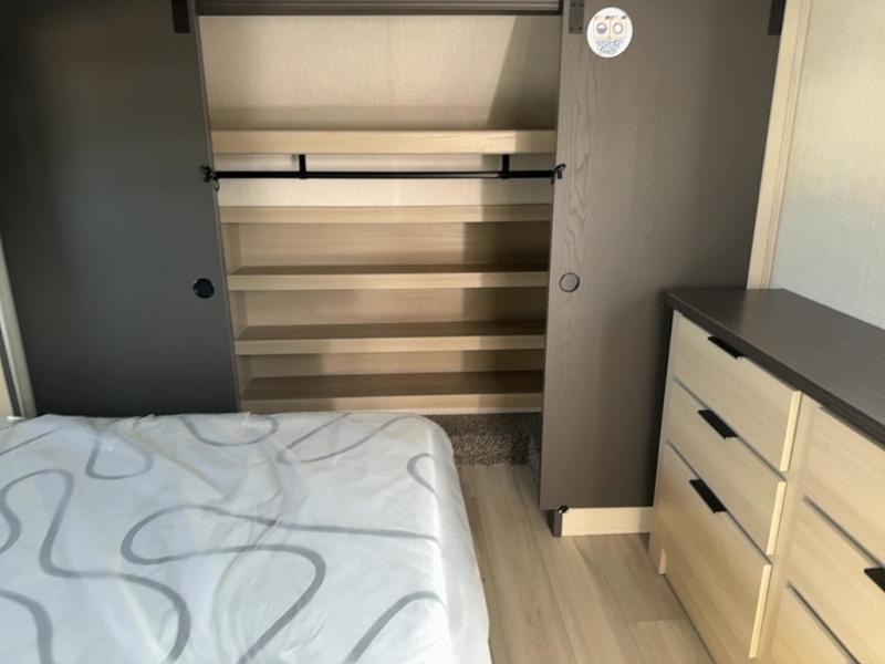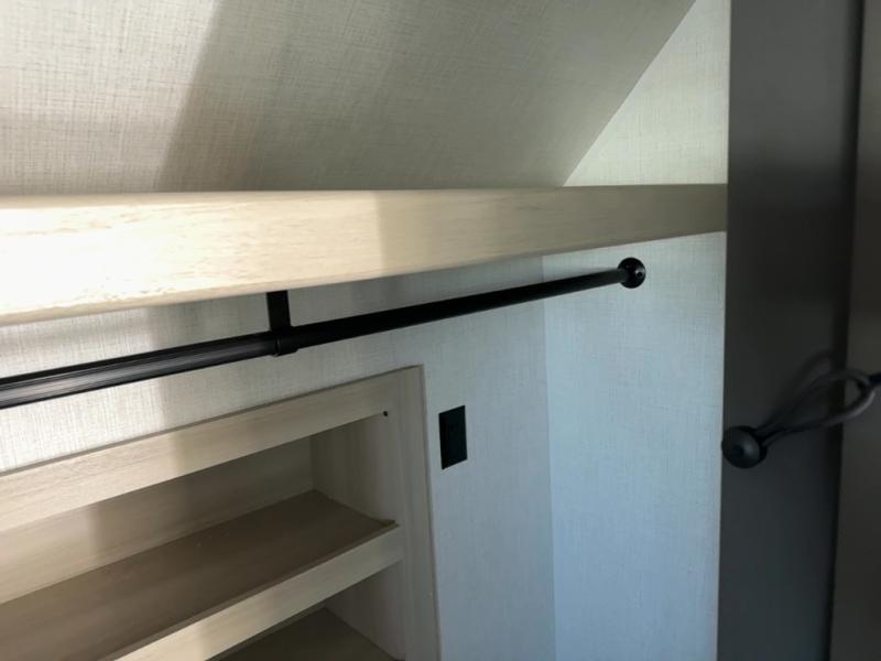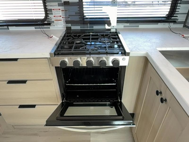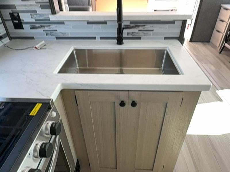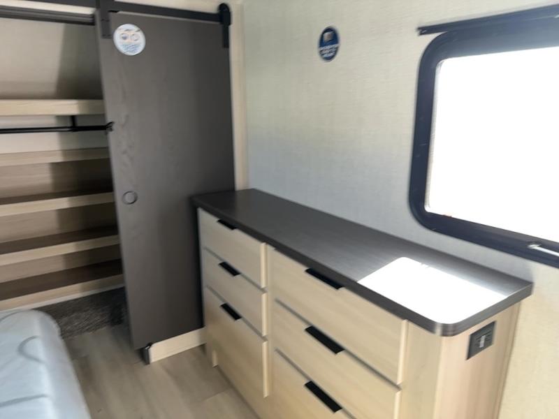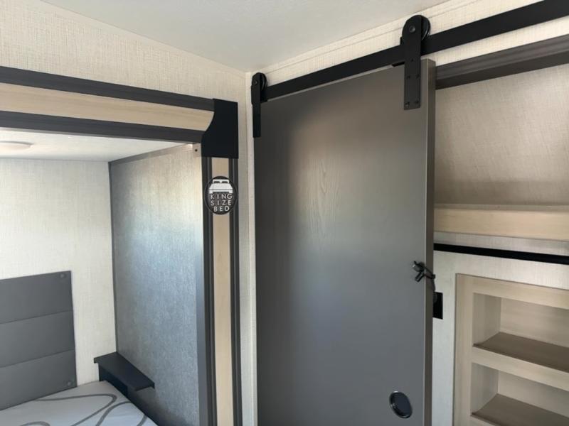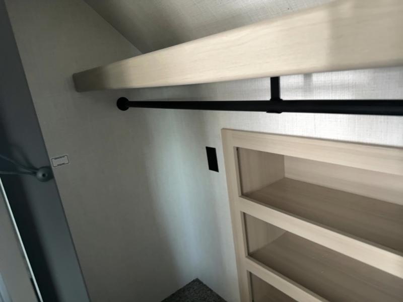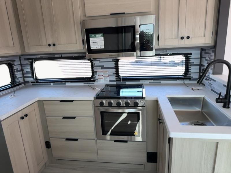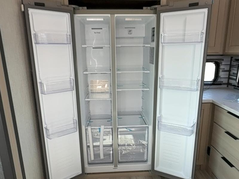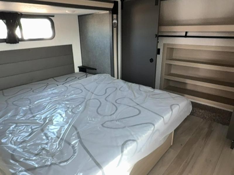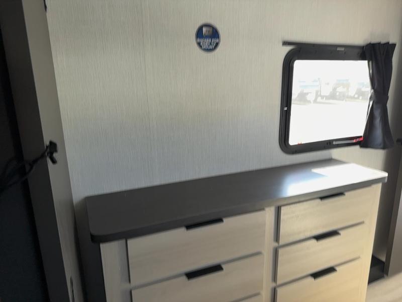 For the couple who love to cook, this fifth wheel is the perfect choice! There is generous counter space in the rear kitchen, along with overhead cabinetry, and a hi-top table and chairs for dining space. Beside the table is a desk with a chair and a campview window so you can still enjoy nature views if you have to work. When it's time to relax, the tri-fold sofa and theater seating in the living room will do the trick, or you can head outdoors to enjoy the two power awnings. A full bath will let you freshen up before bed, and speaking of bedtime, the king bed slide out in the front bedroom is sure to bring comfort. There is also a walk-in wardrobe with washer and dryer prep and a dresser to keep your space tidy!