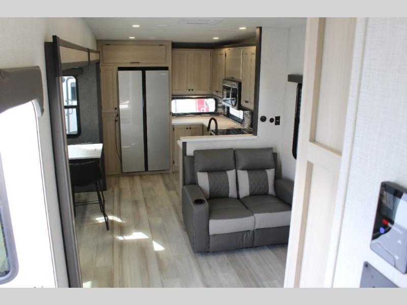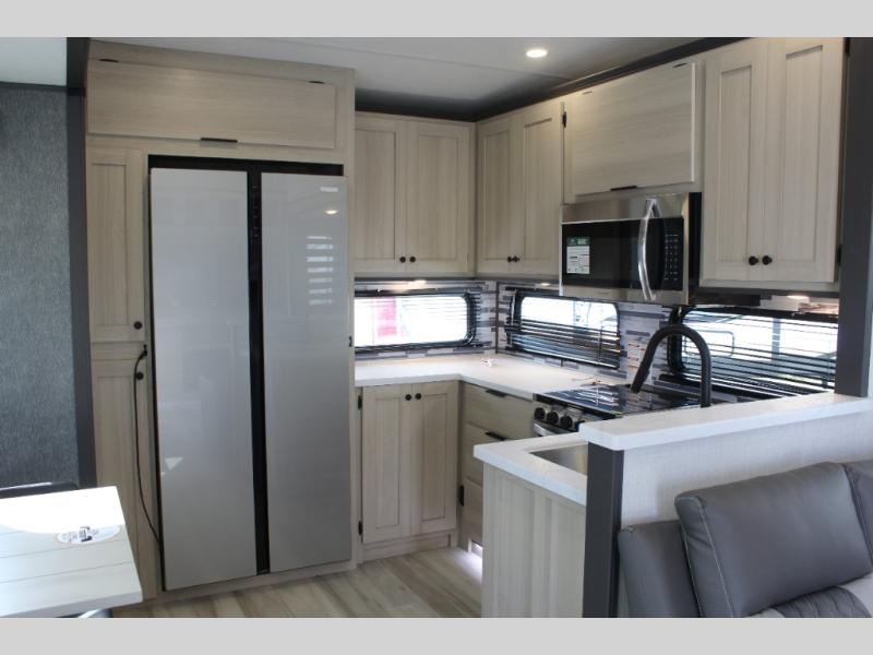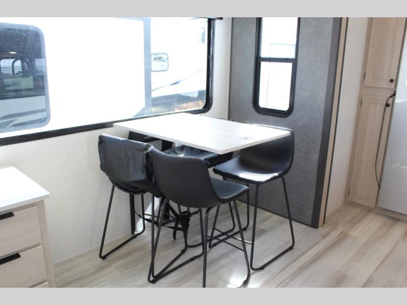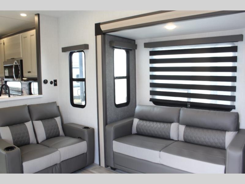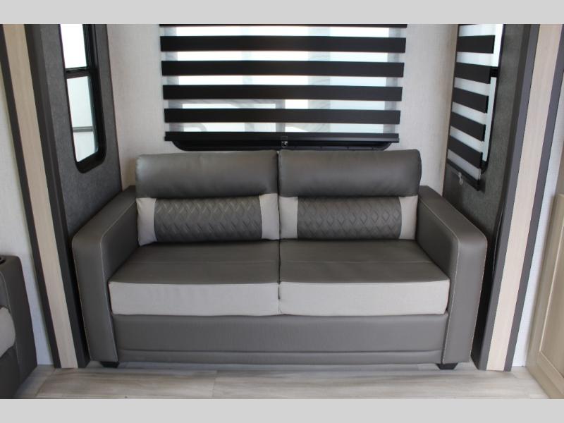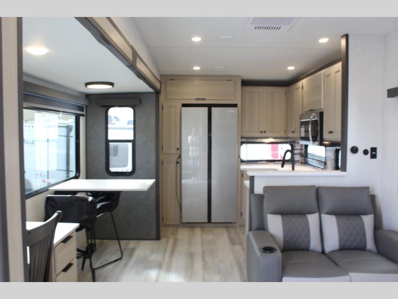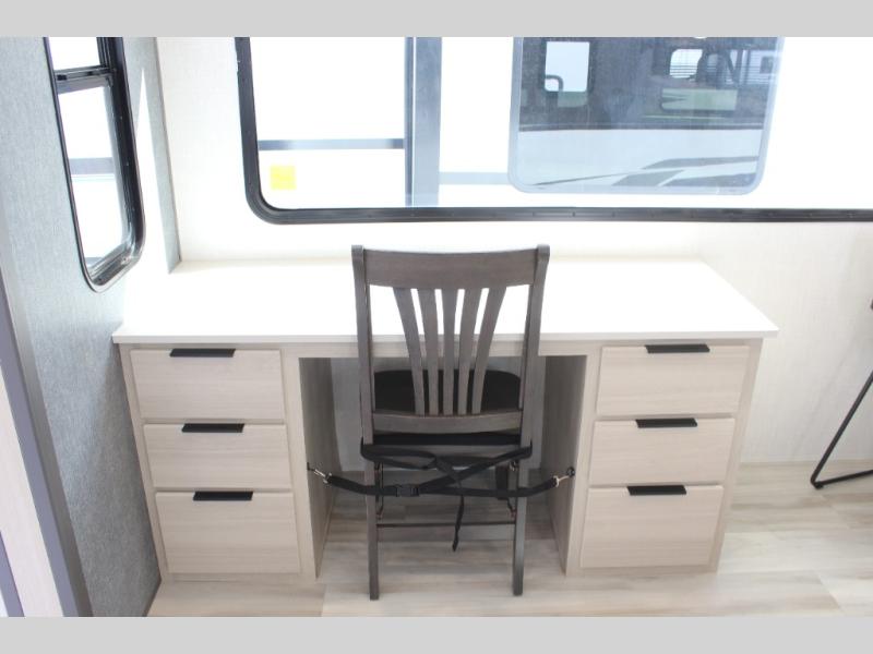 For the couple who love to cook, this fifth wheel is the perfect choice! There is generous counter space in the rear kitchen, along with overhead cabinetry, and a hi-top table and chairs for dining space. Beside the table is a desk with a chair and a campview window so you can still enjoy nature views if you have to work. When it's time to relax, the tri-fold sofa and theater seating in the living room will do the trick, or you can head outdoors to enjoy the two power awnings. A full bath will let you freshen up before bed, and speaking of bedtime, the king bed slide out in the front bedroom is sure to bring comfort. There is also a walk-in wardrobe with washer and dryer prep and a dresser to keep your space tidy!