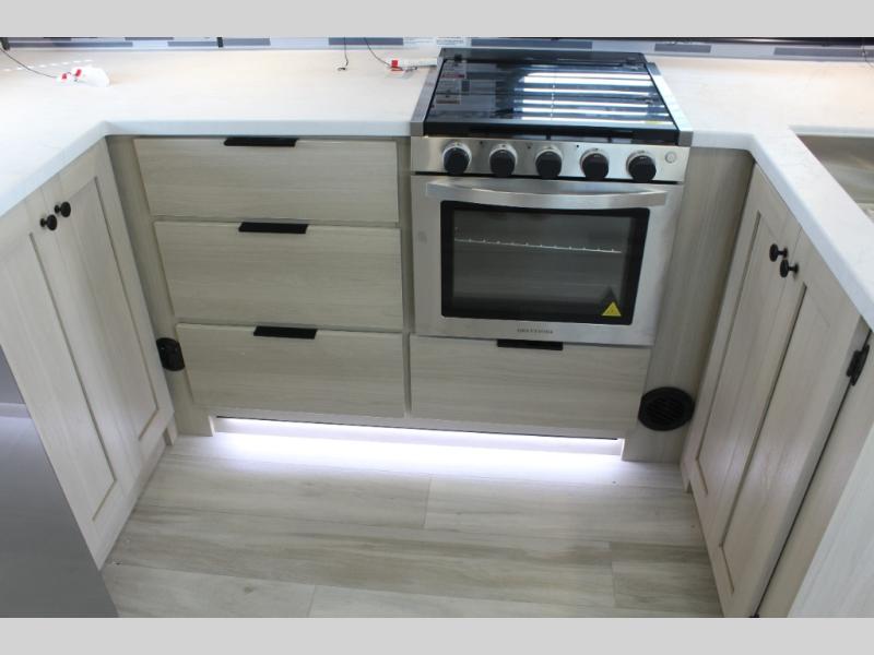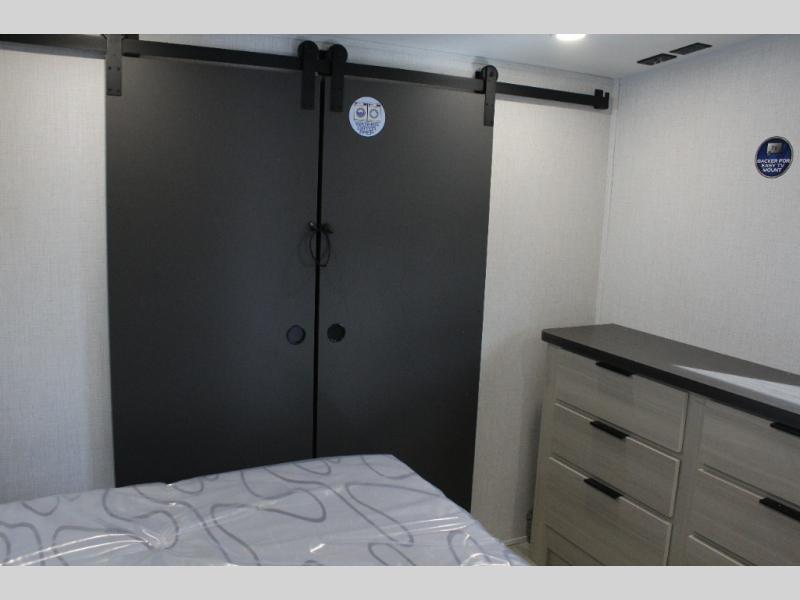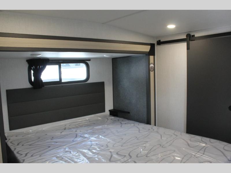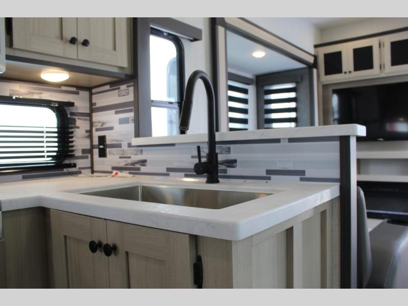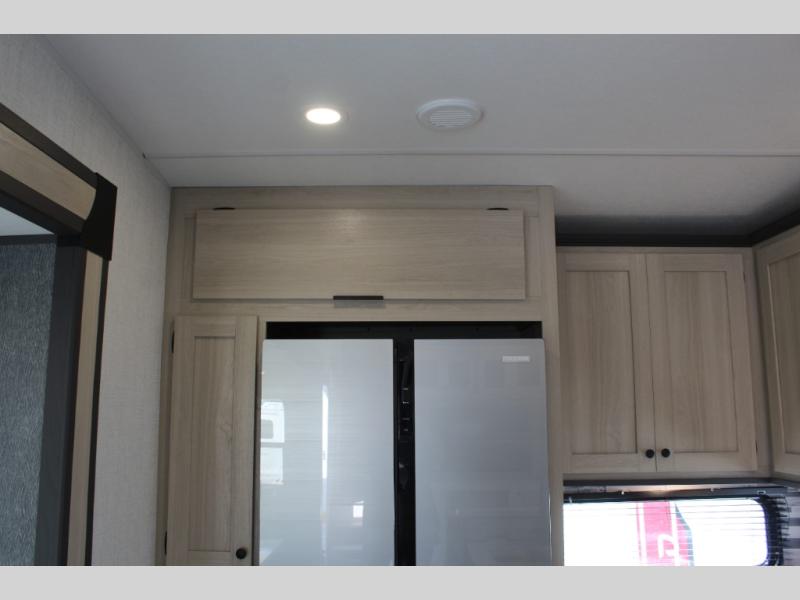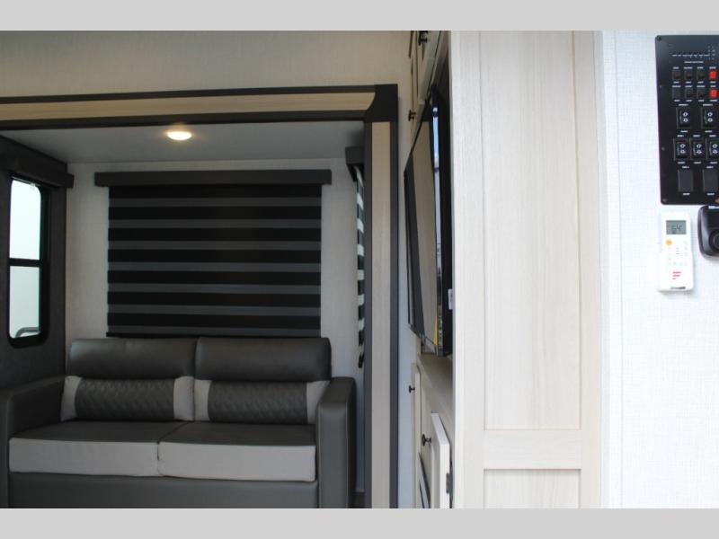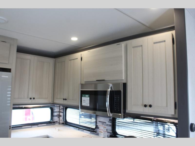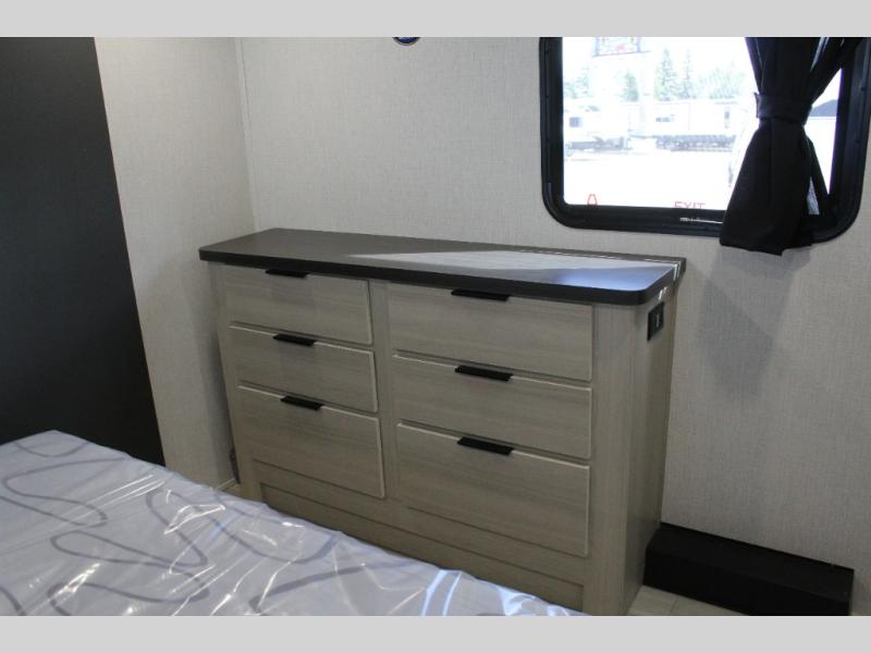 For the couple who love to cook, this fifth wheel is the perfect choice! There is generous counter space in the rear kitchen, along with overhead cabinetry, and a hi-top table and chairs for dining space. Beside the table is a desk with a chair and a campview window so you can still enjoy nature views if you have to work. When it's time to relax, the tri-fold sofa and theater seating in the living room will do the trick, or you can head outdoors to enjoy the two power awnings. A full bath will let you freshen up before bed, and speaking of bedtime, the king bed slide out in the front bedroom is sure to bring comfort. There is also a walk-in wardrobe with washer and dryer prep and a dresser to keep your space tidy!