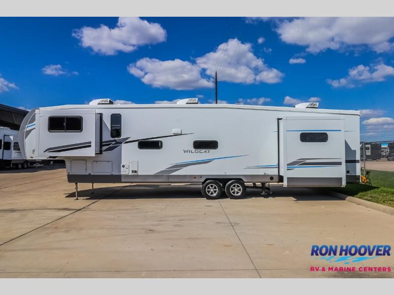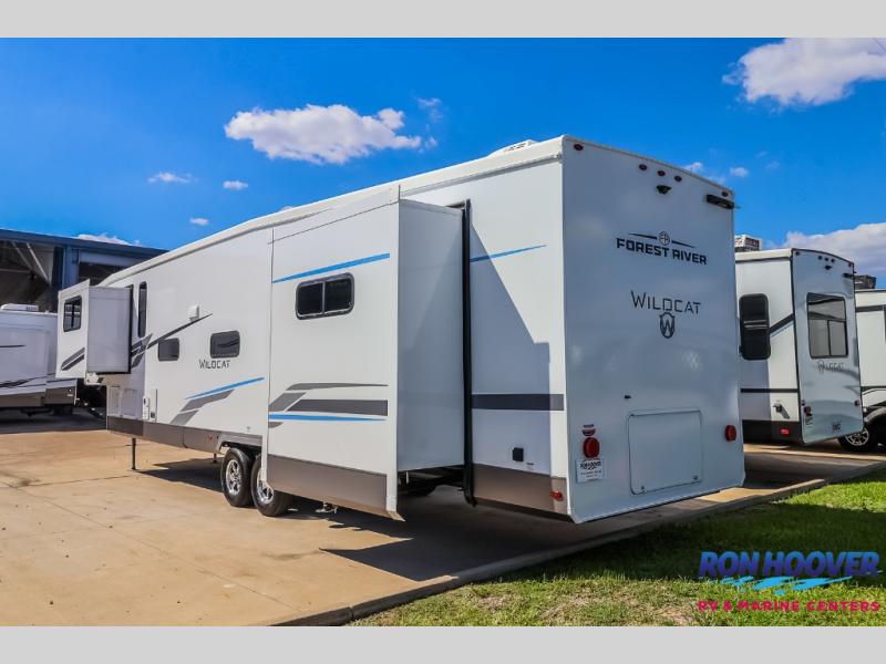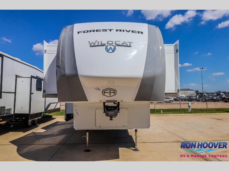 With any Wildcat fifth wheel by Forest River you will enjoy affordable luxury at every turn. These models are constructed with residential fiberglass insulation in the roof and floor, a sectioned ABS plastic underbelly armor, and a vacuum bonded, welded aluminum structure for added strength and durability. You will also find seamless roto-cast holding tanks, an outdoor shower, and 4-point auto leveling for quick and easy setup. Each model includes a best-in-class, high-efficiency 35,000 BTU furnace, along with a 18,000 BTU ducted A/C, with second and third A/C prep, plus an on-demand tankless water heater for added convenience. There are carpet-free living spaces, residential backsplash, motion lighting throughout, and many more comforts!