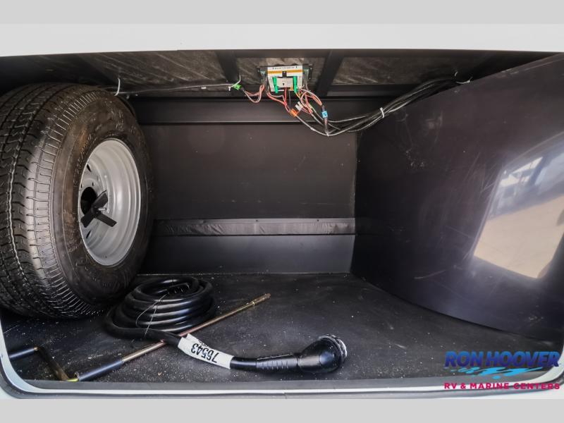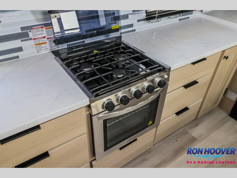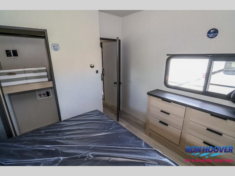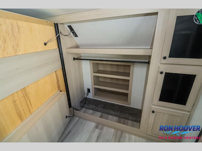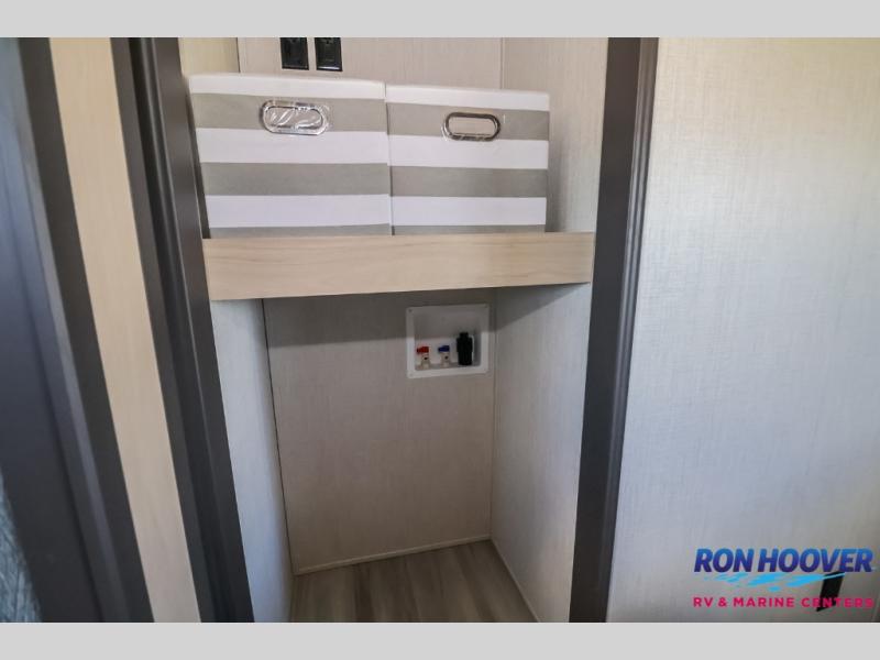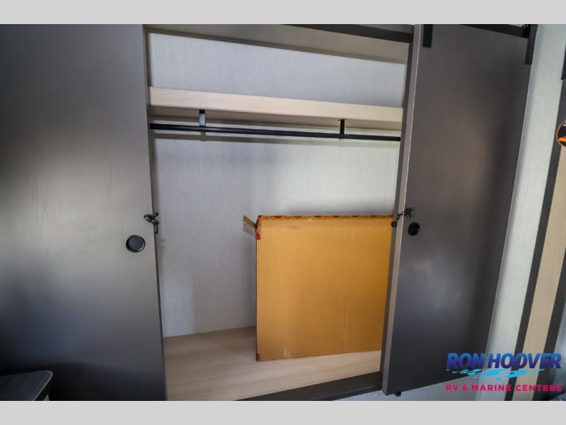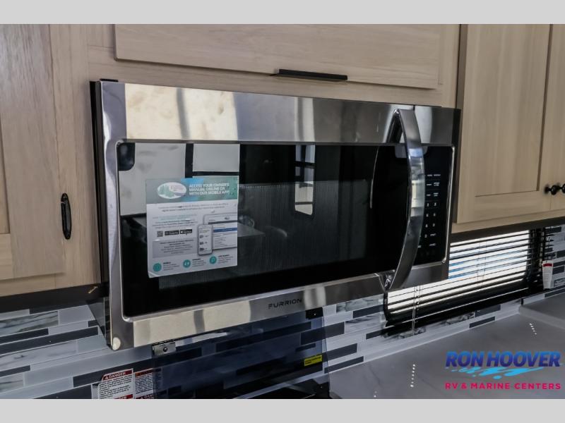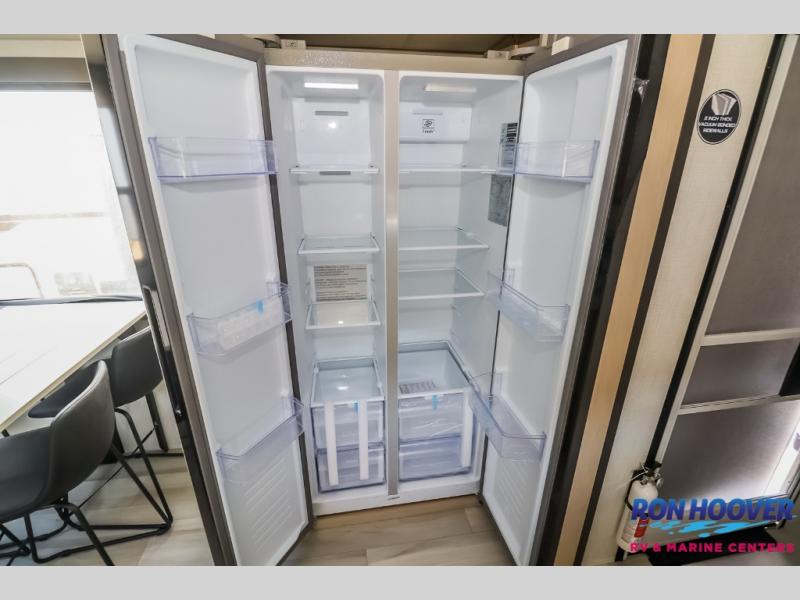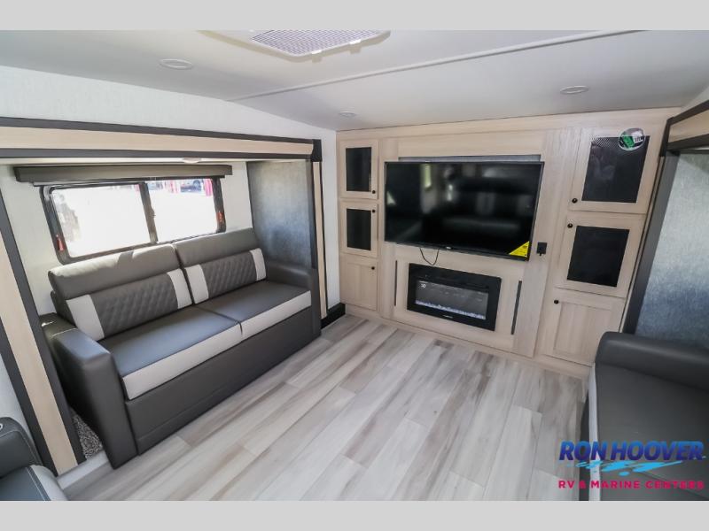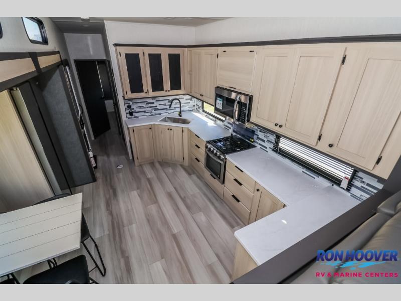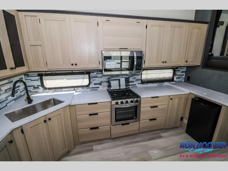 This fifth wheel is packed with features to make each trip enjoyable! The middle kitchen might be your favorite room with wrap-around counter space, a pantry, and a 16 cu. ft. 12V refrigerator for food storage. You can dine at the hi-top table and chairs here, or sit in the front living area on the dual sofas and theater seating! This area can become your guests bedroom at night since there are dual opposing slides and wardrobe storage for their things. You will also find a full-length wardrobe in the rear private bedroom, along with a king bed slide out, plus washer and dryer prep! And of course there is a full bath so everyone can stay clean each day!