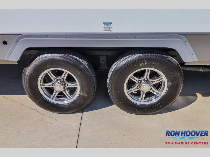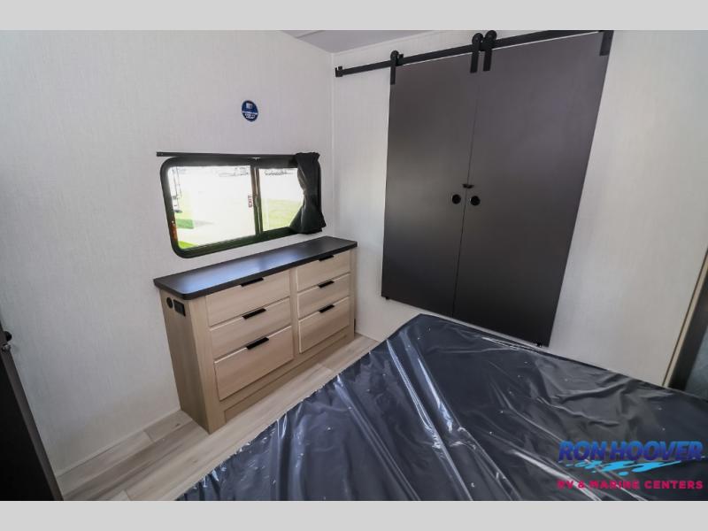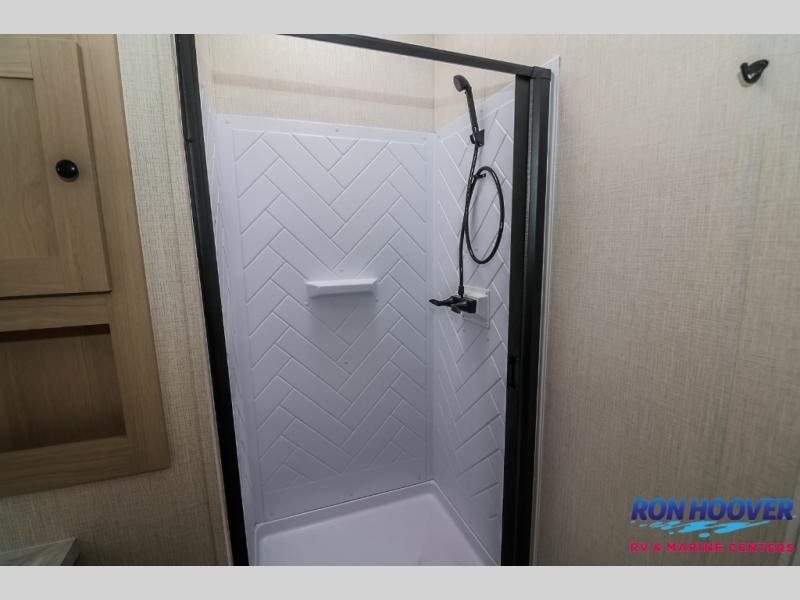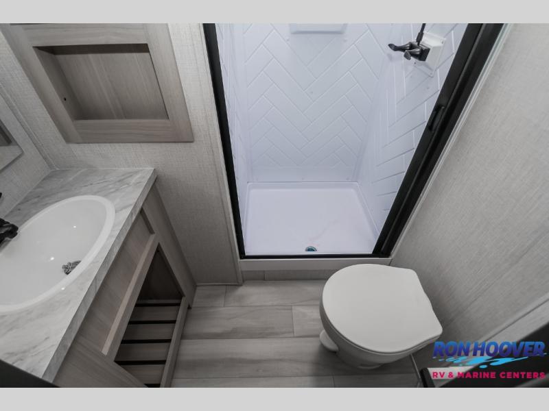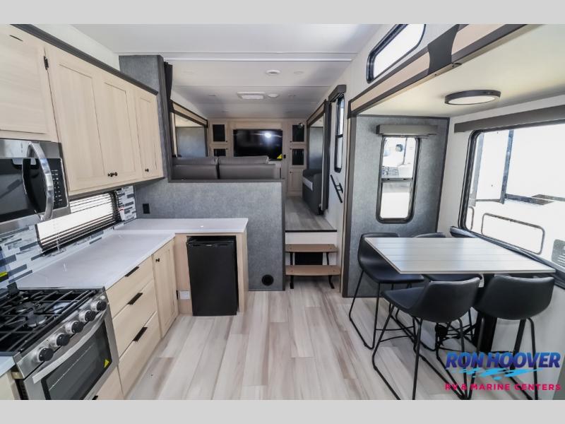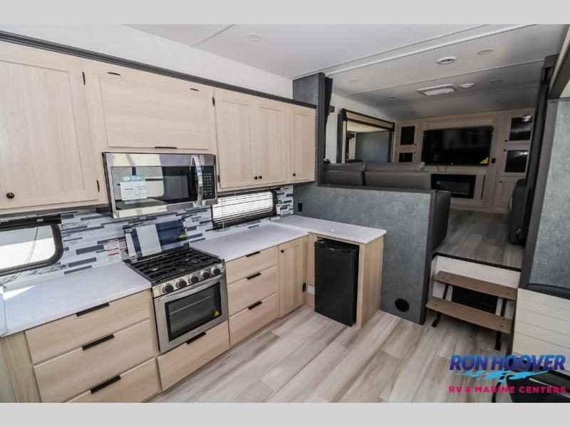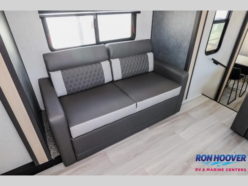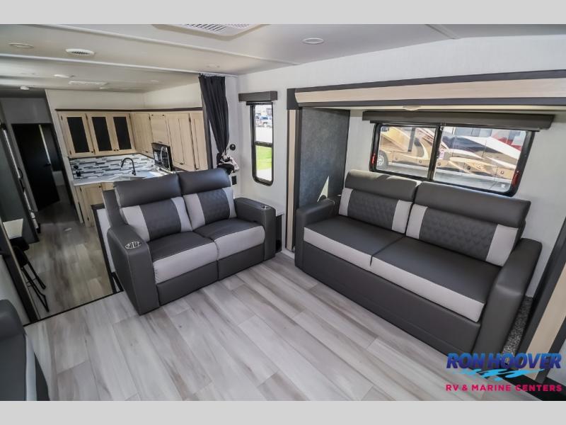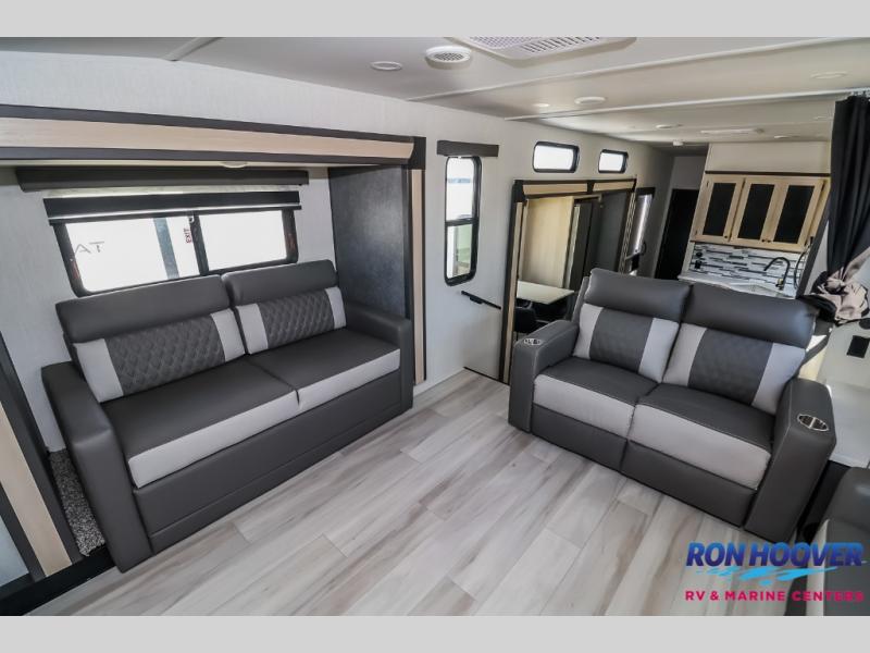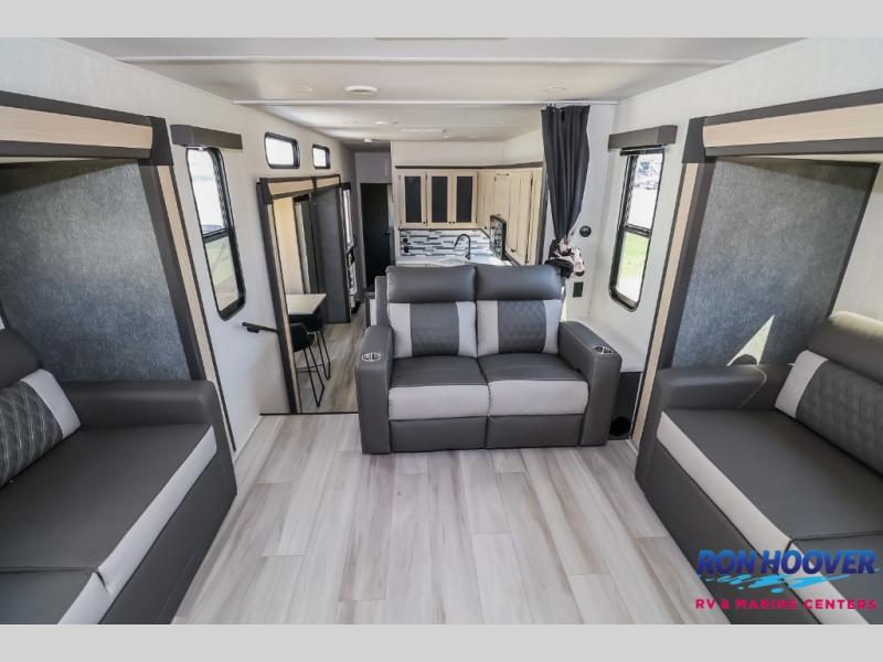 This fifth wheel is packed with features to make each trip enjoyable! The middle kitchen might be your favorite room with wrap-around counter space, a pantry, and a 16 cu. ft. 12V refrigerator for food storage. You can dine at the hi-top table and chairs here, or sit in the front living area on the dual sofas and theater seating! This area can become your guests bedroom at night since there are dual opposing slides and wardrobe storage for their things. You will also find a full-length wardrobe in the rear private bedroom, along with a king bed slide out, plus washer and dryer prep! And of course there is a full bath so everyone can stay clean each day!