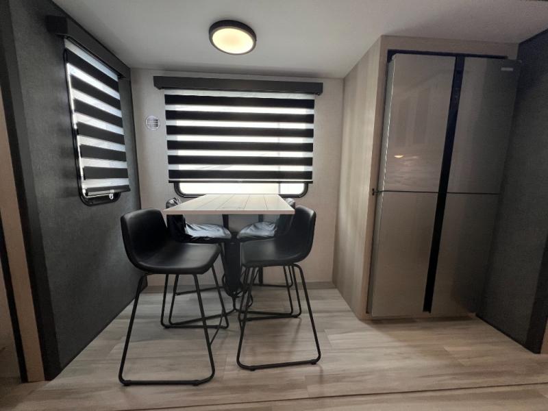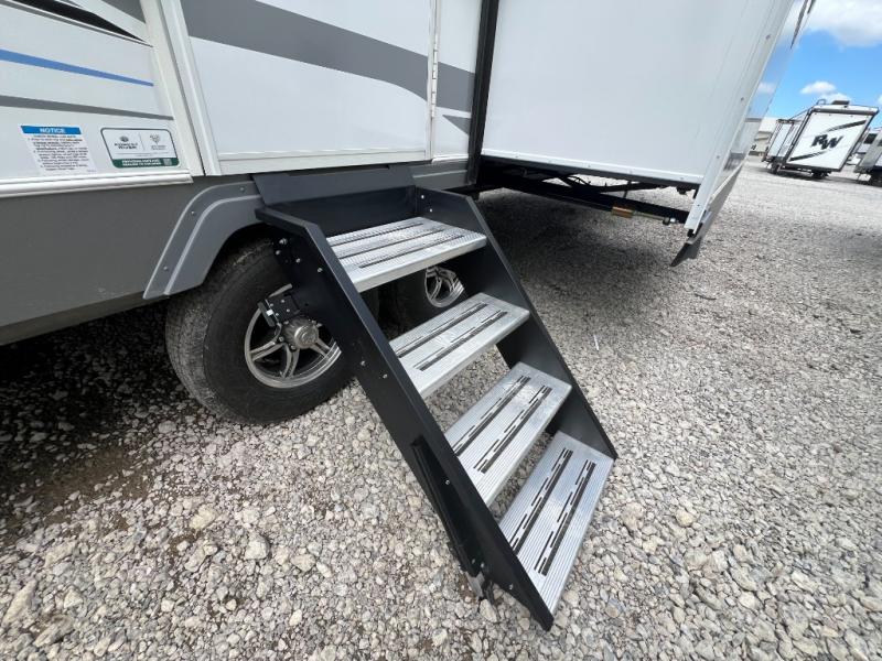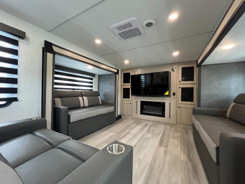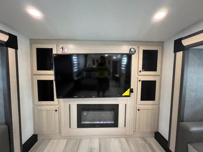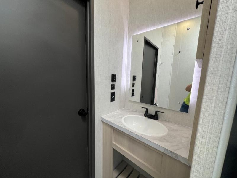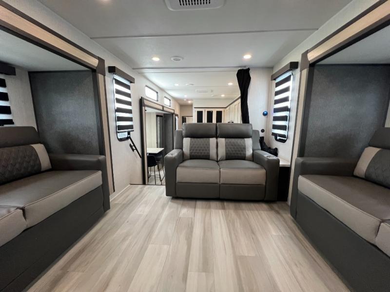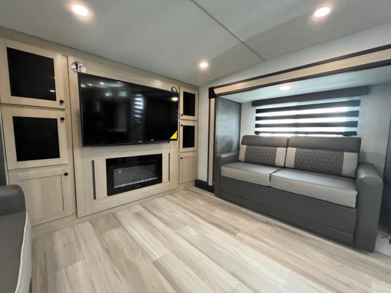 This fifth wheel is packed with features to make each trip enjoyable! The middle kitchen might be your favorite room with wrap-around counter space, a pantry, and a 16 cu. ft. 12V refrigerator for food storage. You can dine at the hi-top table and chairs here, or sit in the front living area on the dual sofas and theater seating! This area can become your guests bedroom at night since there are dual opposing slides and wardrobe storage for their things. You will also find a full-length wardrobe in the rear private bedroom, along with a king bed slide out, plus washer and dryer prep! And of course there is a full bath so everyone can stay clean each day!
