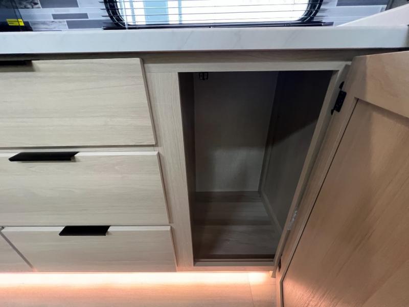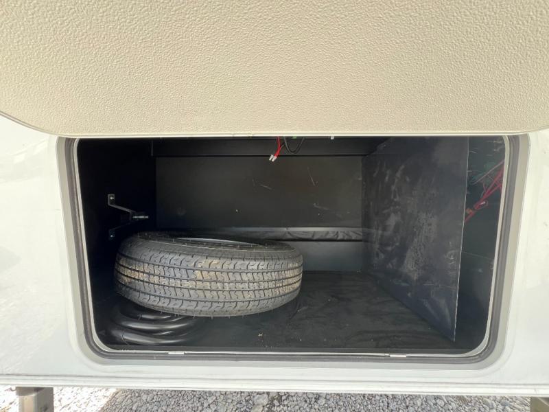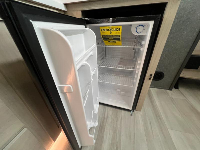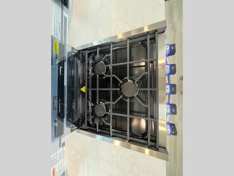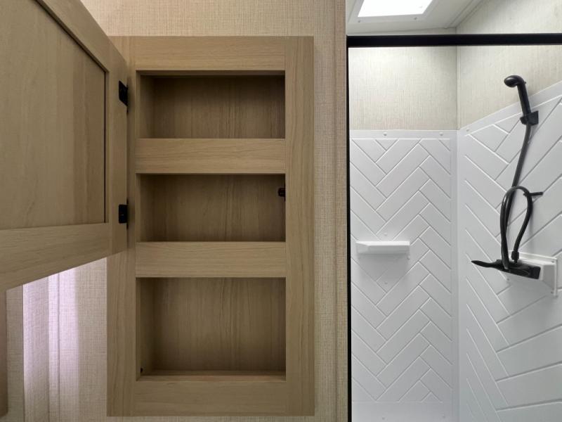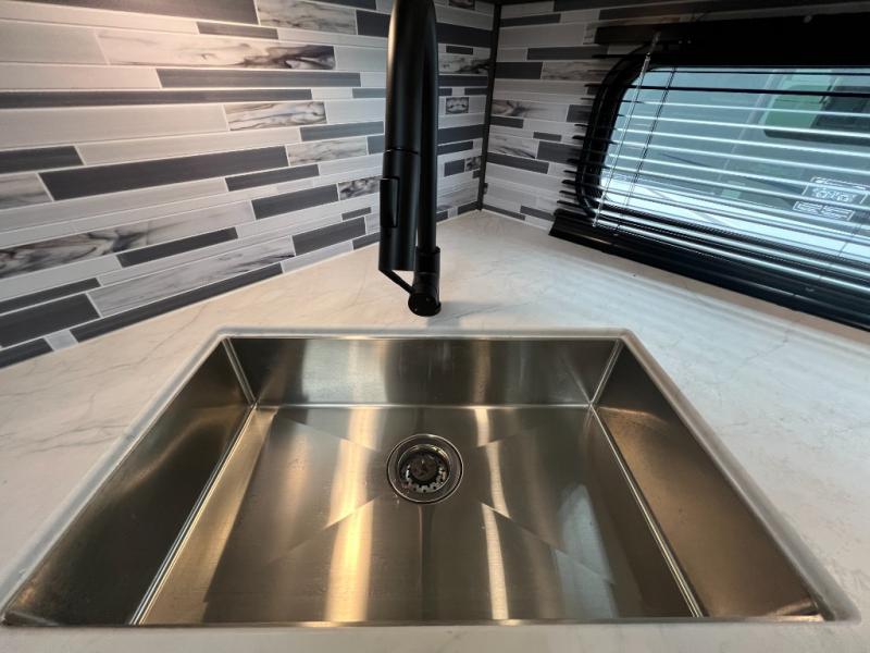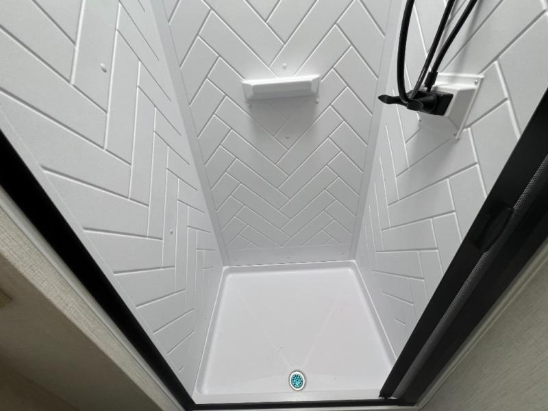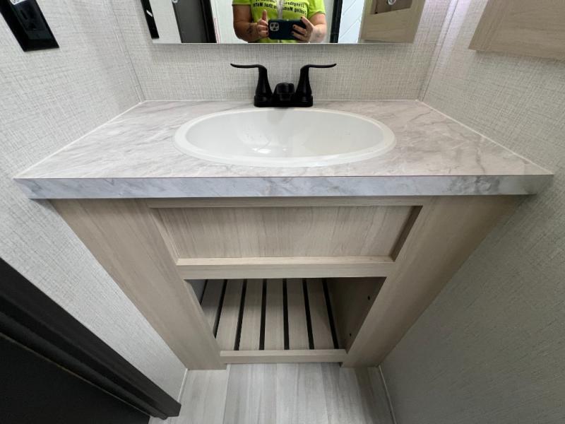 This fifth wheel is packed with features to make each trip enjoyable! The middle kitchen might be your favorite room with wrap-around counter space, a pantry, and a 16 cu. ft. 12V refrigerator for food storage. You can dine at the hi-top table and chairs here, or sit in the front living area on the dual sofas and theater seating! This area can become your guests bedroom at night since there are dual opposing slides and wardrobe storage for their things. You will also find a full-length wardrobe in the rear private bedroom, along with a king bed slide out, plus washer and dryer prep! And of course there is a full bath so everyone can stay clean each day!