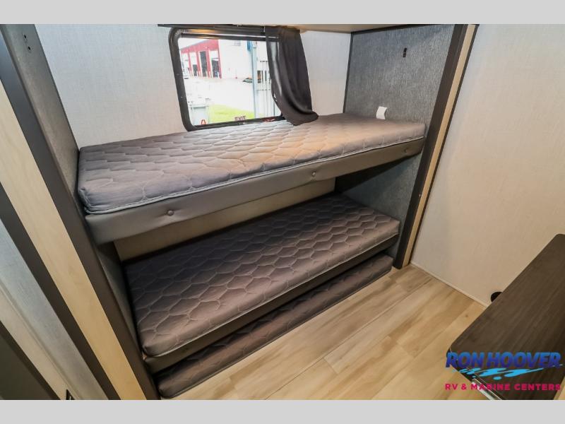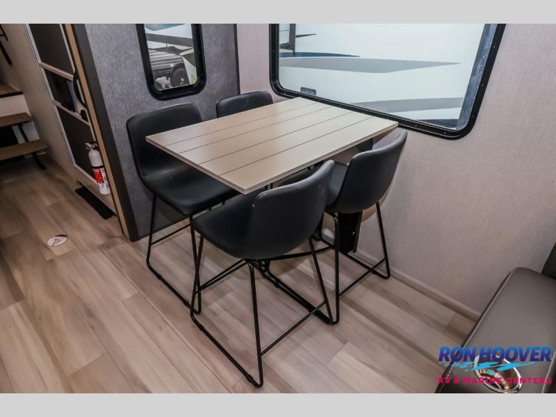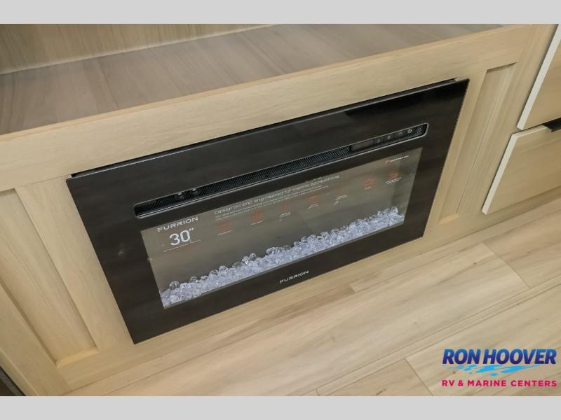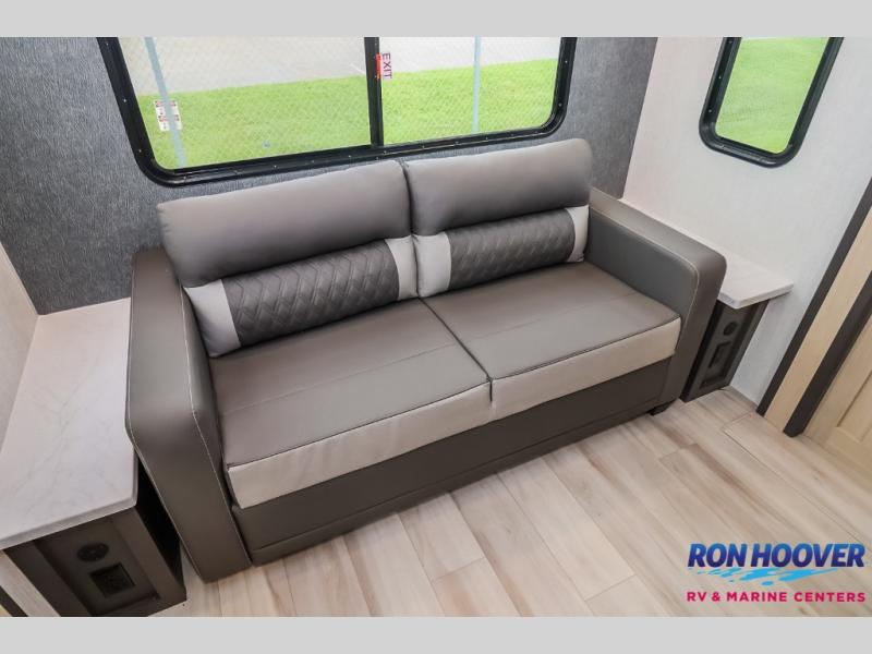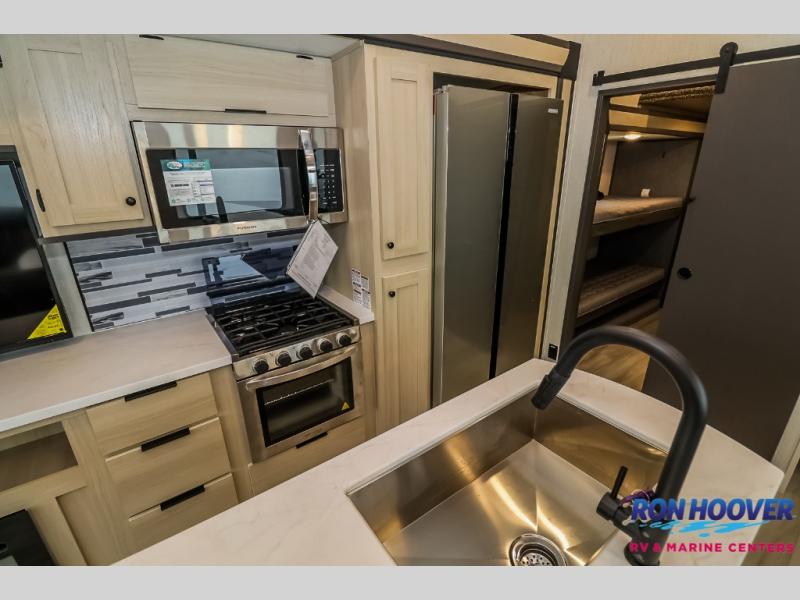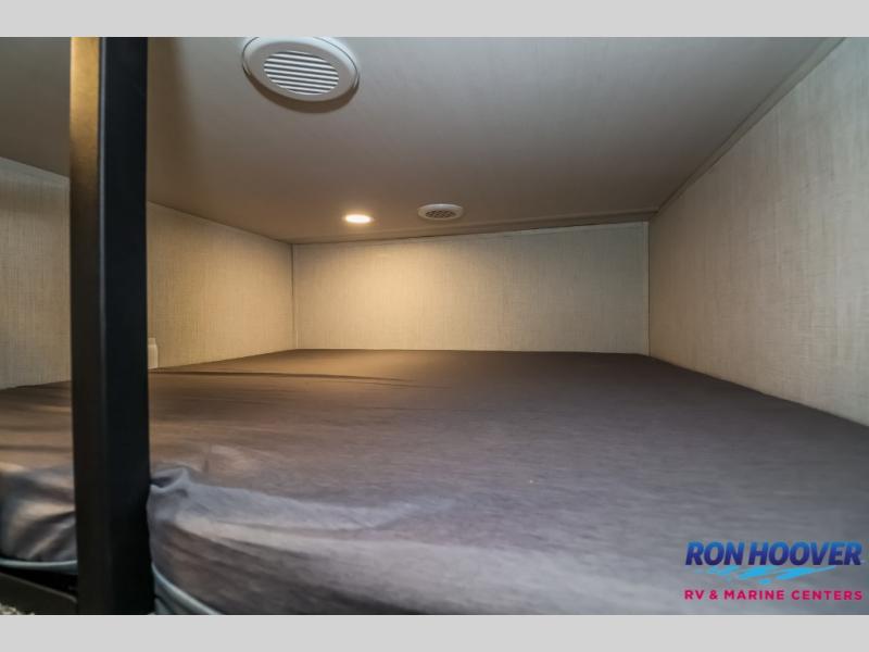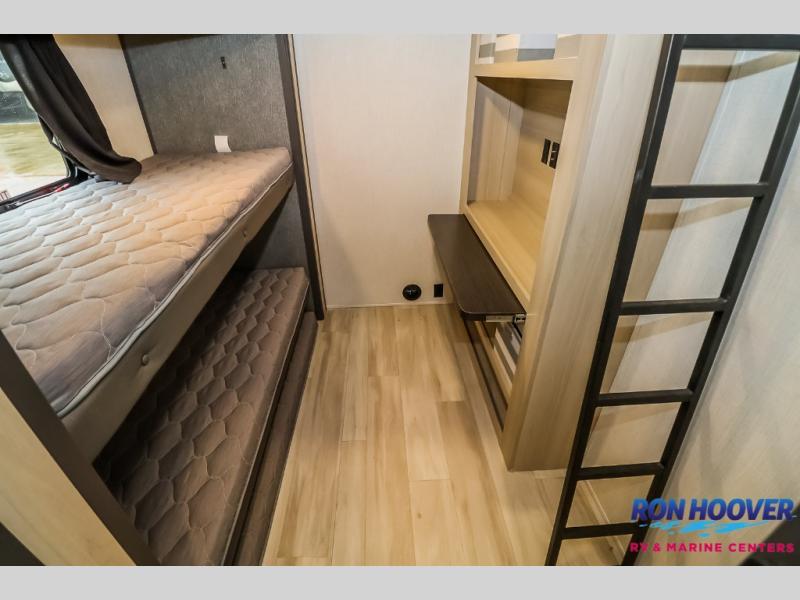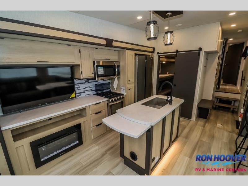 Wow! You won't believe the features found in this luxury fifth wheel that can sleep up to nine each night! Your guests or the kids will absolutely love the middle bunkroom with triple bunks and a loft above for even more sleeping or storage space. There is also a pull-out desk here, which will allow you to utilize this space as an office as well! You'll have your own space in the front private bedroom on the king bed slide out, and there is a walk-in wardrobe to keep your clothes tidy. There is even washer and dryer prep for the option to keep those clothes clean! The chef of your group will have everything they need to prepare meals, including a 21" 2-in-1 oven range, an over-the-range microwave, a 16 cu. ft. 12V refrigerator, plus a kitchen island for more counter space. In the evenings, your crew can get cozy on the rear sofa and theater seats across from the entertainment center and fireplace, or you might just play a game at the hi-top table and chairs!
