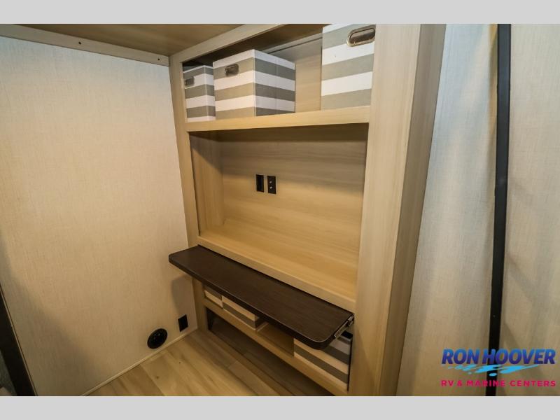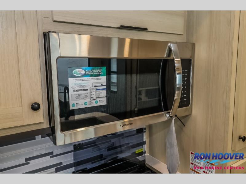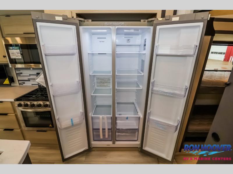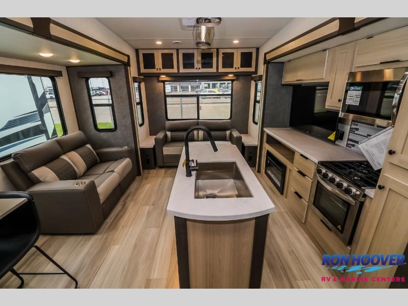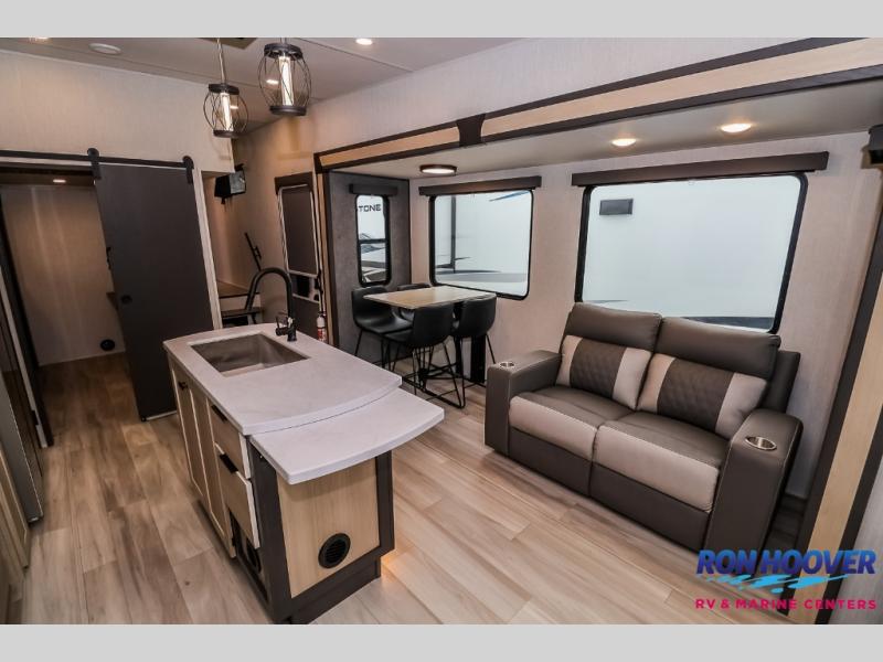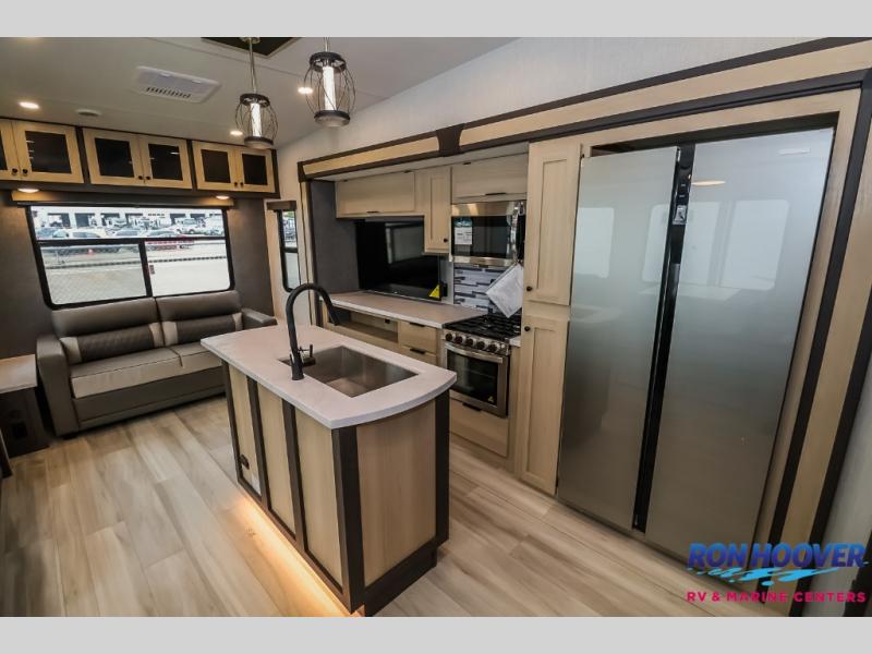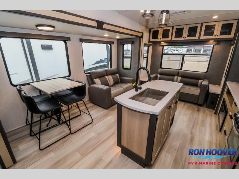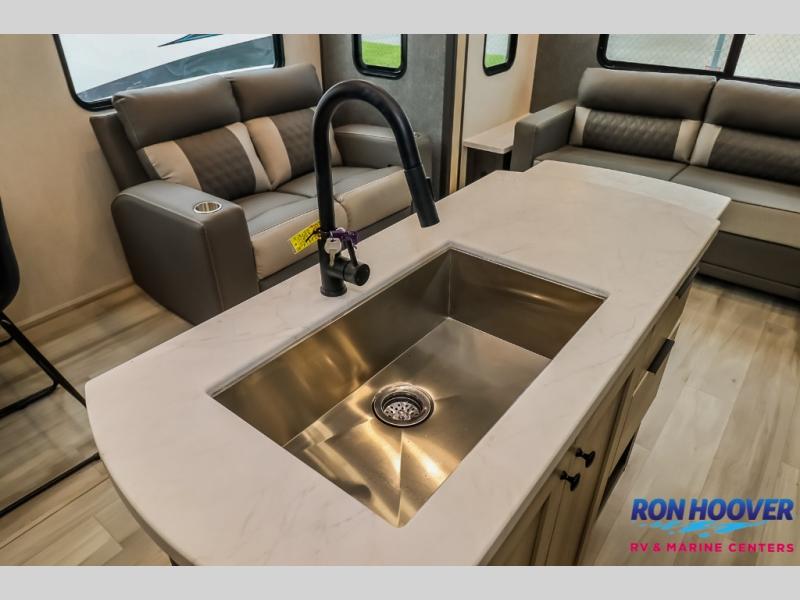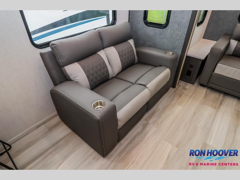Wow! You won't believe the features found in this luxury fifth wheel that can sleep up to nine each night! Your guests or the kids will absolutely love the middle bunkroom with triple bunks and a loft above for even more sleeping or storage space. There is also a pull-out desk here, which will allow you to utilize this space as an office as well! You'll have your own space in the front private bedroom on the king bed slide out, and there is a walk-in wardrobe to keep your clothes tidy. There is even washer and dryer prep for the option to keep those clothes clean! The chef of your group will have everything they need to prepare meals, including a 21" 2-in-1 oven range, an over-the-range microwave, a 16 cu. ft. 12V refrigerator, plus a kitchen island for more counter space. In the evenings, your crew can get cozy on the rear sofa and theater seats across from the entertainment center and fireplace, or you might just play a game at the hi-top table and chairs!