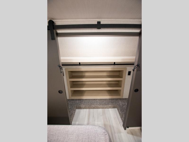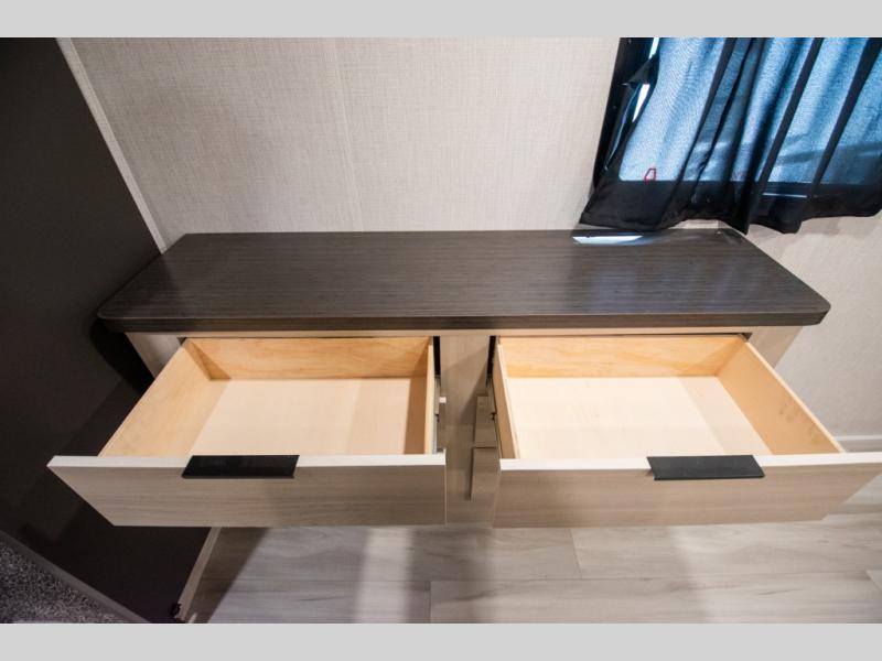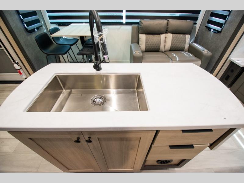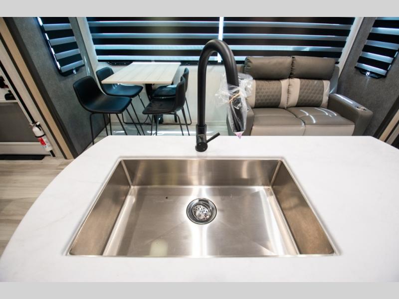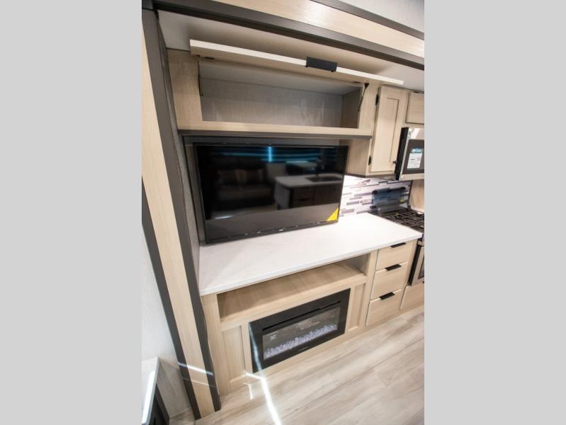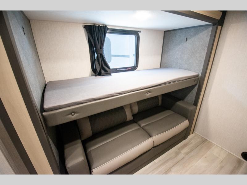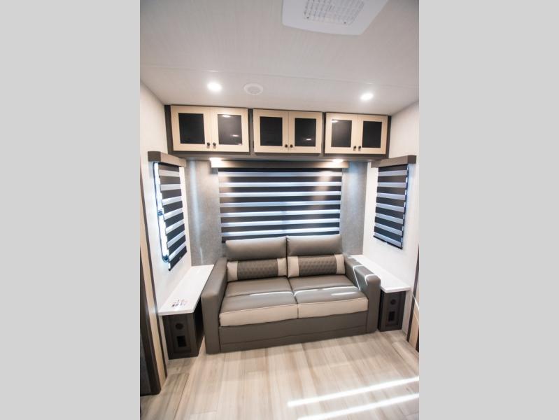 Wow! You won't believe the features found in this luxury fifth wheel that can sleep up to nine each night! Your guests or the kids will absolutely love the middle bunkroom with triple bunks and a loft above for even more sleeping or storage space. There is also a pull-out desk here, which will allow you to utilize this space as an office as well! You'll have your own space in the front private bedroom on the king bed slide out, and there is a walk-in wardrobe to keep your clothes tidy. There is even washer and dryer prep for the option to keep those clothes clean! The chef of your group will have everything they need to prepare meals, including a 21" 2-in-1 oven range, an over-the-range microwave, a 16 cu. ft. 12V refrigerator, plus a kitchen island for more counter space. In the evenings, your crew can get cozy on the rear sofa and theater seats across from the entertainment center and fireplace, or you might just play a game at the hi-top table and chairs!