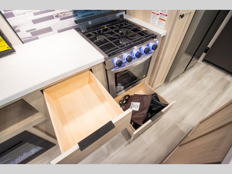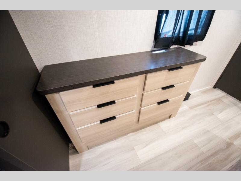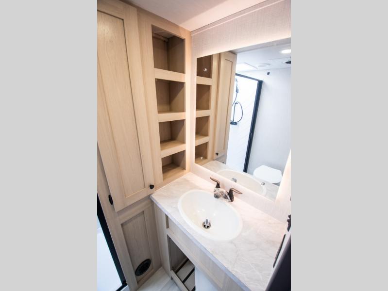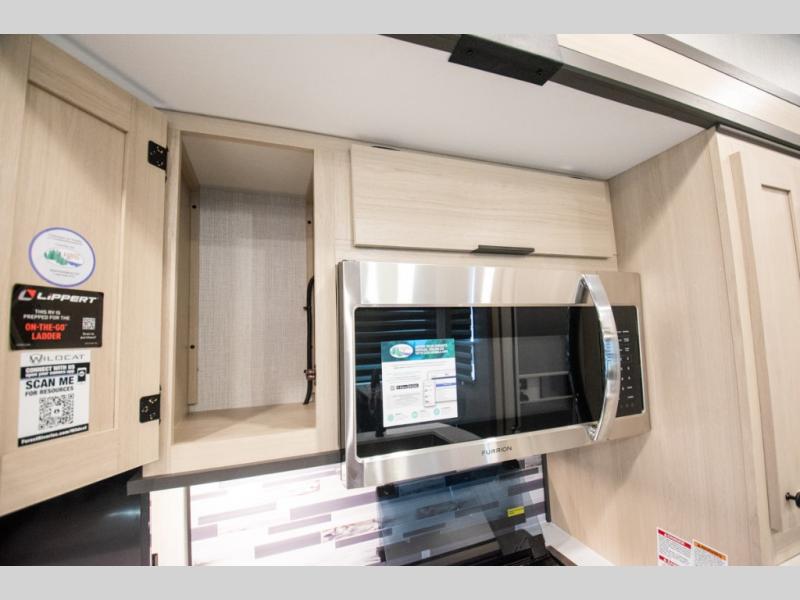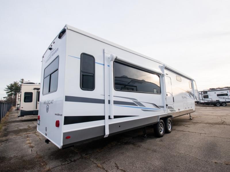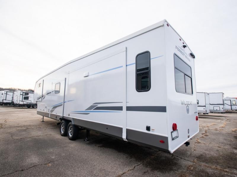 With any Wildcat fifth wheel by Forest River you will enjoy affordable luxury at every turn. These models are constructed with residential fiberglass insulation in the roof and floor, a sectioned ABS plastic underbelly armor, and a vacuum bonded, welded aluminum structure for added strength and durability. You will also find seamless roto-cast holding tanks, an outdoor shower, and 4-point auto leveling for quick and easy setup. Each model includes a best-in-class, high-efficiency 35,000 BTU furnace, along with a 13,500 BTU ducted A/C, with second and third A/C prep, plus an on-demand tankless water heater for added convenience. There are carpet-free living spaces, residential backsplash, motion lighting throughout, and many more comforts!