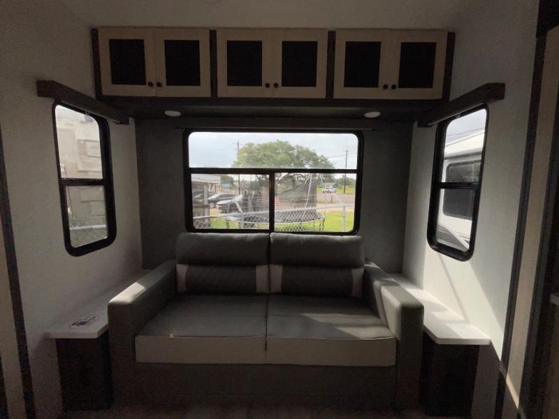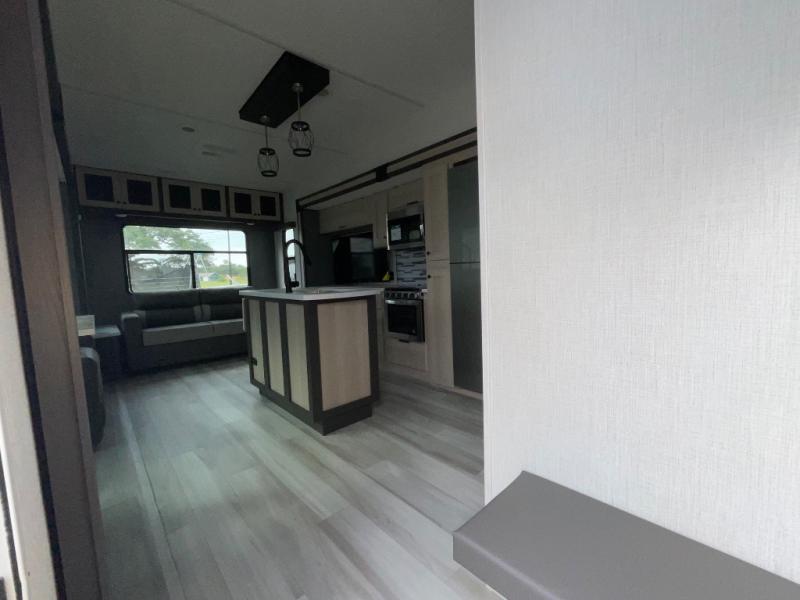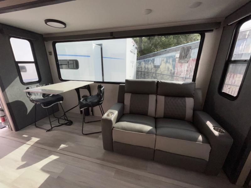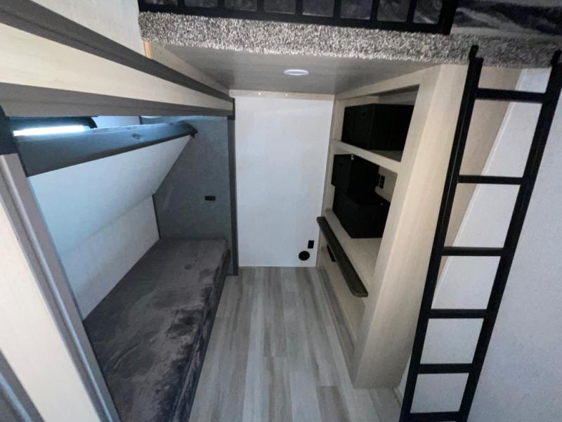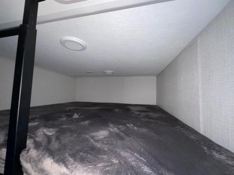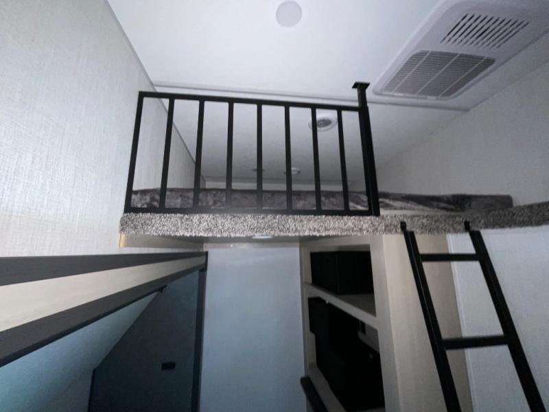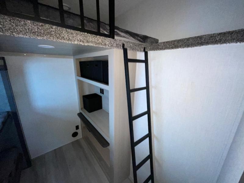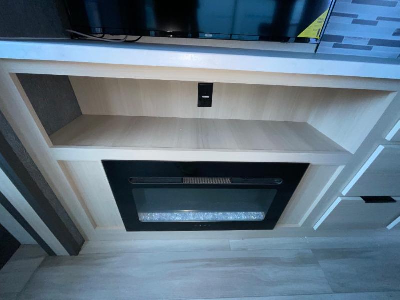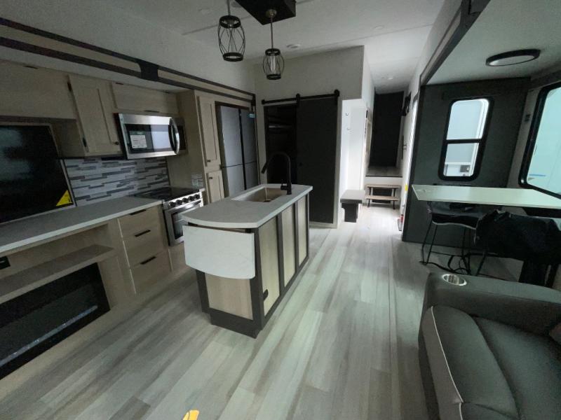 Wow! You won't believe the features found in this luxury fifth wheel that can sleep up to nine each night! Your guests or the kids will absolutely love the middle bunkroom with triple bunks and a loft above for even more sleeping or storage space. There is also a pull-out desk here, which will allow you to utilize this space as an office as well! You'll have your own space in the front private bedroom on the king bed slide out, and there is a walk-in wardrobe to keep your clothes tidy. There is even washer and dryer prep for the option to keep those clothes clean! The chef of your group will have everything they need to prepare meals, including a 21" 2-in-1 oven range, an over-the-range microwave, a 16 cu. ft. 12V refrigerator, plus a kitchen island for more counter space. In the evenings, your crew can get cozy on the rear sofa and theater seats across from the entertainment center and fireplace, or you might just play a game at the hi-top table and chairs!