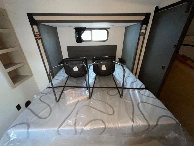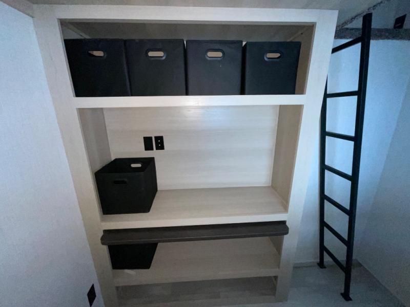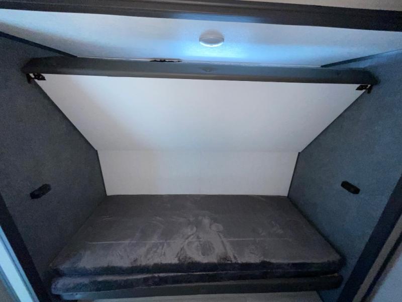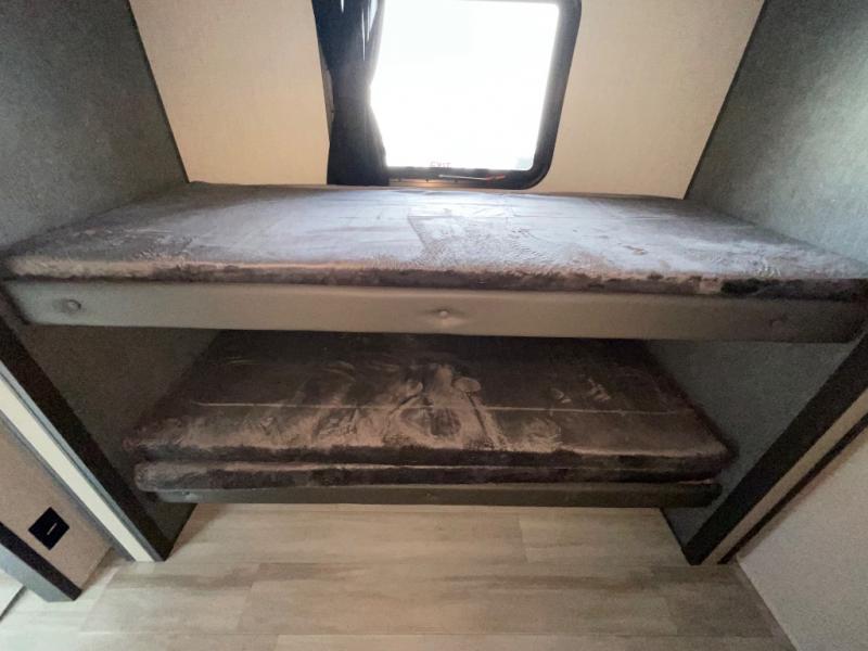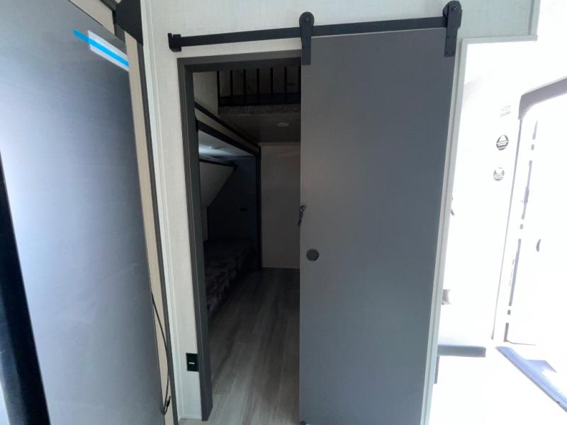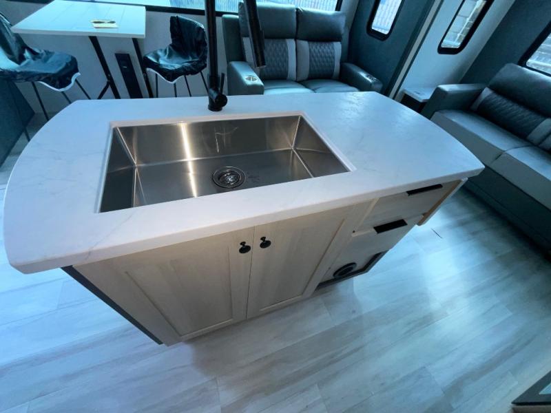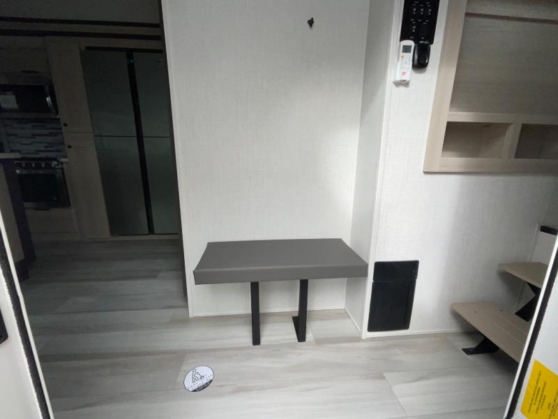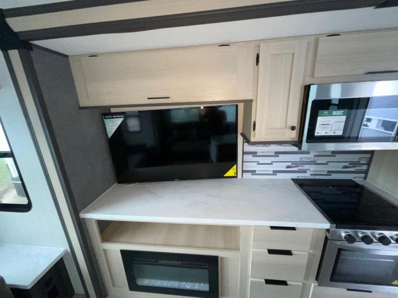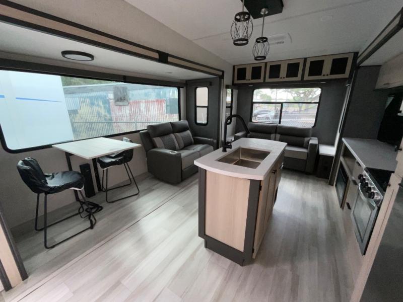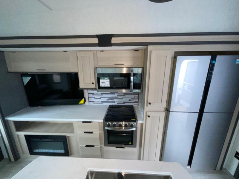 Wow! You won't believe the features found in this luxury fifth wheel that can sleep up to nine each night! Your guests or the kids will absolutely love the middle bunkroom with triple bunks and a loft above for even more sleeping or storage space. There is also a pull-out desk here, which will allow you to utilize this space as an office as well! You'll have your own space in the front private bedroom on the king bed slide out, and there is a walk-in wardrobe to keep your clothes tidy. There is even washer and dryer prep for the option to keep those clothes clean! The chef of your group will have everything they need to prepare meals, including a 21" 2-in-1 oven range, an over-the-range microwave, a 16 cu. ft. 12V refrigerator, plus a kitchen island for more counter space. In the evenings, your crew can get cozy on the rear sofa and theater seats across from the entertainment center and fireplace, or you might just play a game at the hi-top table and chairs!