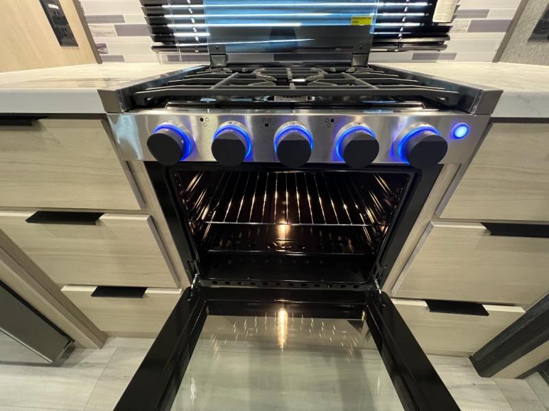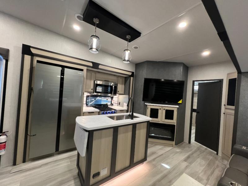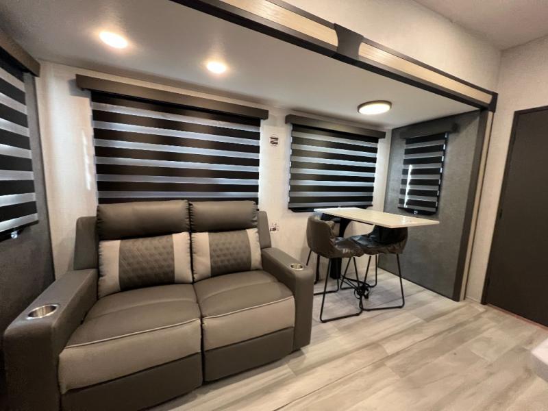 This fifth wheel's name describes it perfectly; it's the best! Your guests will love the rear private bunkhouse with dual opposing slides, bunk beds, plus a hide-a-bed sofa and an entertainment center with dual wardrobes. There is even a half bath with its own exterior entry door! You will have the front private bedroom all to yourselves with a king bed slide out and a walk-in wardrobe with washer and dryer prep. And the full bath is close by for easy nighttime use. The combined middle kitchen and living room will be a space everyone can meet in since there is a hi-top table and chairs and theater seating, an entertainment center with a fireplace, plus a kitchen island where snacks can be set out.