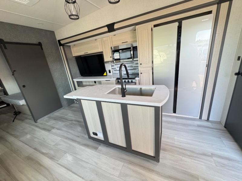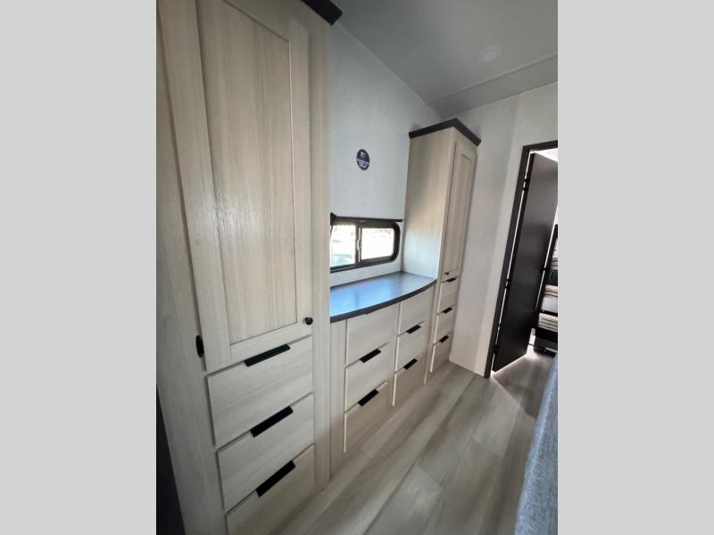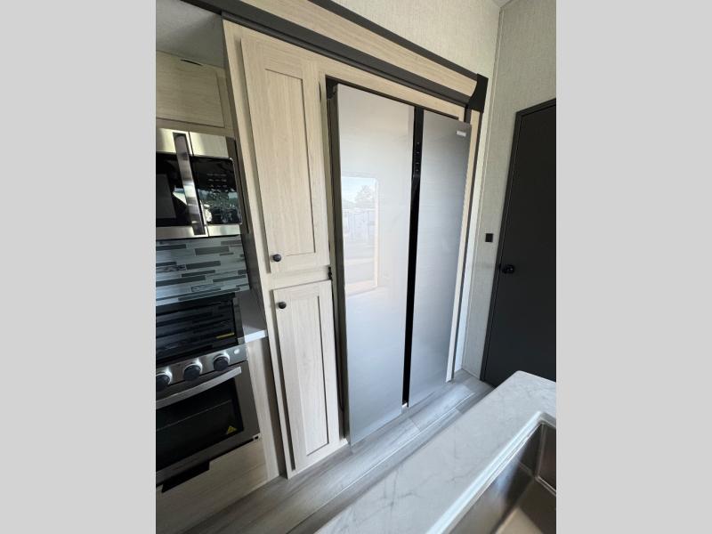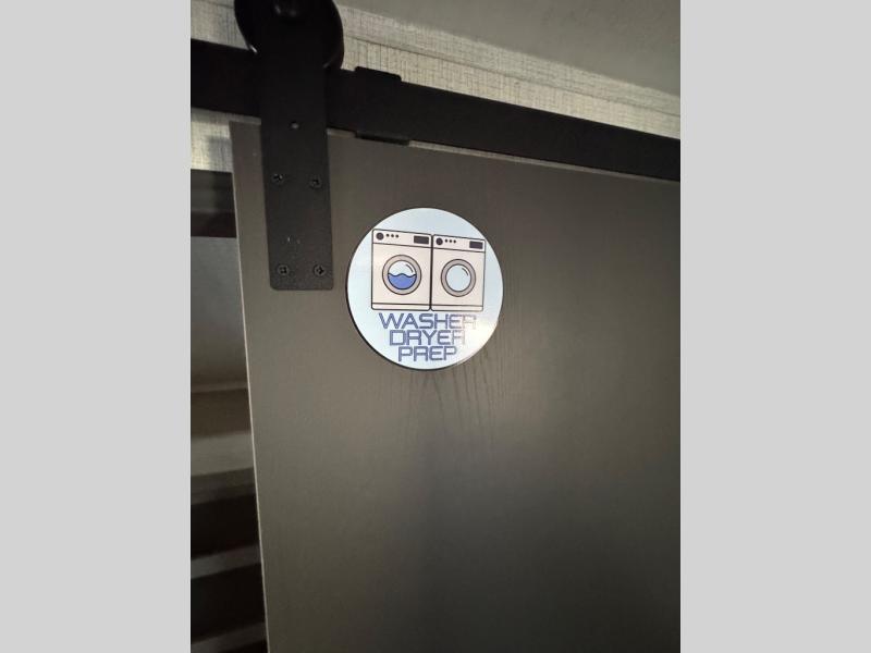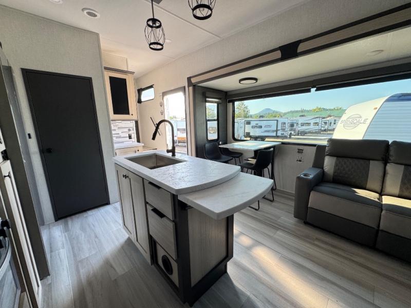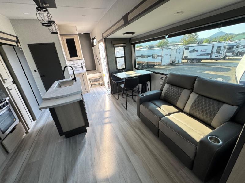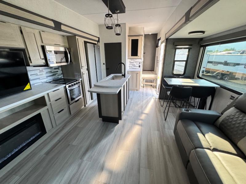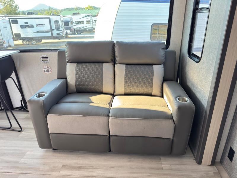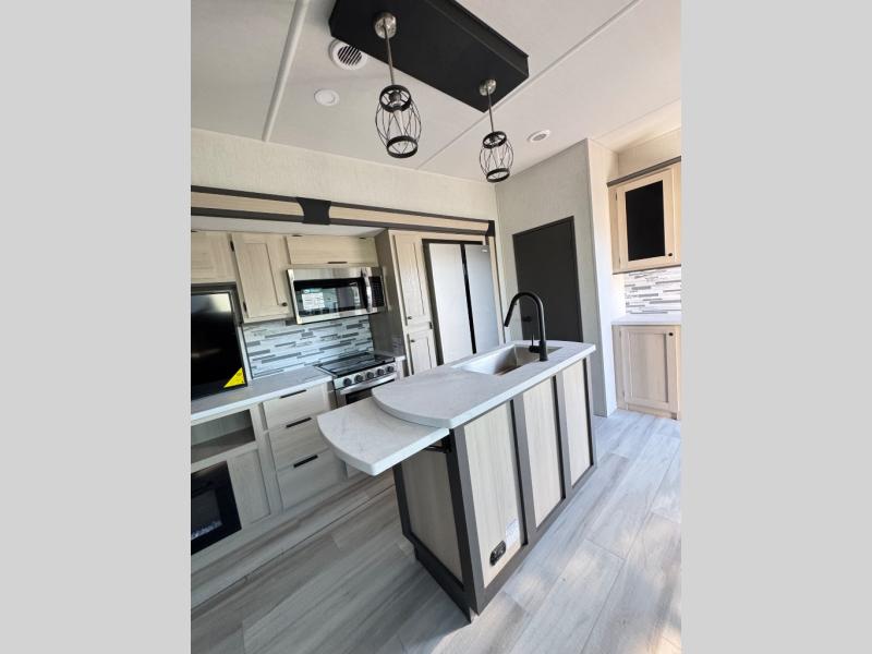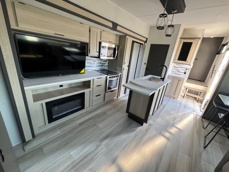 With two full baths, two bedrooms, and two entry doors, this fifth wheel is packed with comfort! The front bedroom includes a queen bed slide out, dresser, and front walk-in wardrobe with washer and dryer prep. And there is a full bath close by for easy access. You'll find another queen bed slide in the rear master bedroom, along with dual wardrobes and a dresser, plus a full rear bath with its own exterior entry door. In the morning, everyone can meet in the middle kitchen and living room while the chef prepares breakfast with the 21" 2-in-1 oven. There is a hi-top table and chairs for dining, theater seating for relaxing, and a flip-up counter at the island for even more counter space. You can set up your Keurig machine at the coffee bar, and the two pantries plus 16 cu. ft. 12V refrigerator will allow you to keep food stocked!