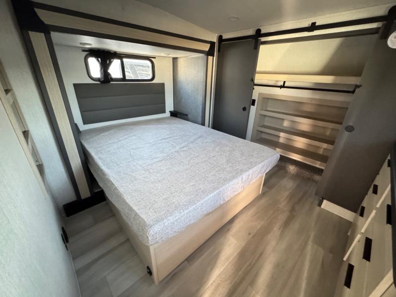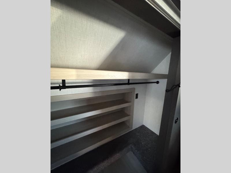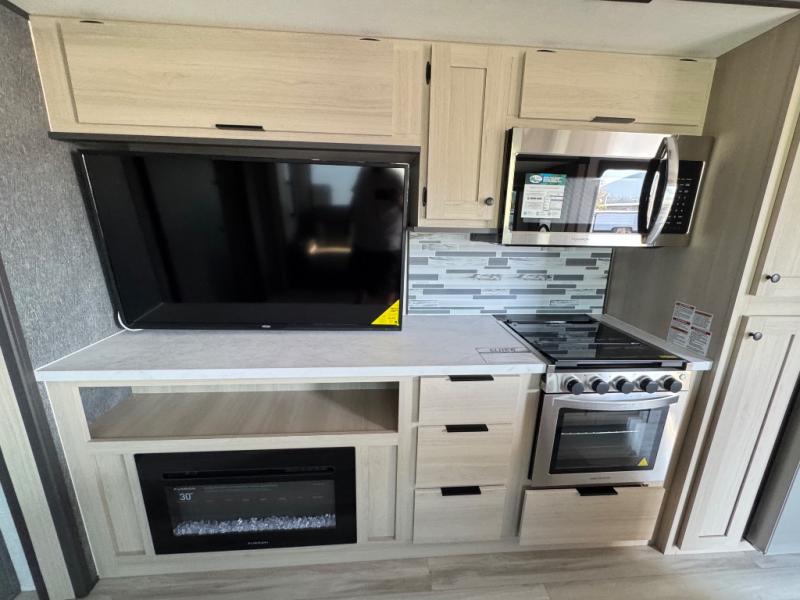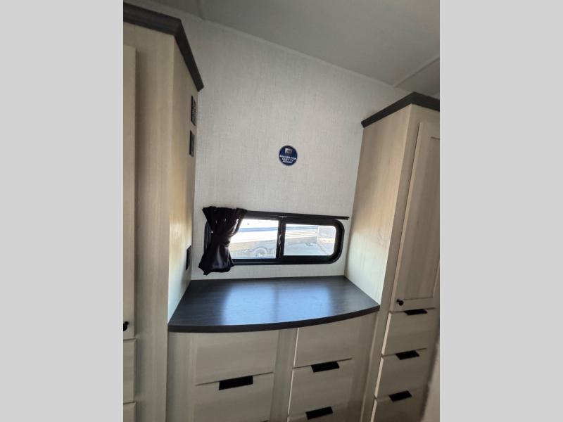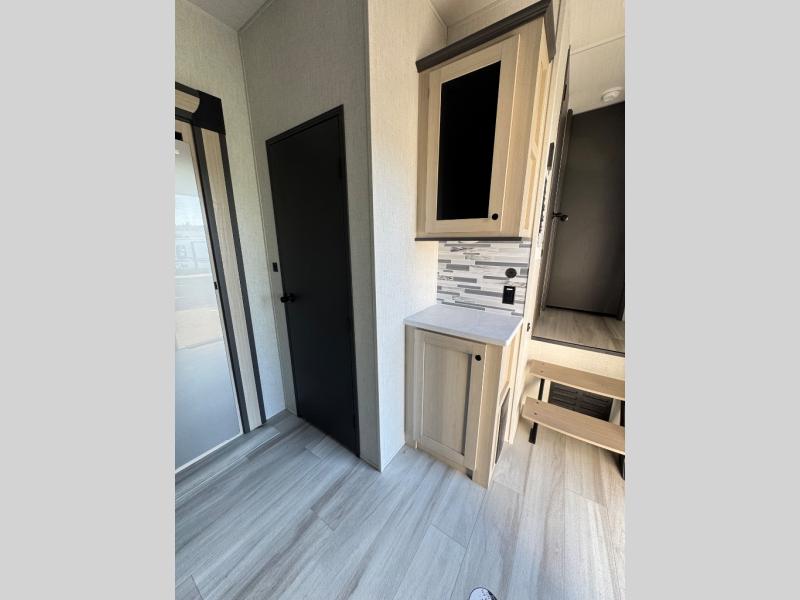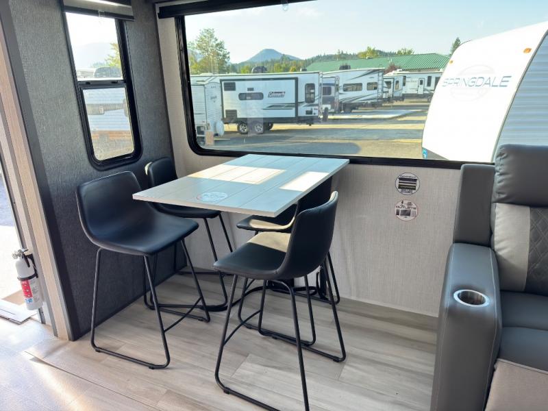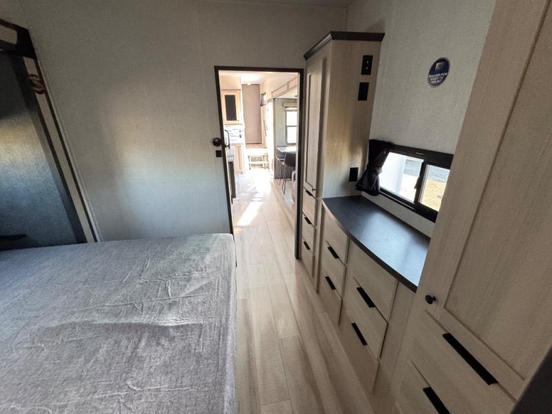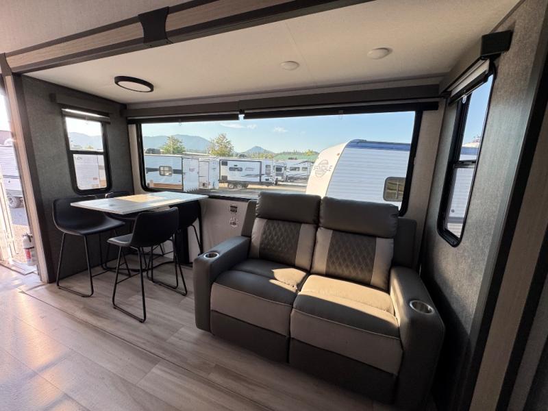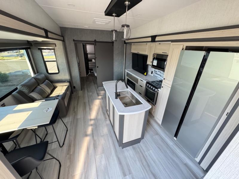 With two full baths, two bedrooms, and two entry doors, this fifth wheel is packed with comfort! The front bedroom includes a queen bed slide out, dresser, and front walk-in wardrobe with washer and dryer prep. And there is a full bath close by for easy access. You'll find another queen bed slide in the rear master bedroom, along with dual wardrobes and a dresser, plus a full rear bath with its own exterior entry door. In the morning, everyone can meet in the middle kitchen and living room while the chef prepares breakfast with the 21" 2-in-1 oven. There is a hi-top table and chairs for dining, theater seating for relaxing, and a flip-up counter at the island for even more counter space. You can set up your Keurig machine at the coffee bar, and the two pantries plus 16 cu. ft. 12V refrigerator will allow you to keep food stocked!