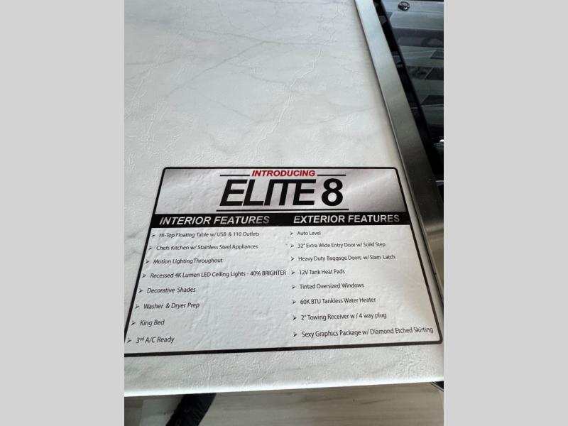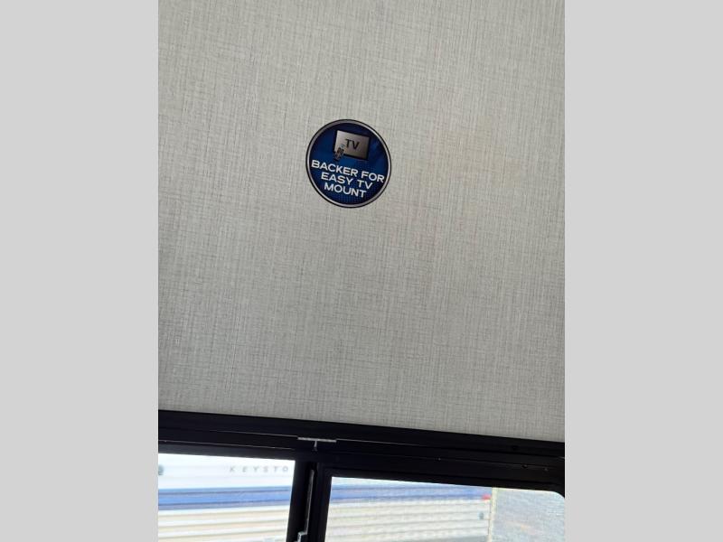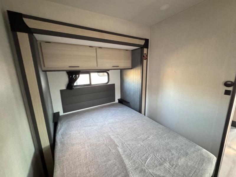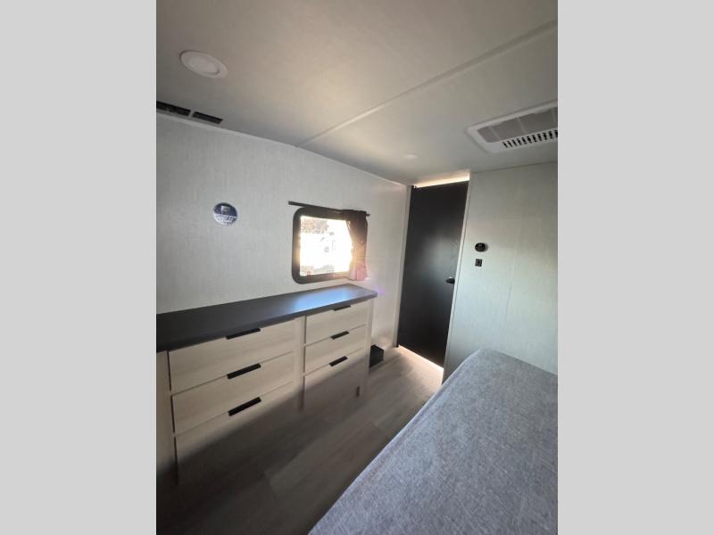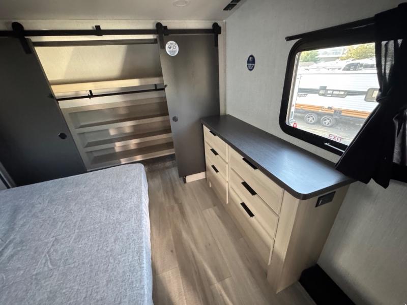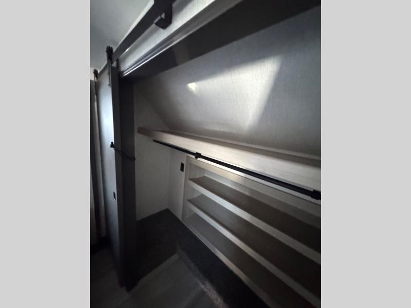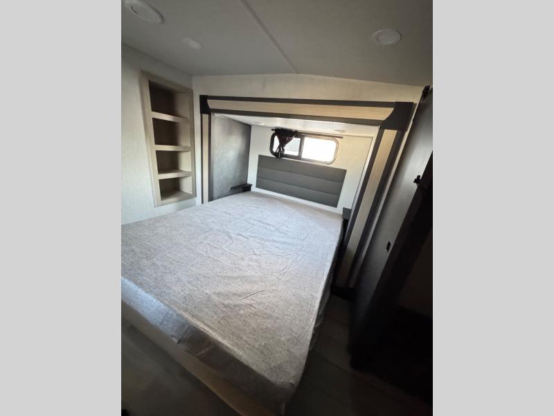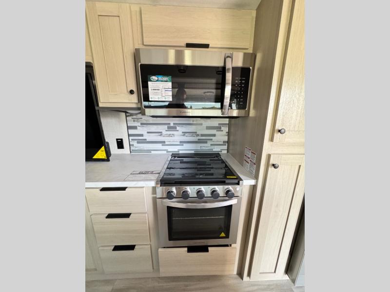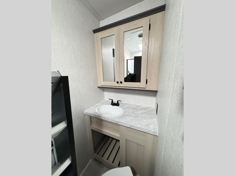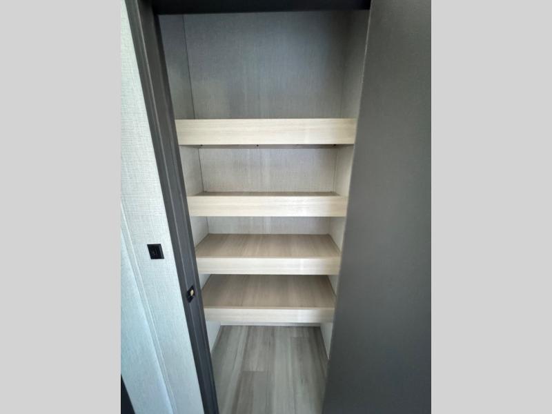With two full baths, two bedrooms, and two entry doors, this fifth wheel is packed with comfort! The front bedroom includes a queen bed slide out, dresser, and front walk-in wardrobe with washer and dryer prep. And there is a full bath close by for easy access. You'll find another queen bed slide in the rear master bedroom, along with dual wardrobes and a dresser, plus a full rear bath with its own exterior entry door. In the morning, everyone can meet in the middle kitchen and living room while the chef prepares breakfast with the 21" 2-in-1 oven. There is a hi-top table and chairs for dining, theater seating for relaxing, and a flip-up counter at the island for even more counter space. You can set up your Keurig machine at the coffee bar, and the two pantries plus 16 cu. ft. 12V refrigerator will allow you to keep food stocked!