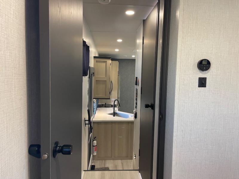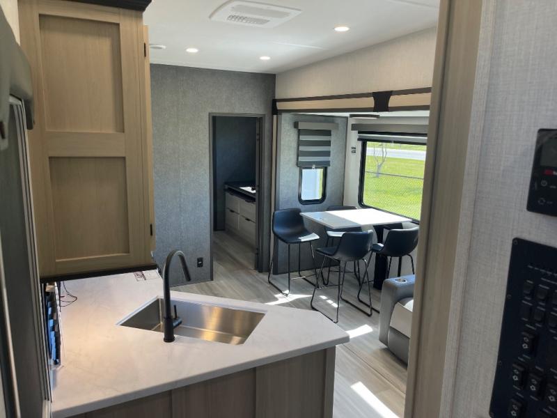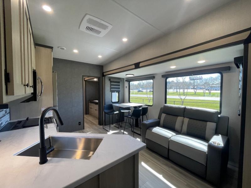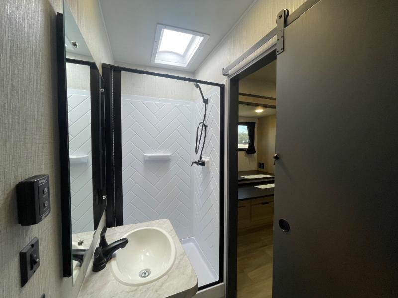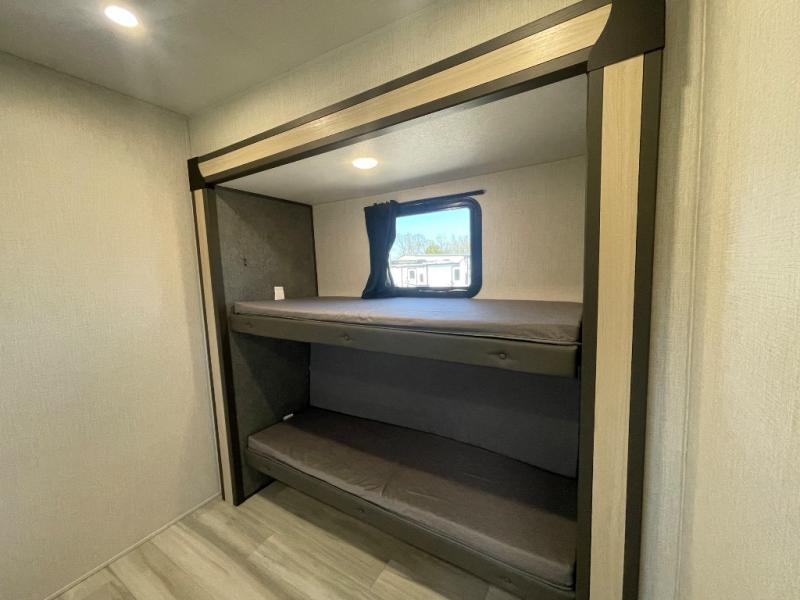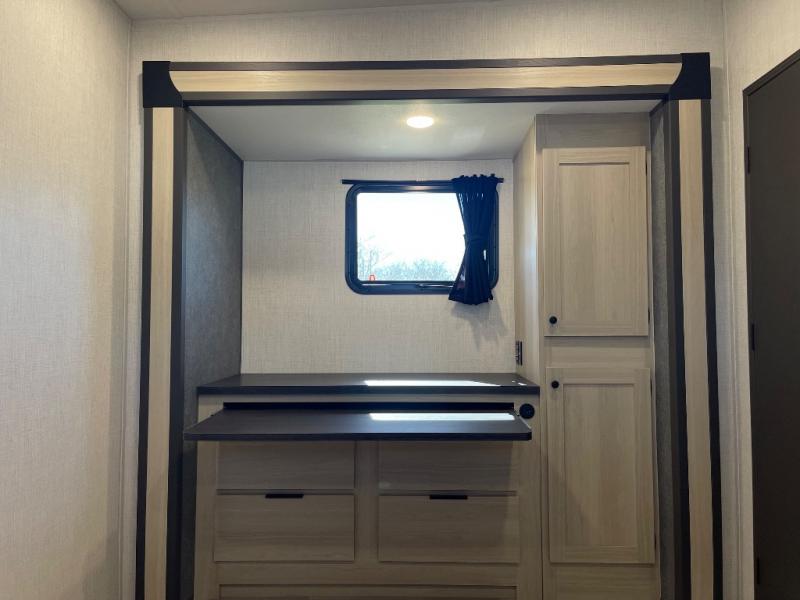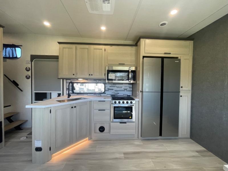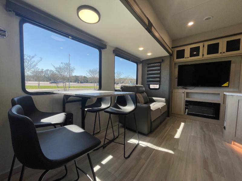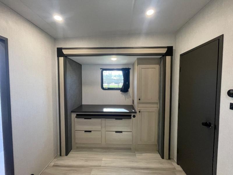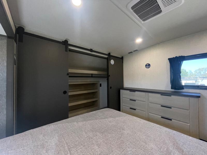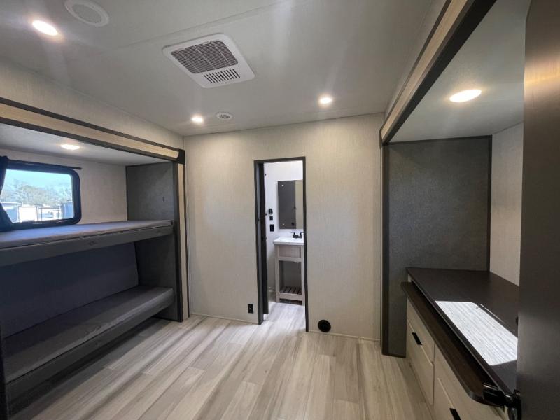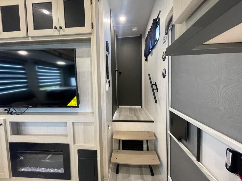 With two full baths, a master bunkhouse/office, and two entry doors, this fifth is a dream! The front bedroom includes a king bed slide out, dresser, and front walk-in wardrobe with washer and dryer prep. And there is a full bath close by for easy access. The rear bunkhouse includes triple bunks, dual opposing slides, a pull-out desktop, and a full rear bath with its own exterior entry door for convenience. In the morning, everyone can meet in the middle kitchen and living room while the chef prepares breakfast with the 21" 2-in-1 oven. There is a hi-top table and chairs for dining, theater seating for relaxing, plus a pantry and 16 cu. ft. 12V refrigerator for food storage.